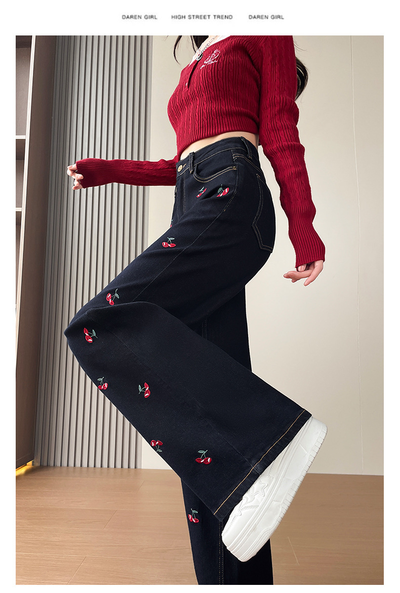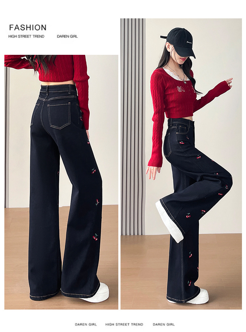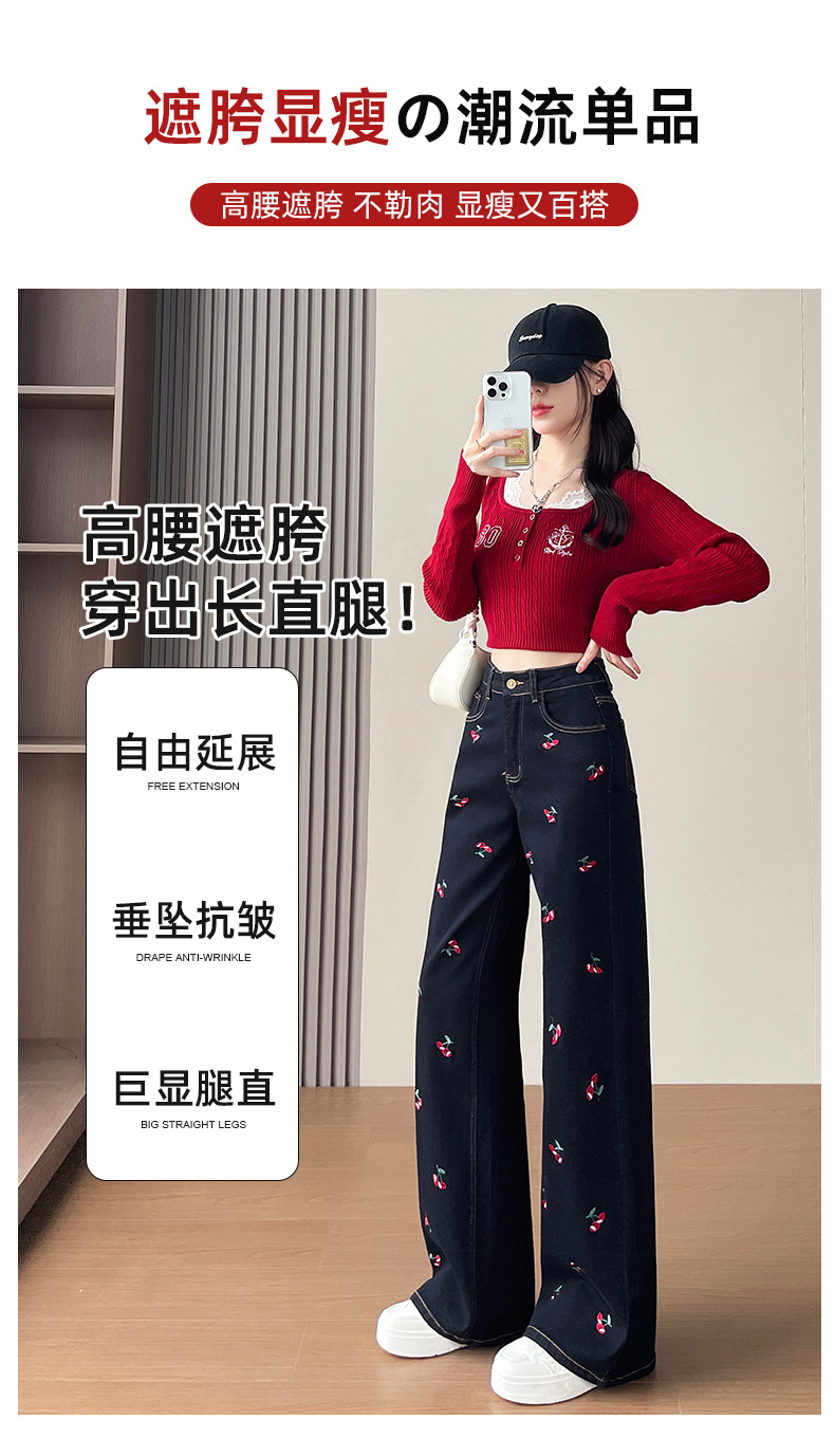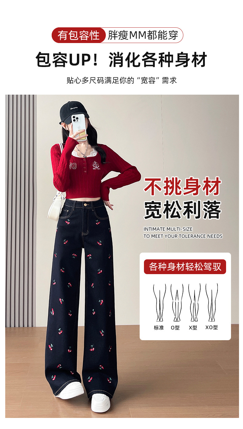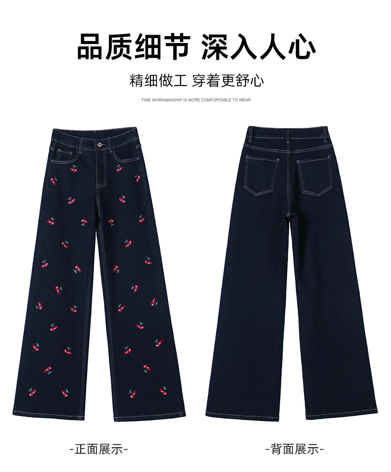 百媚生 刺绣阔腿牛仔裤女秋季高腰设计感樱桃绣花直筒裤子QYL-2237 商品图0
