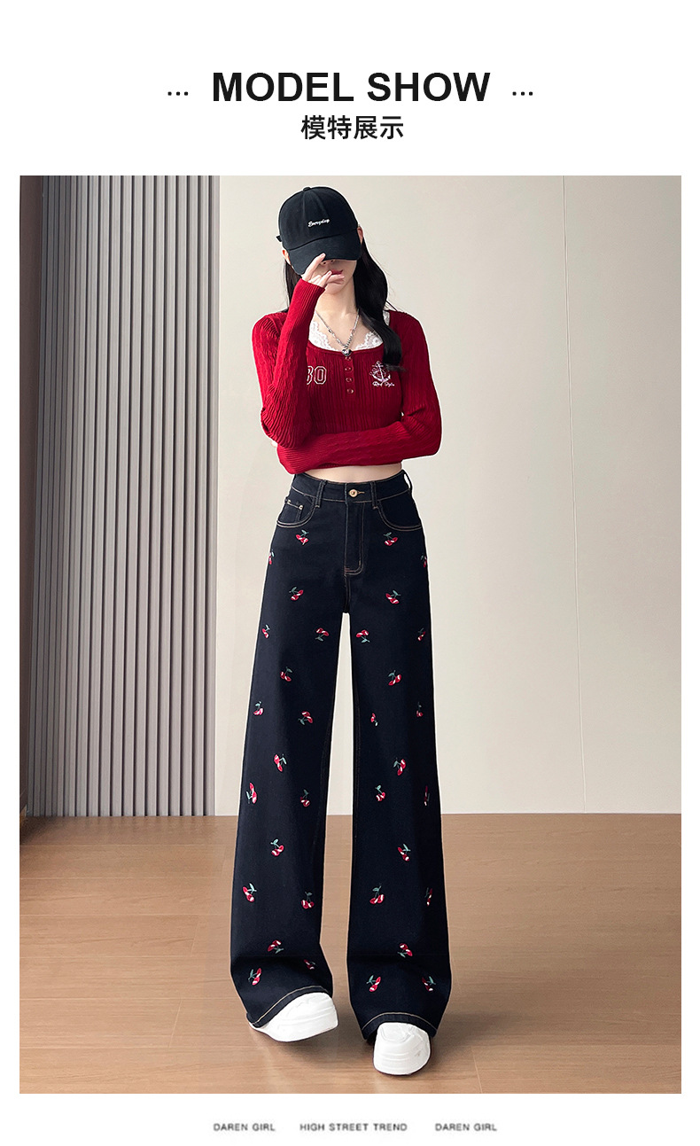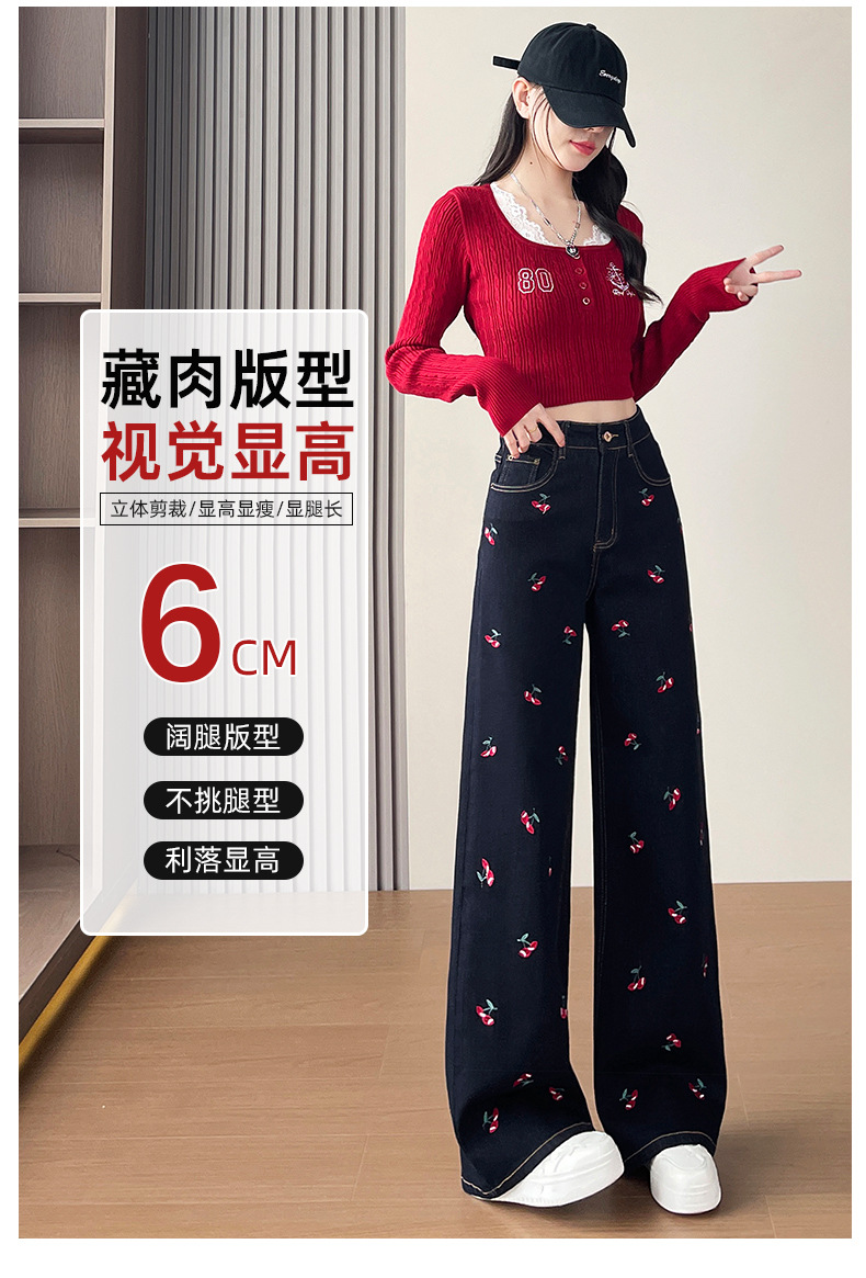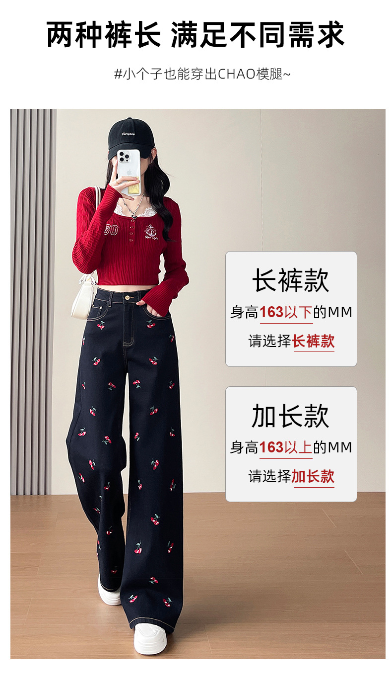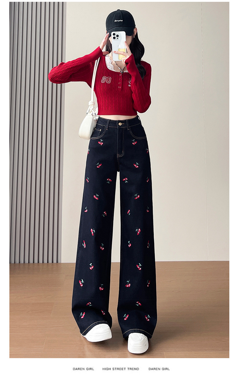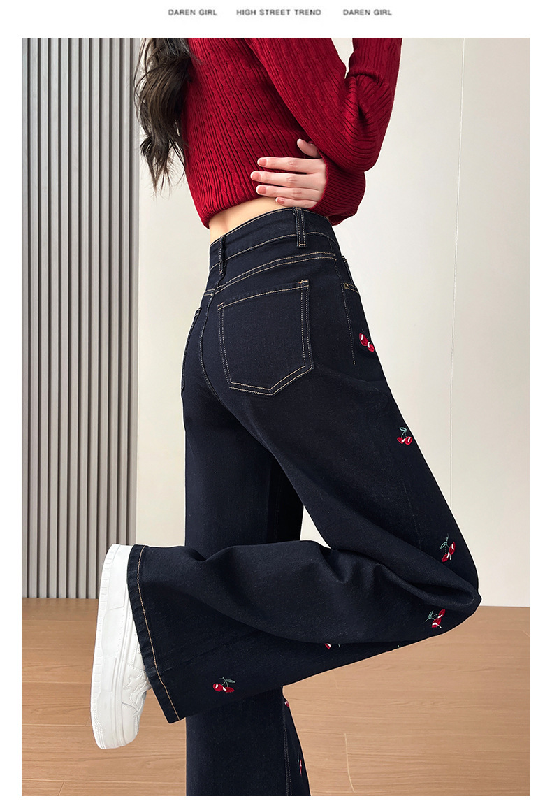 百媚生 刺绣阔腿牛仔裤女秋季高腰设计感樱桃绣花直筒裤子QYL-2237 商品图0