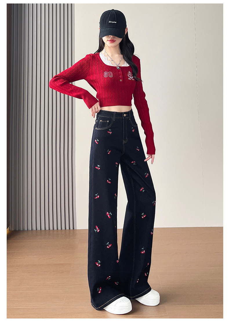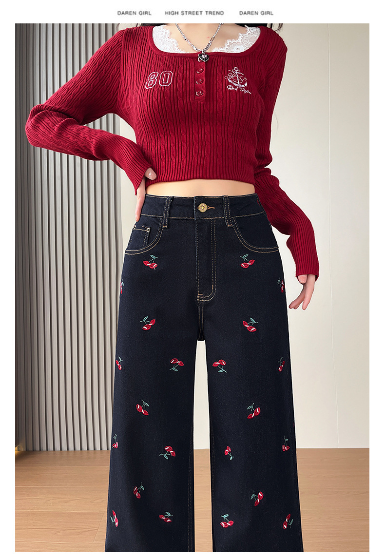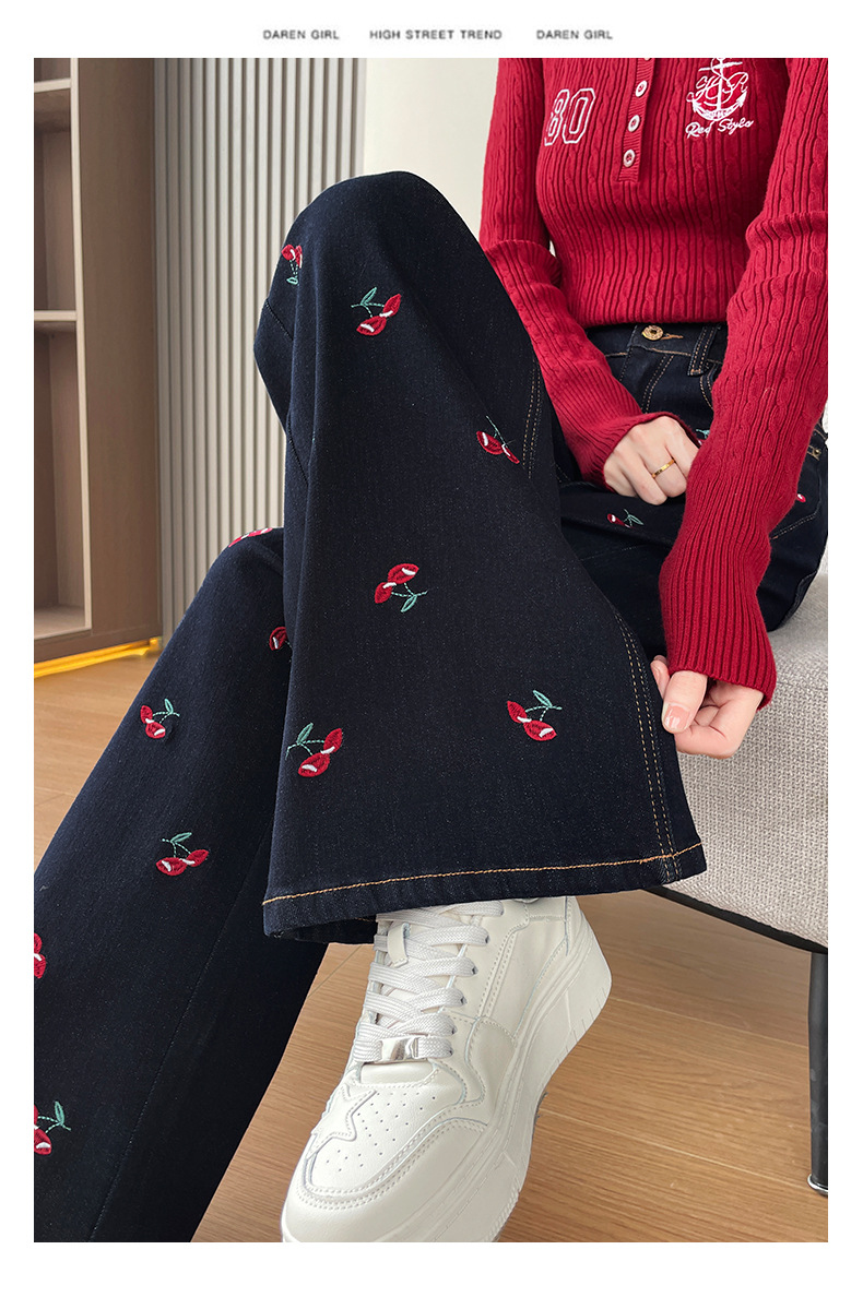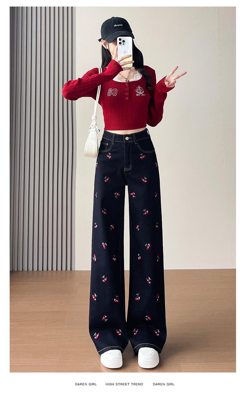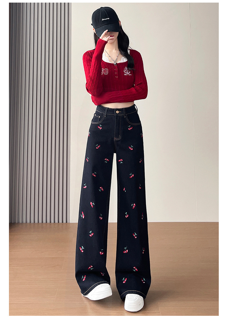 百媚生 刺绣阔腿牛仔裤女秋季高腰设计感樱桃绣花直筒裤子QYL-2237 商品图0