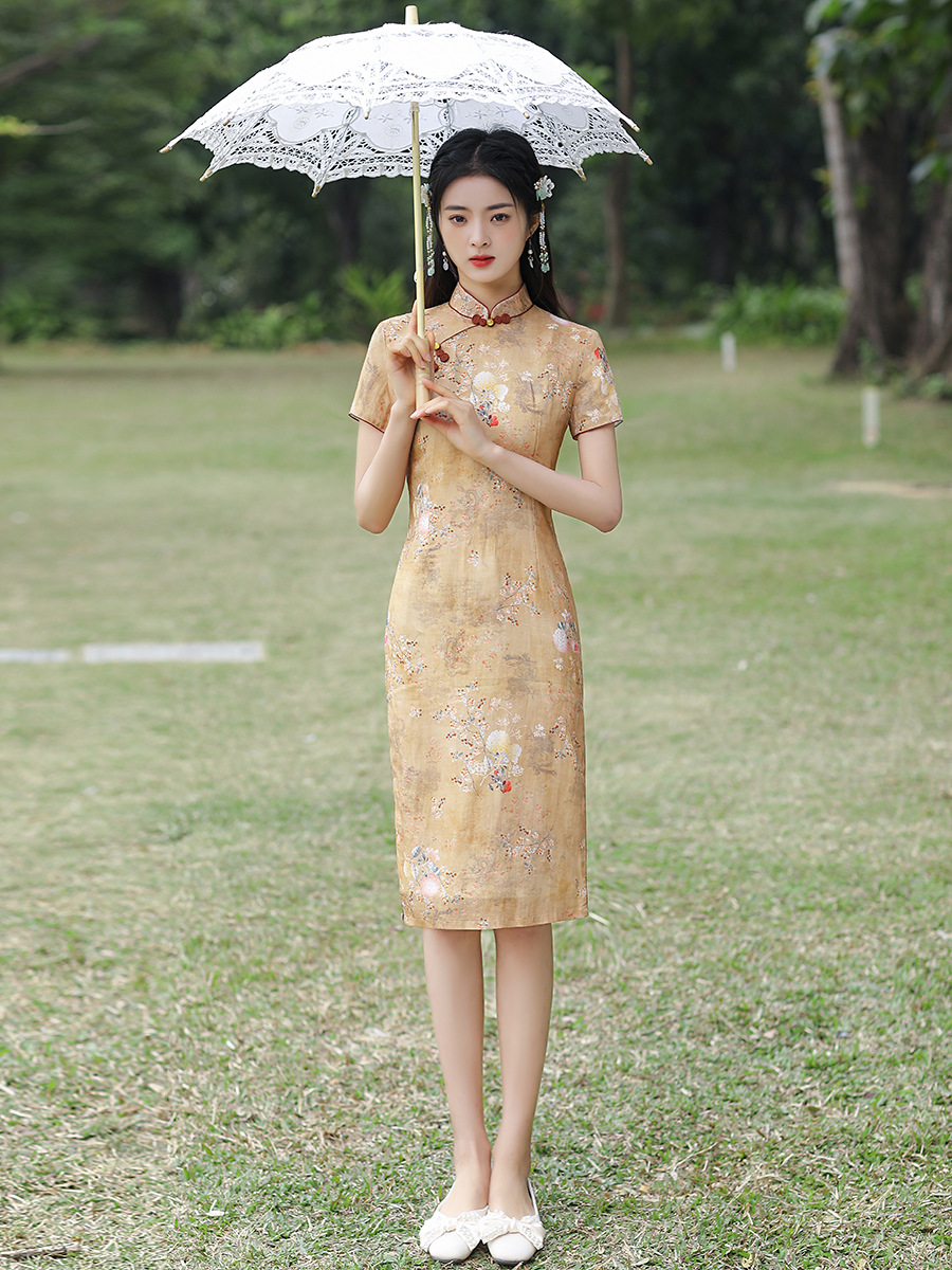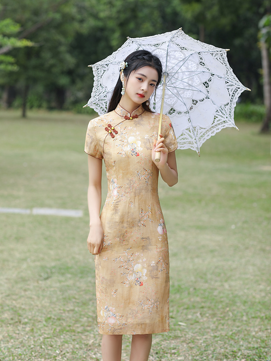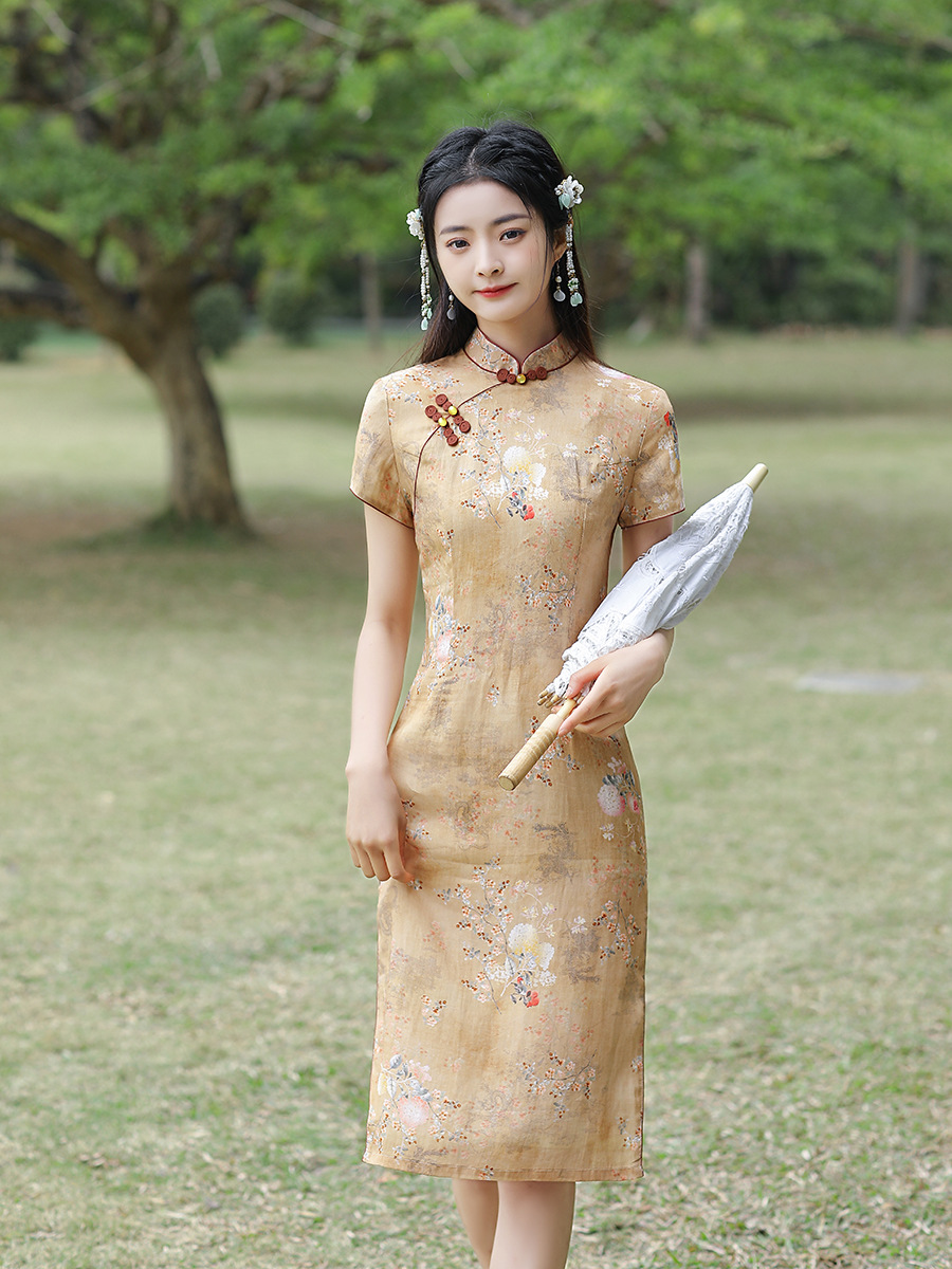 改良时尚,中长款双层苎麻旗袍TMY-6621