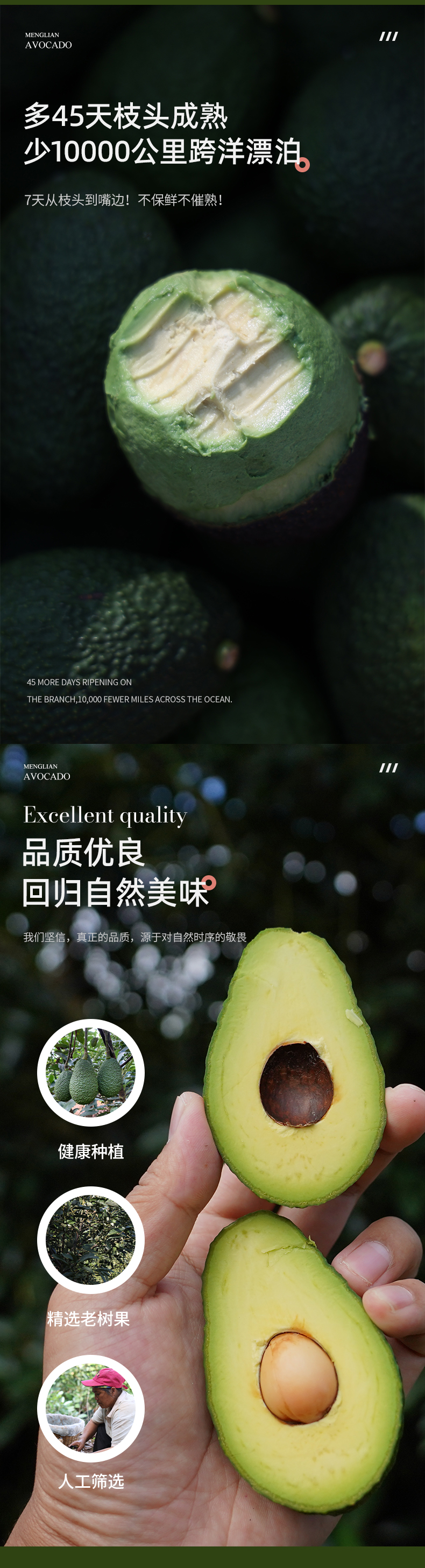 ①牛油果属于后熟水果,收到后需要和和苹果、香蕉等放一起密封催熟,待果皮变黑、摁压稍微有手感即可食用。切勿将没有催熟的牛油果直接切开食用。未催熟生开不售后。