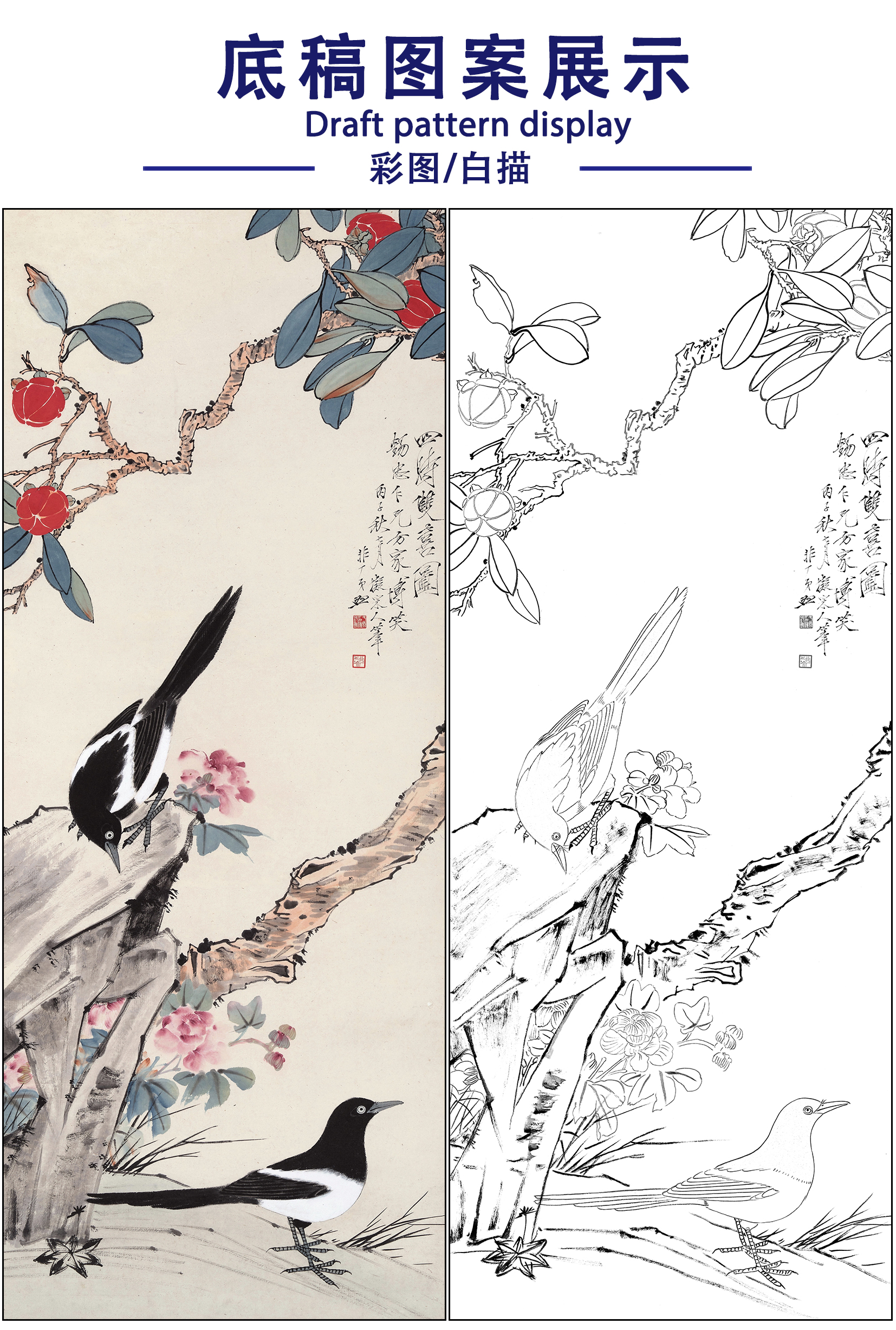 于非闇喜鹊花鸟工笔画白描底稿《四时双喜图》临摹勾线高清打印稿FA07