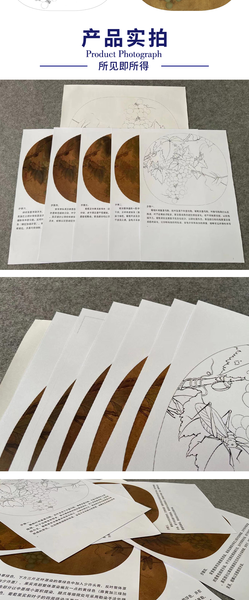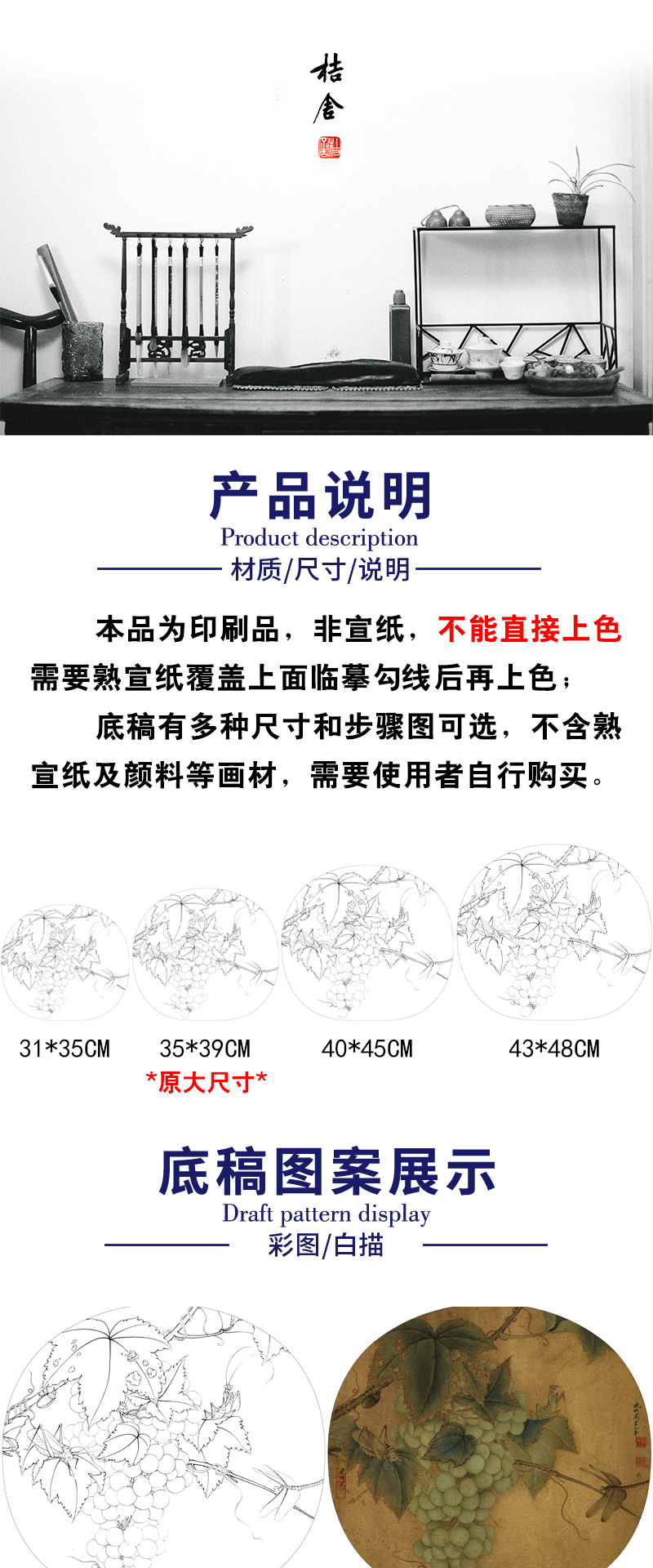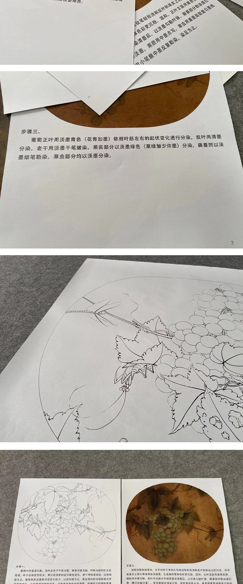 【有步骤、大彩图】李晓明工笔画白描底稿圆形小品《临宋葡萄草虫图》葡萄蜻蜓临摹勾线花鸟线稿KC11
