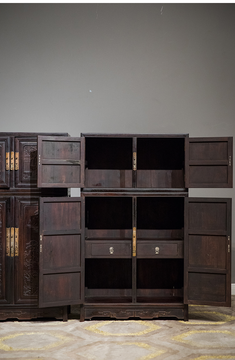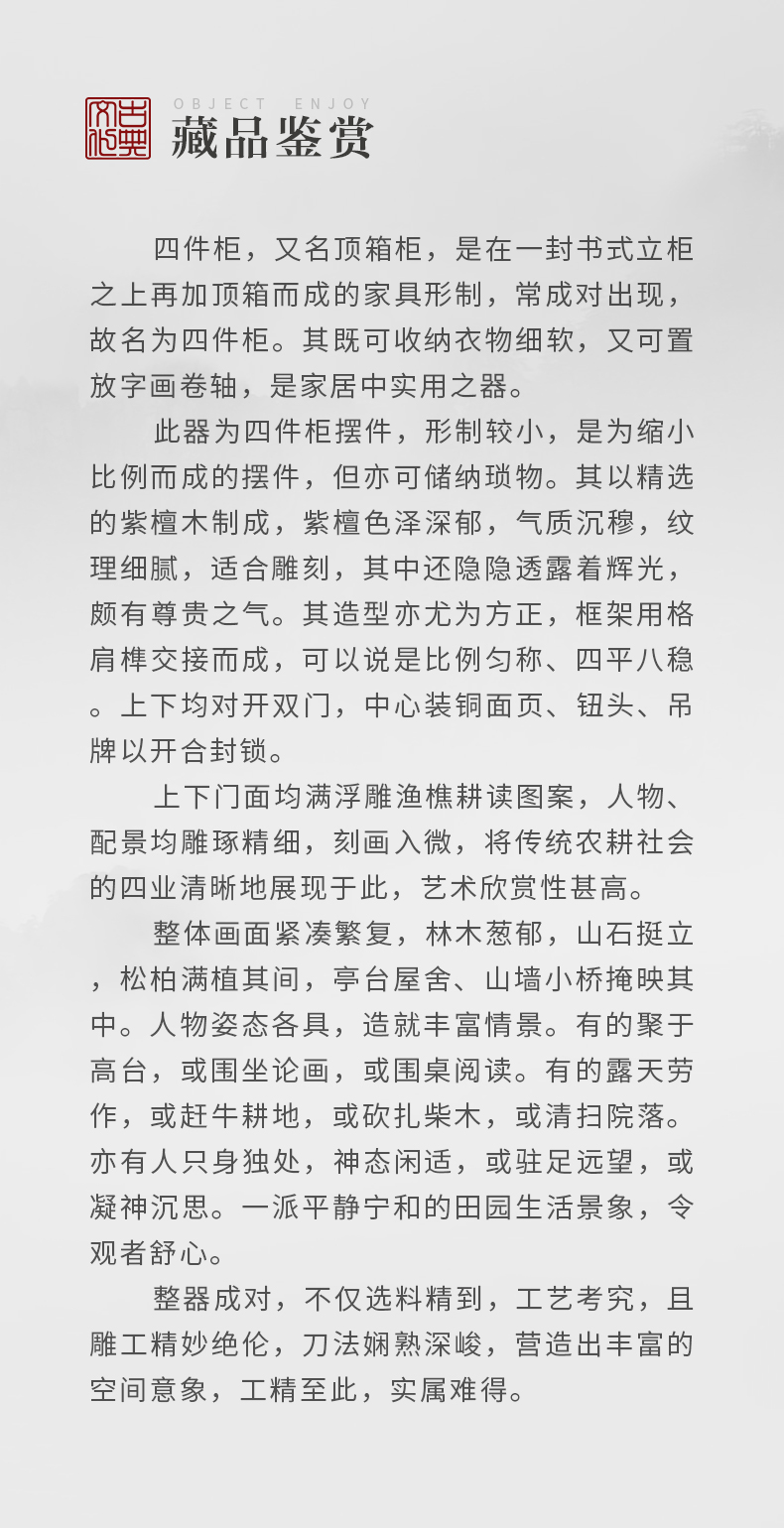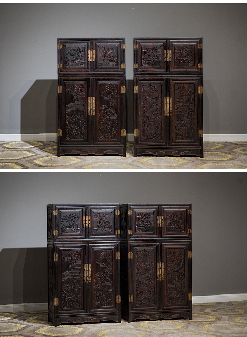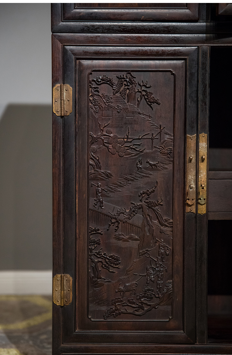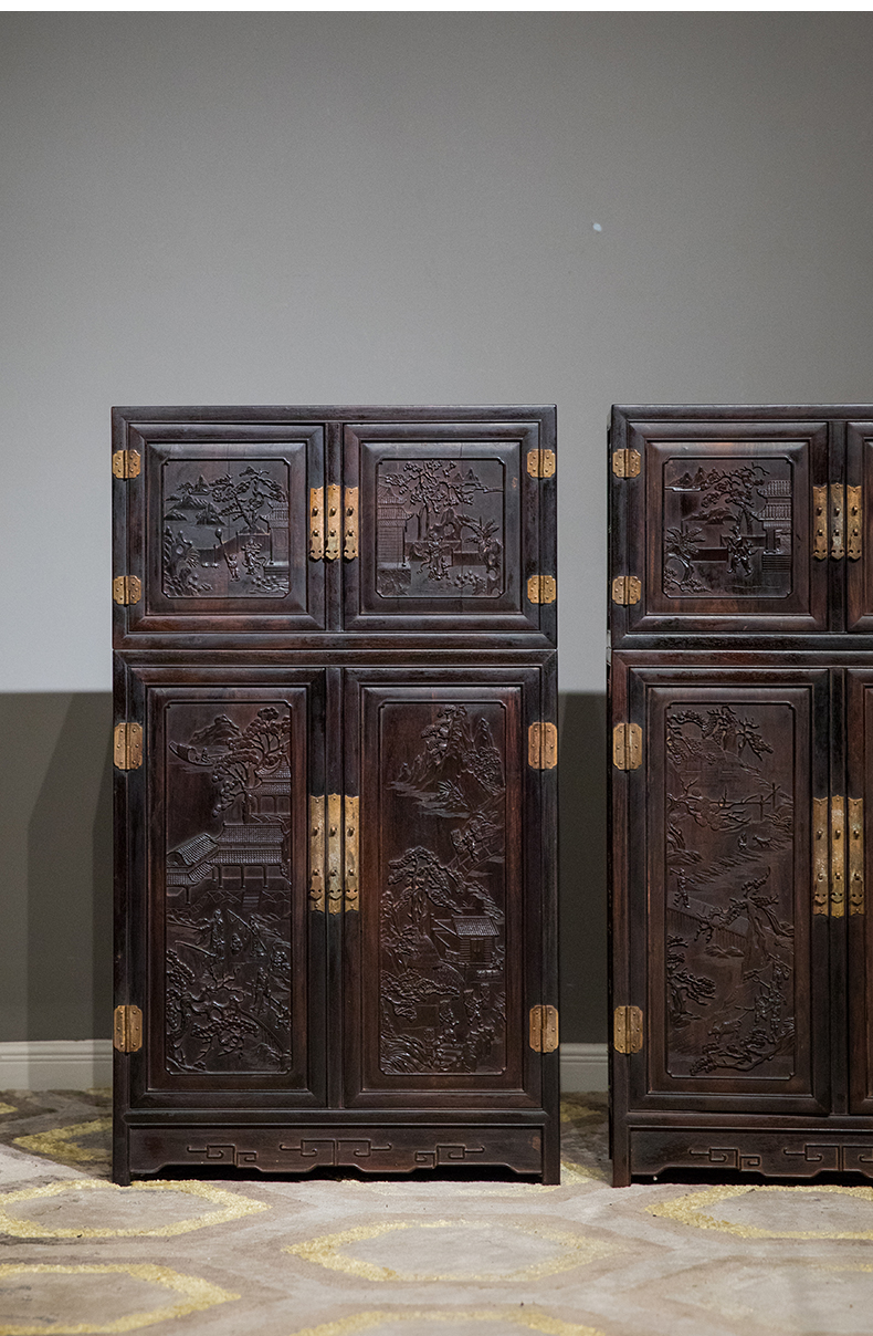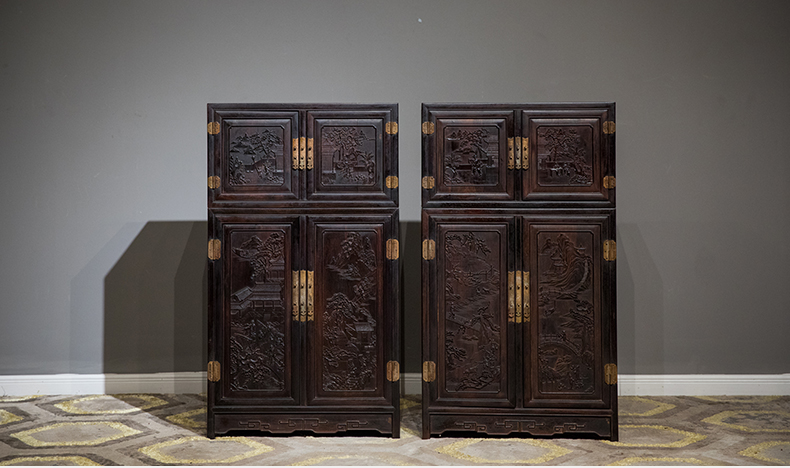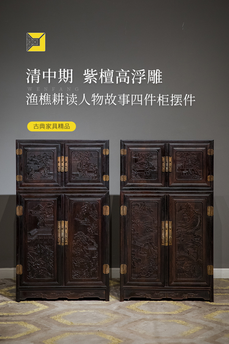 清中期 紫檀高浮雕渔樵耕读人物故事四件柜摆件