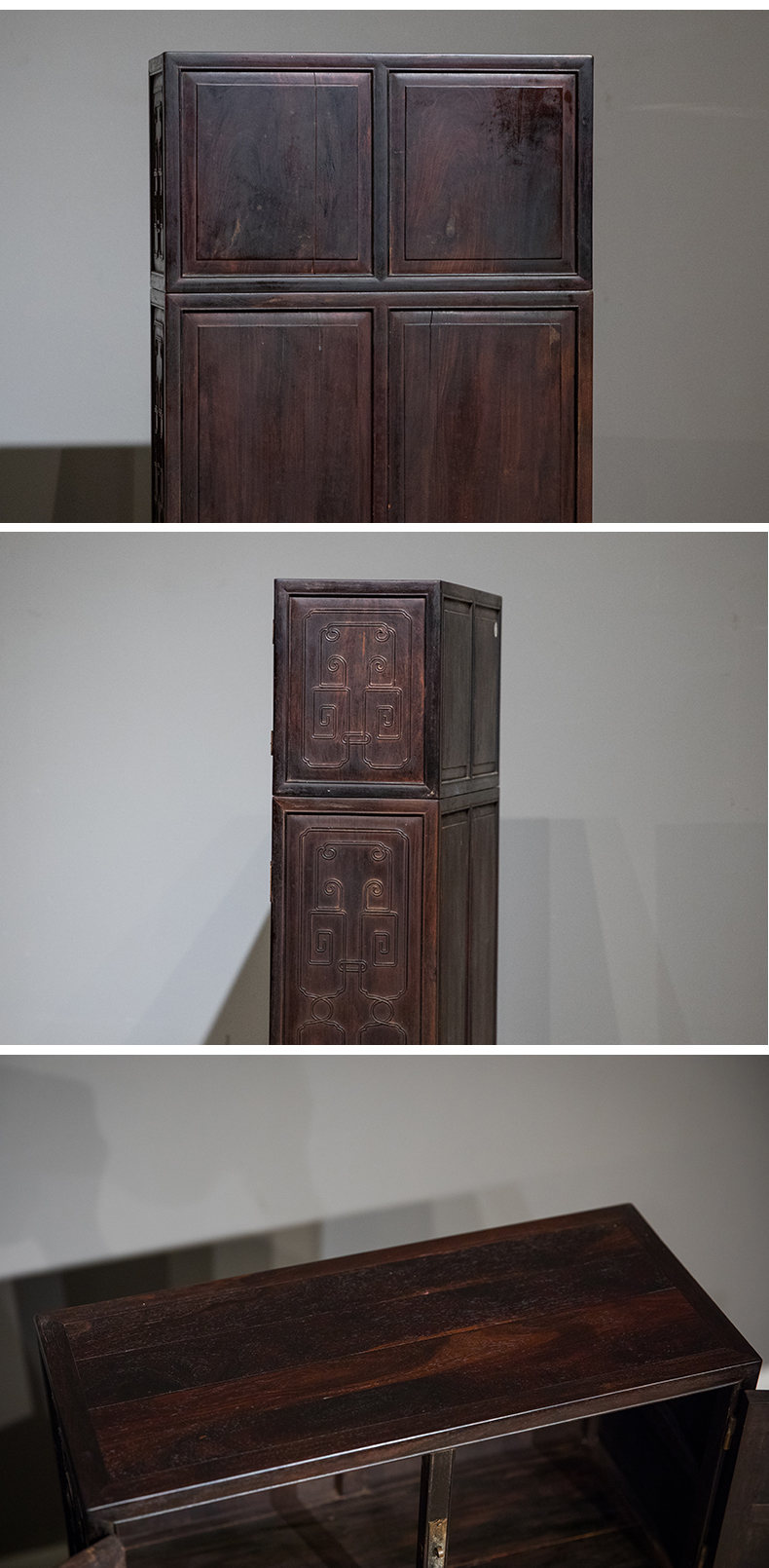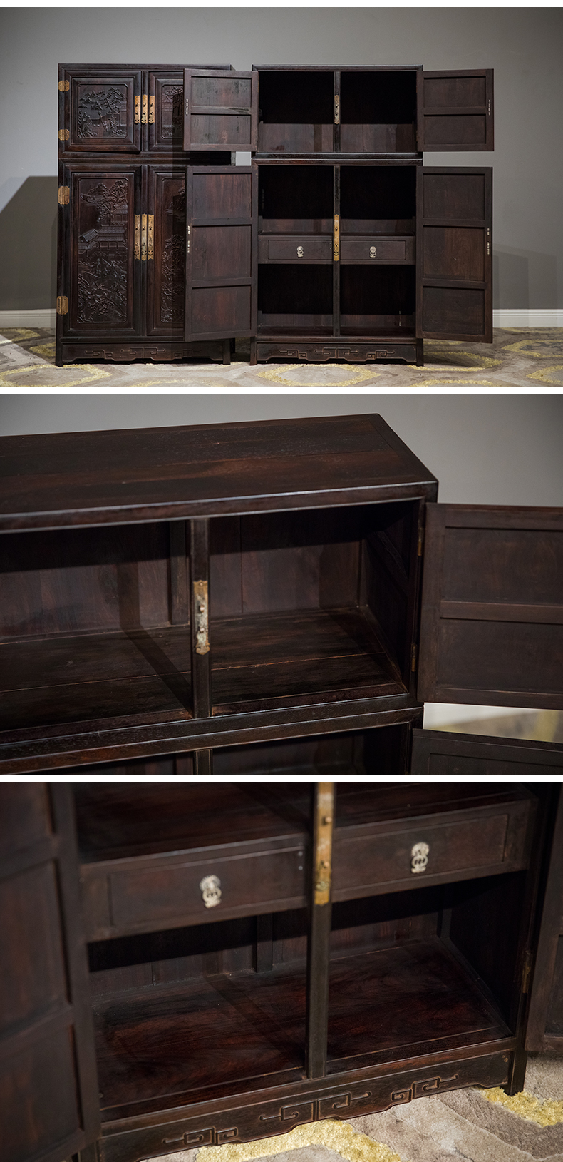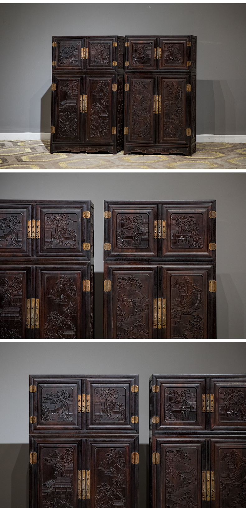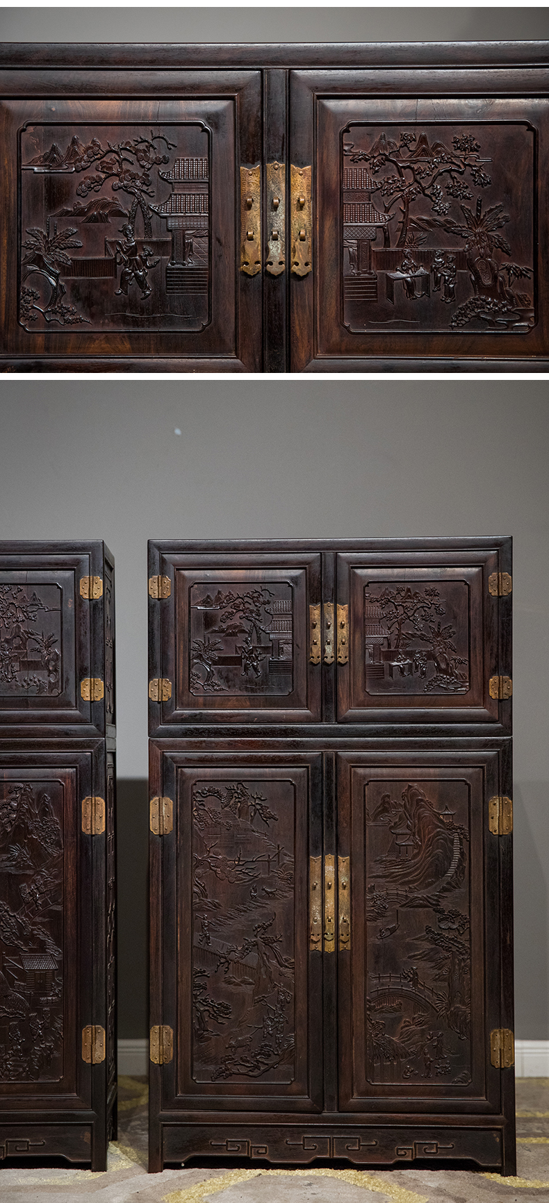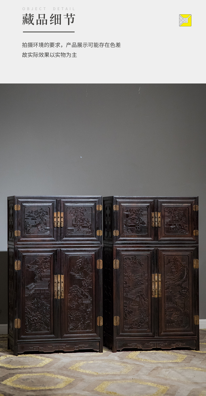 清中期 紫檀高浮雕渔樵耕读人物故事四件柜摆件