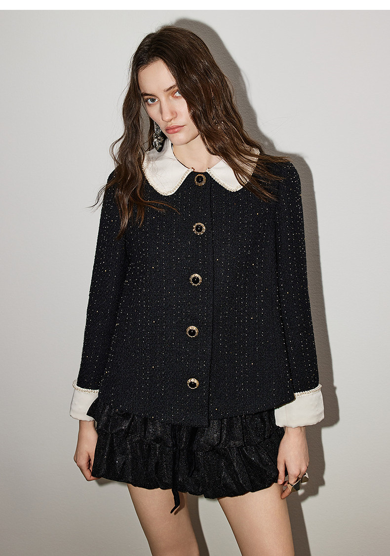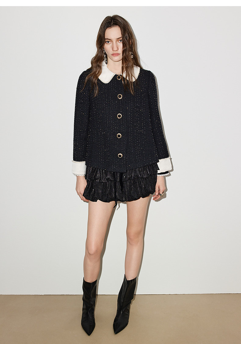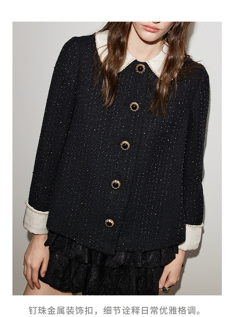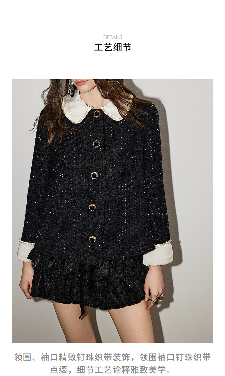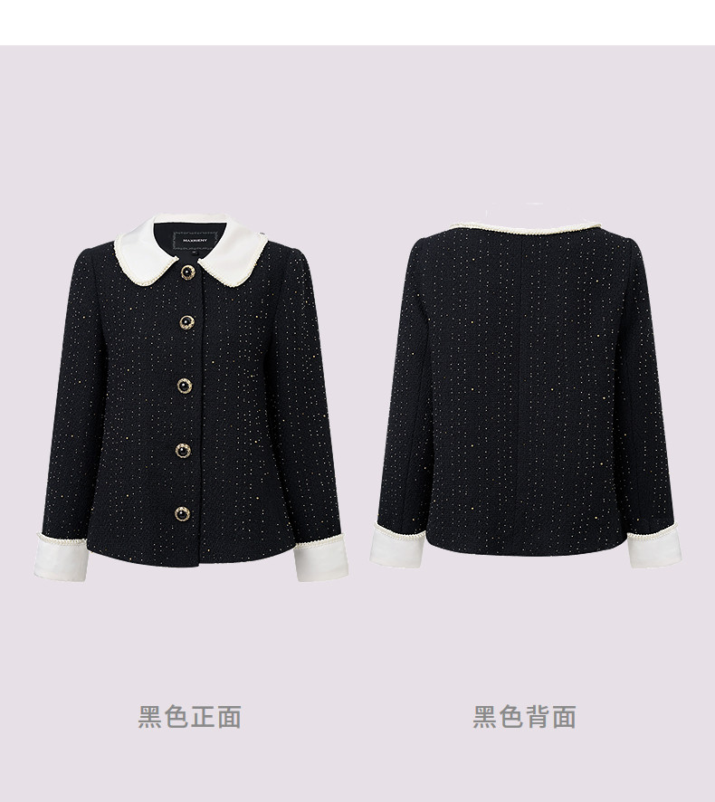 玛克门店发货:MAXRIENY黑色羊毛外套2026年春季新款娃娃领小香风花纱钉珠短外套(货号:MF86JA759)