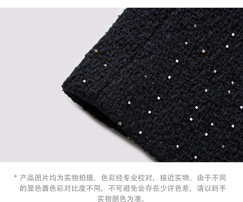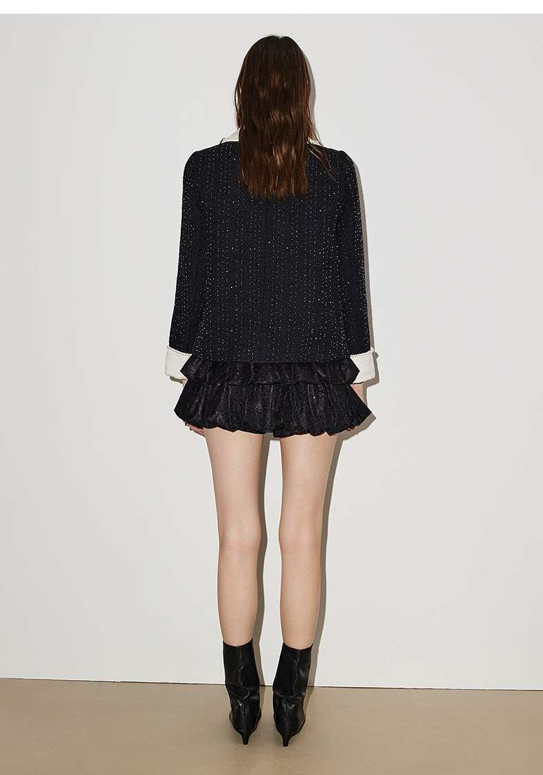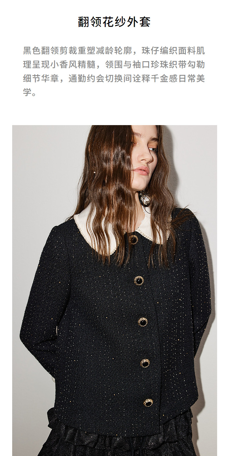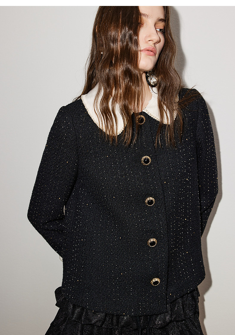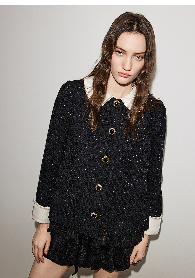 玛克门店发货:MAXRIENY黑色羊毛外套2026年春季新款娃娃领小香风花纱钉珠短外套(货号:MF86JA759)
