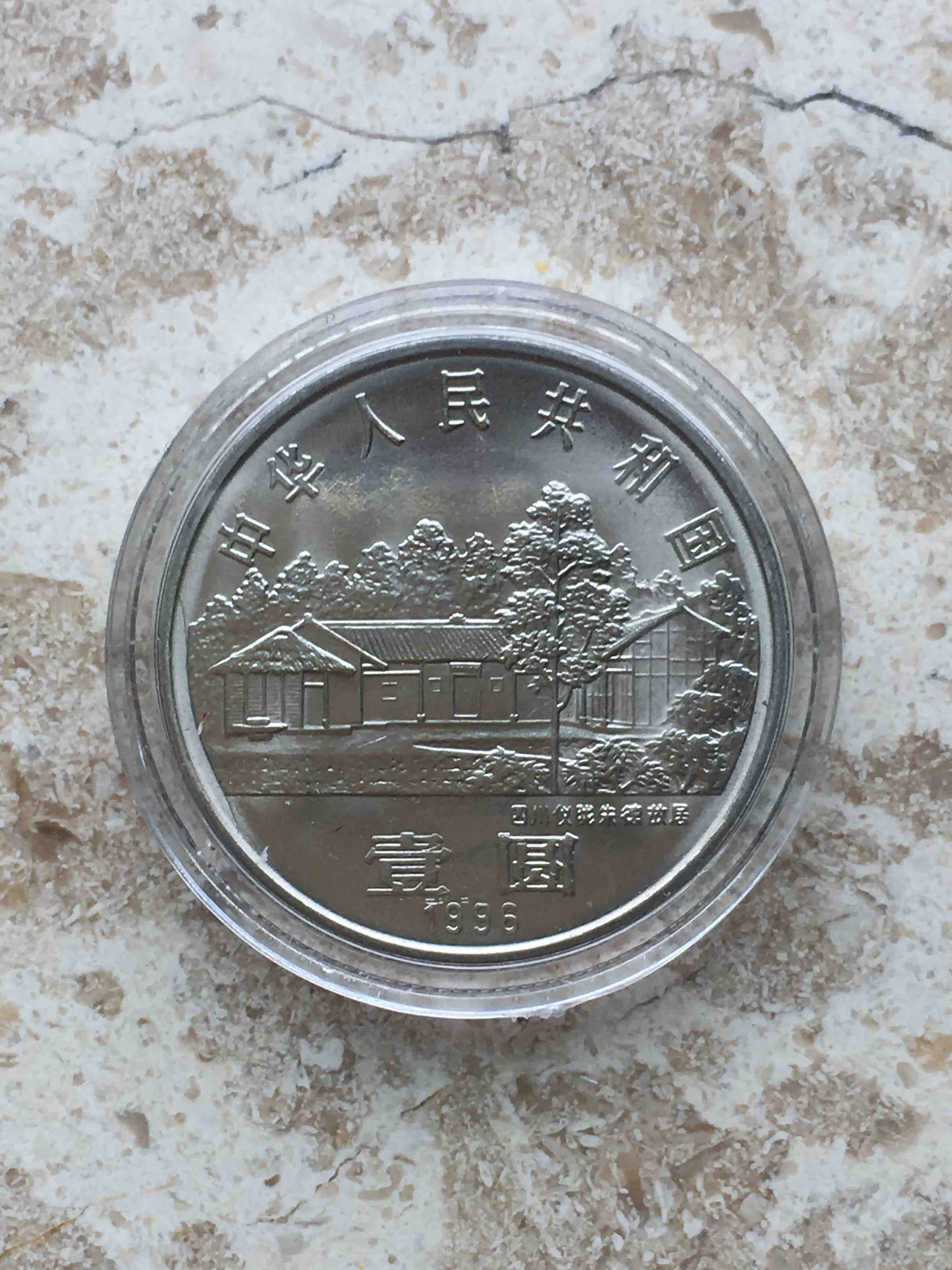 朱德诞辰110周年纪念币正面图案由中文“中华人民共和国”国名、四川仪陇朱德故居、“1996”年号和“壹元”面值等组成。