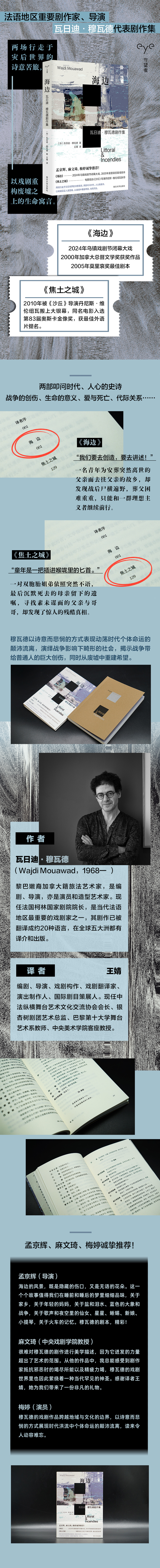 本书收入法语地区重要剧作家、导演、作家瓦日迪·穆瓦德的两部代表剧作:《海边》——2024年乌镇戏剧节闭幕大戏,2000年加拿大总督文学奖获奖作品,2005年莫里哀奖最佳剧本;《焦土之城》——2010年被《沙丘》导演丹尼斯·维伦纽瓦搬上大银幕,同名电影入选第83届奥斯卡金像奖,获最佳外语片提名。穆瓦德以其诗意的文字和精巧的戏剧结构探讨战争的创伤、生命的意义、爱与死亡、代际关系等重要议题。