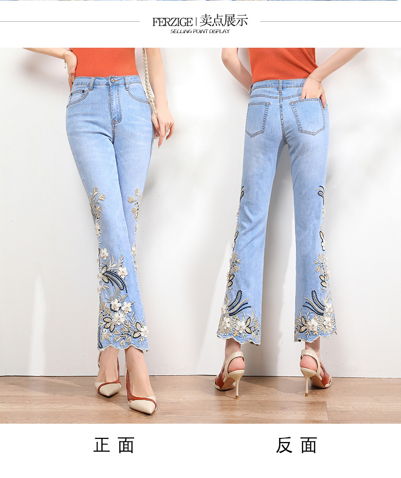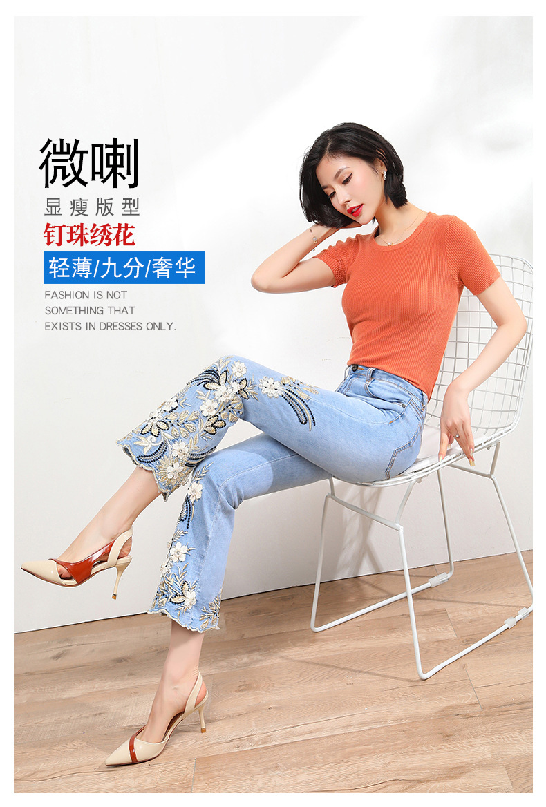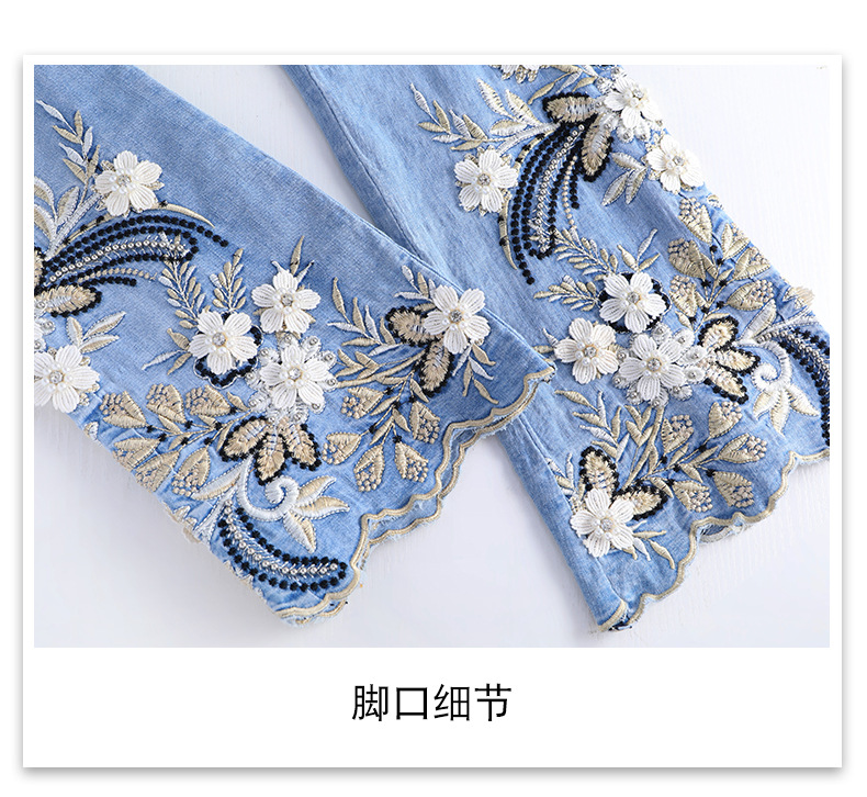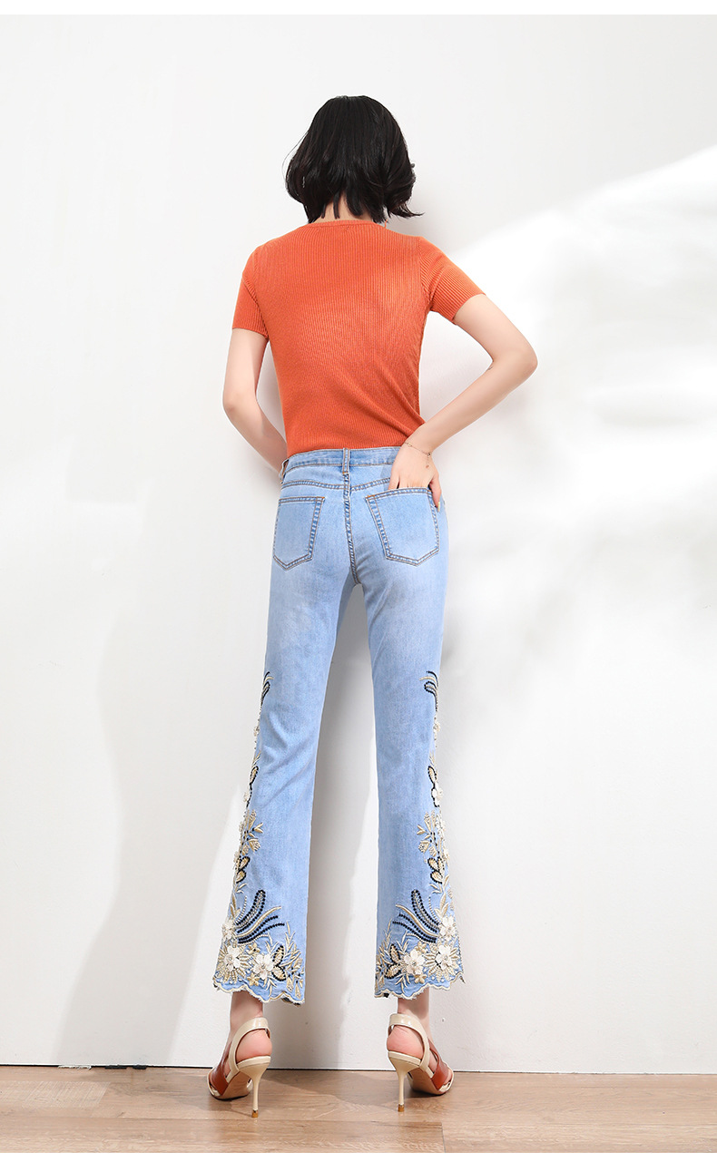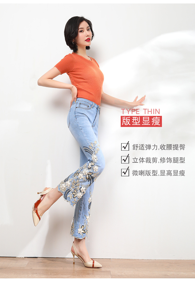 YHFZ2-695新款刺绣花钉珠微喇九分牛仔裤