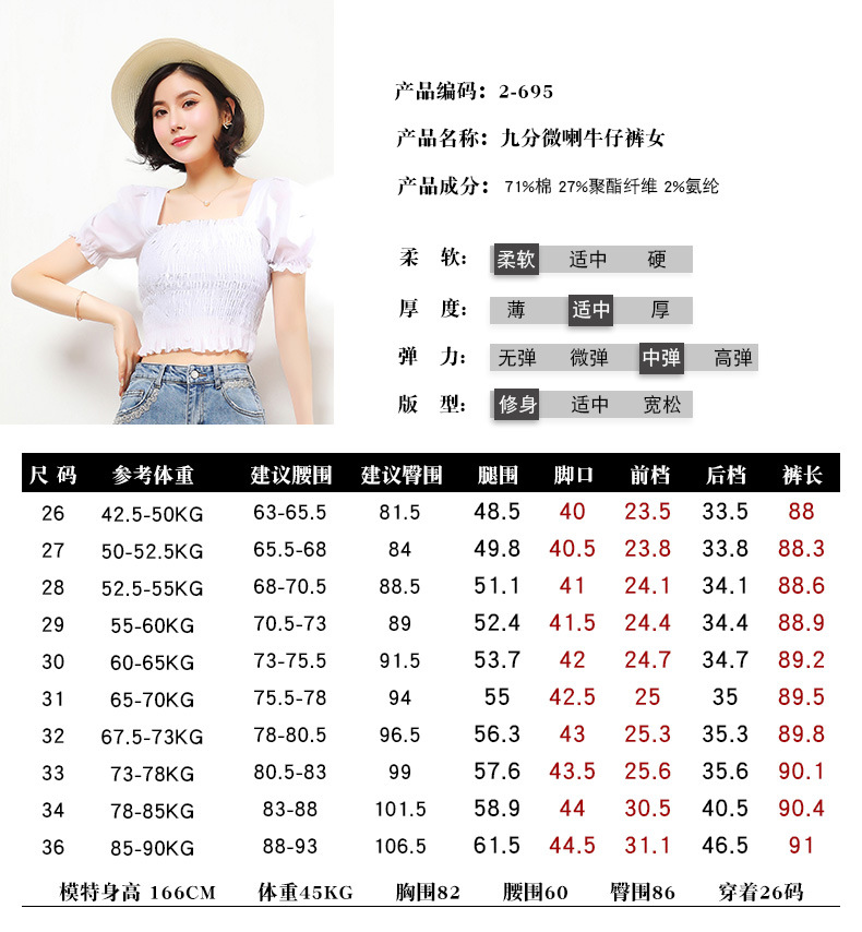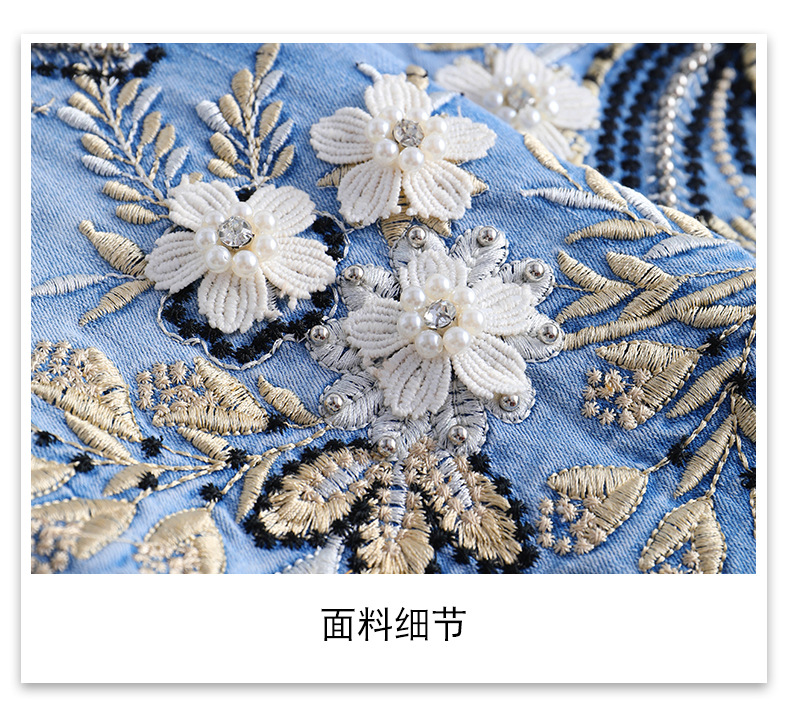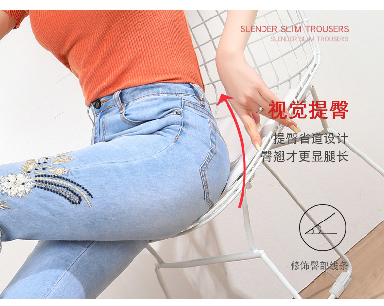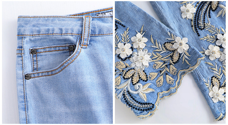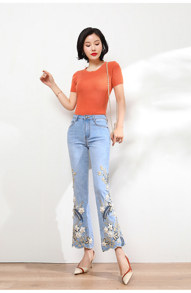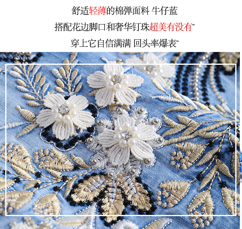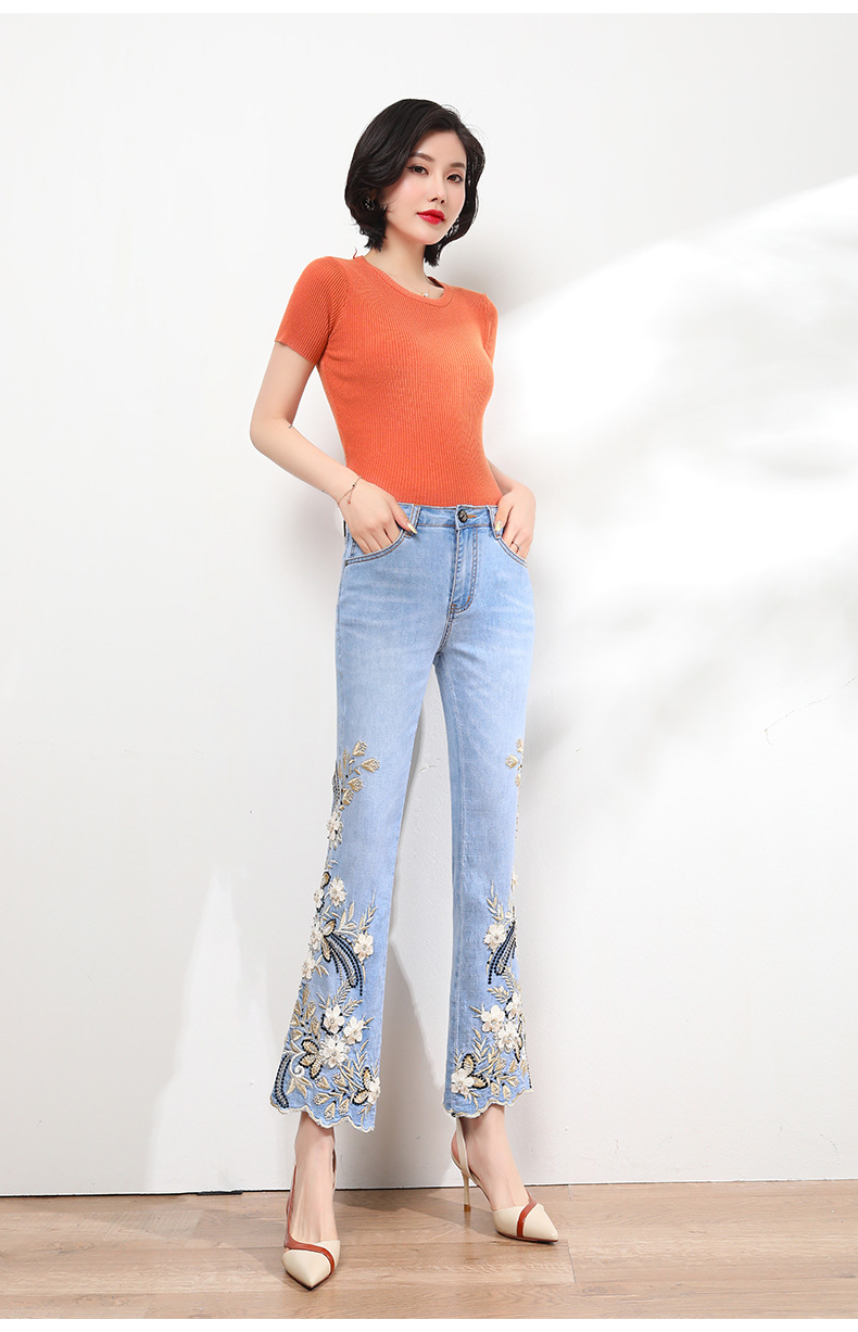 YHFZ2-695新款刺绣花钉珠微喇九分牛仔裤