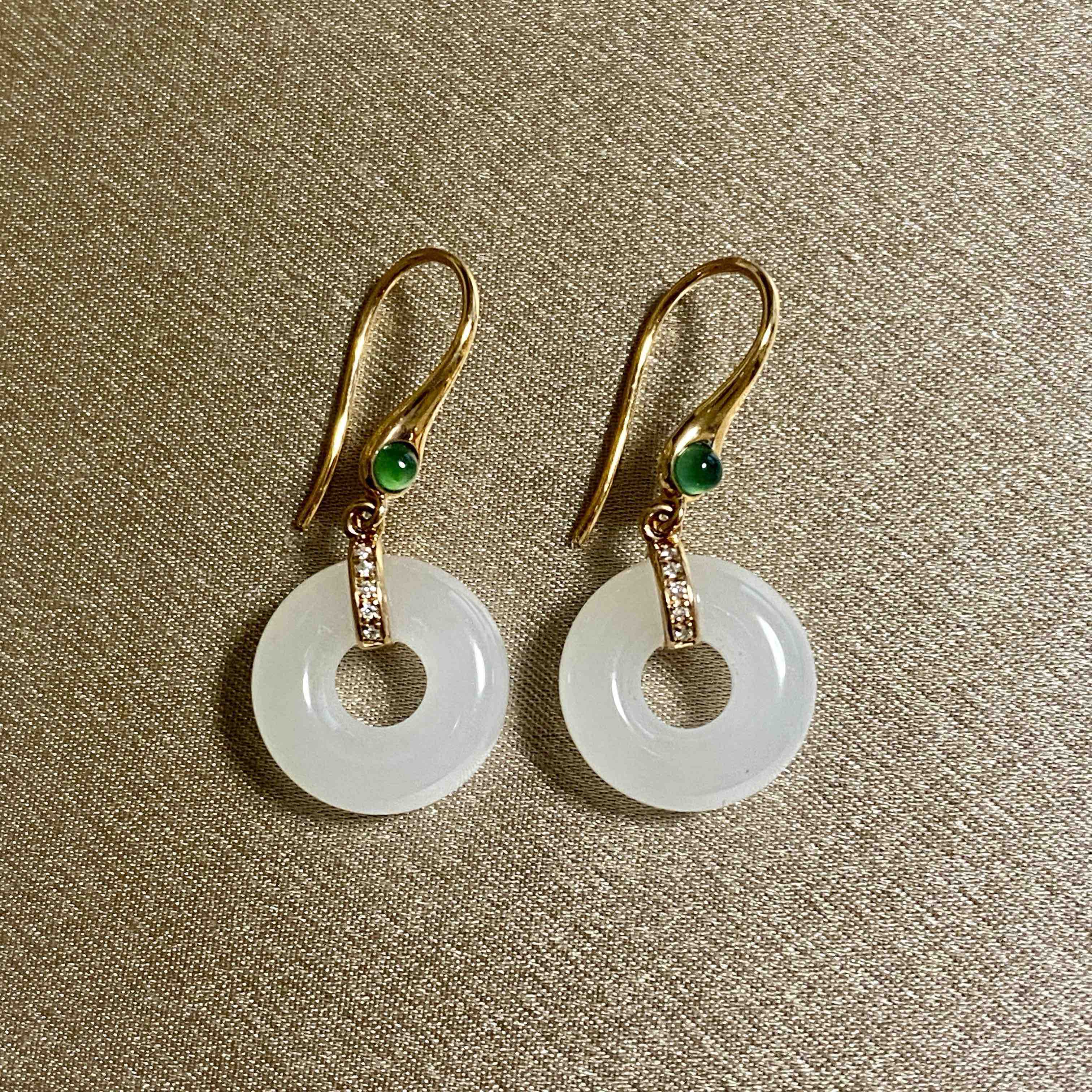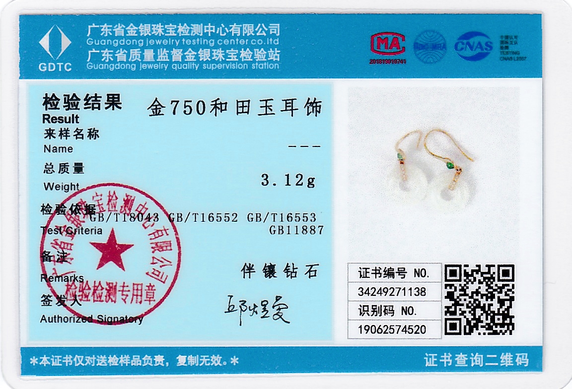 18K黄金和田玉(白玉)镶钻耳饰