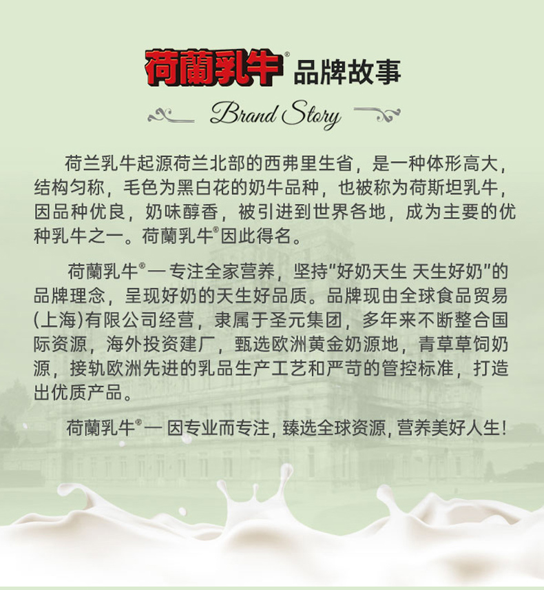 - 荷兰乳牛品牌于1990年进入中国,相伴31年始终致力于为更多家庭奉上优种荷兰乳牛带来的营养与美味。秉承“珍选至纯营养,传承经典醇香”的理念,打造一个覆盖全人群、多品类、高品质的国际化品牌。