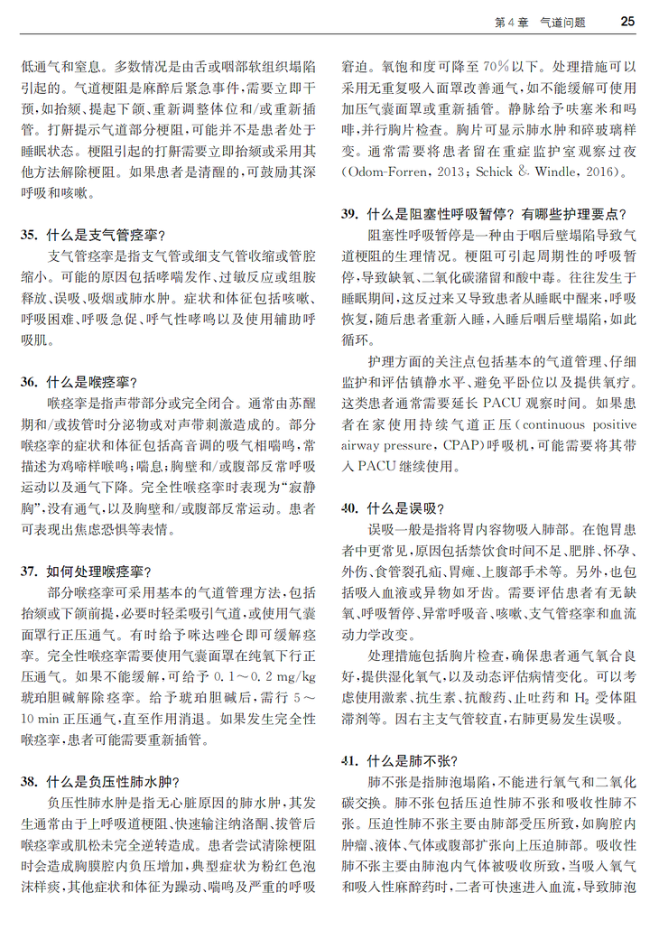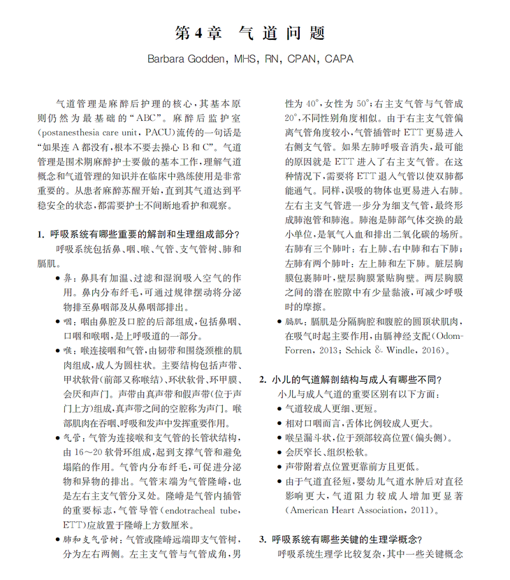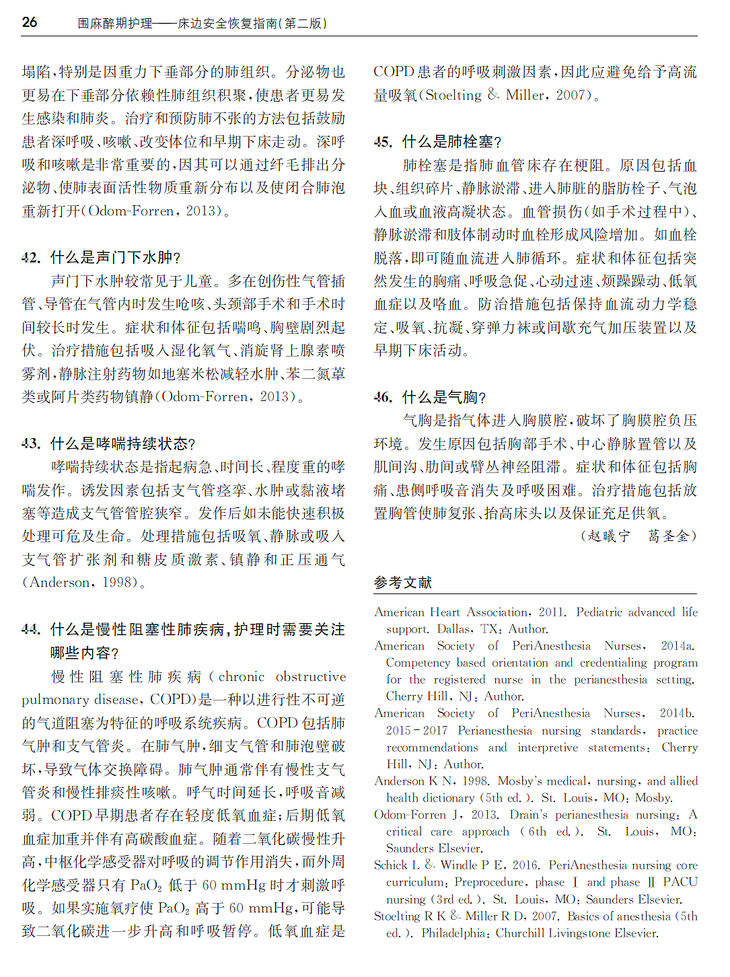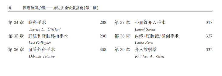 安全并非偶然,提供良好的护理也并非巧合。既要能够管理气道不稳定的危重病Ⅰ期苏醒患者,同时也要照护穿戴整齐坐在椅子上但却担心回家后行走问题的Ⅱ期苏醒患者,这是很多围麻醉期护士每天都要兼顾的事情。能够及时识别患者及其家庭成员的任何变化并且提供安全优质的护理需要激情、专业知识和技术以及敏锐的临床判断能力。我们希望本书能够成为一些人的复习资料和另一些人的重要资源。