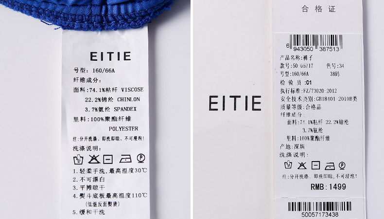 | 产品面料: | 74.1%粘纤 22.2%锦纶 3.7%氨纶 | ||||||||||||