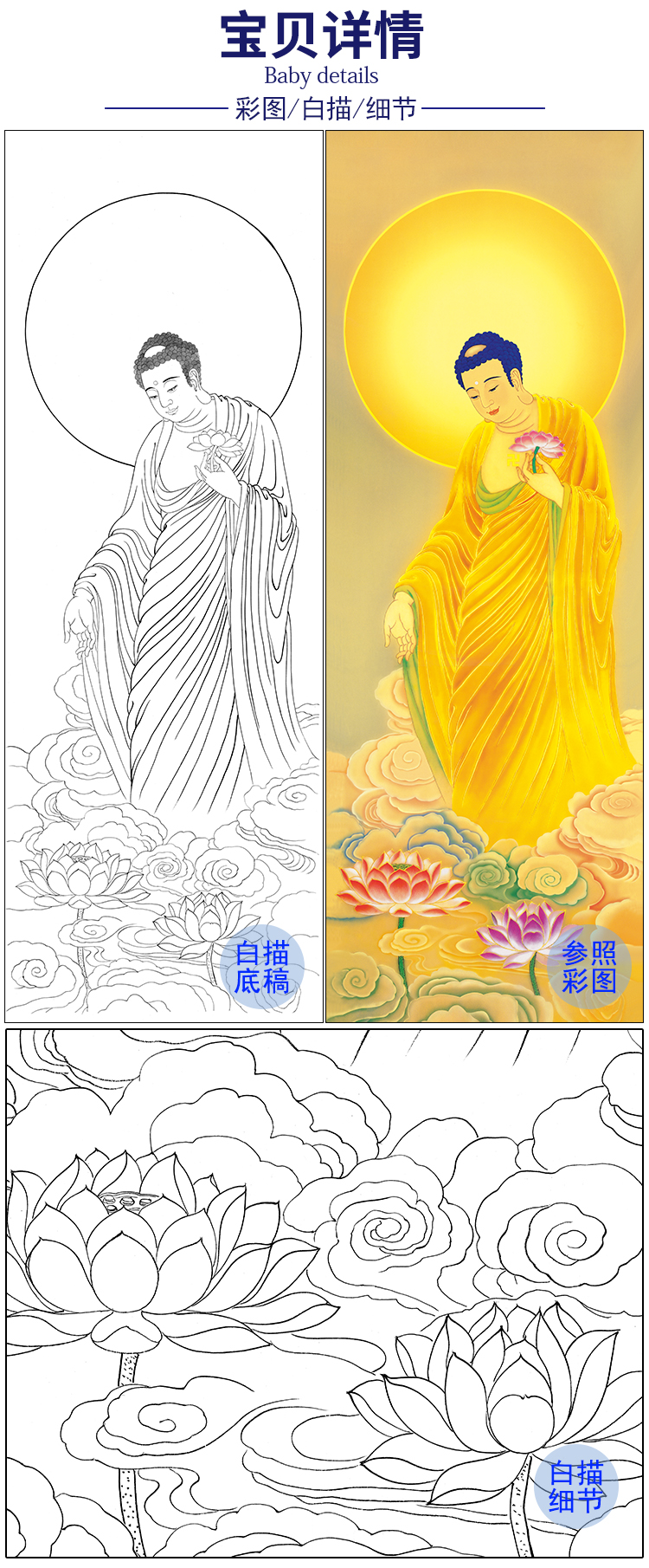 竖幅工笔人物白描底稿 西方三圣 南无阿弥陀佛-观音佛像菩萨-SF09