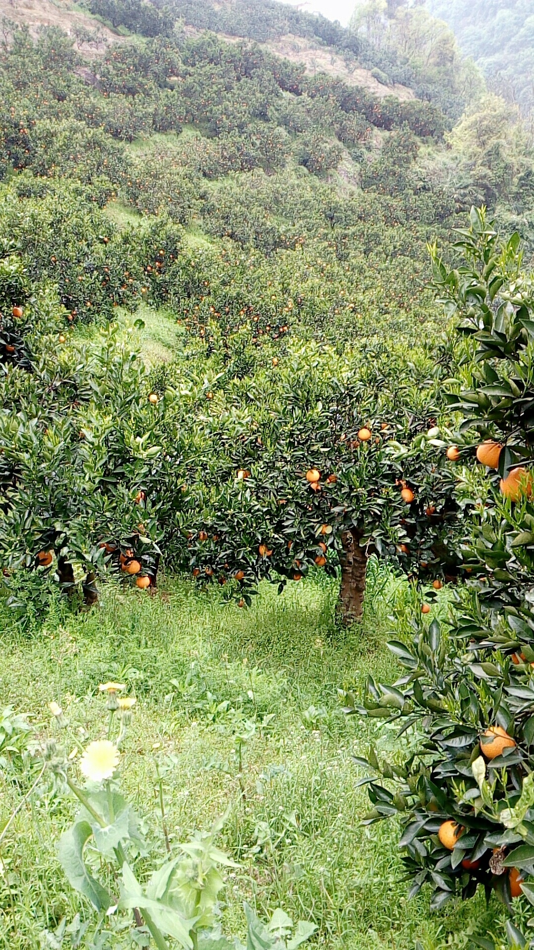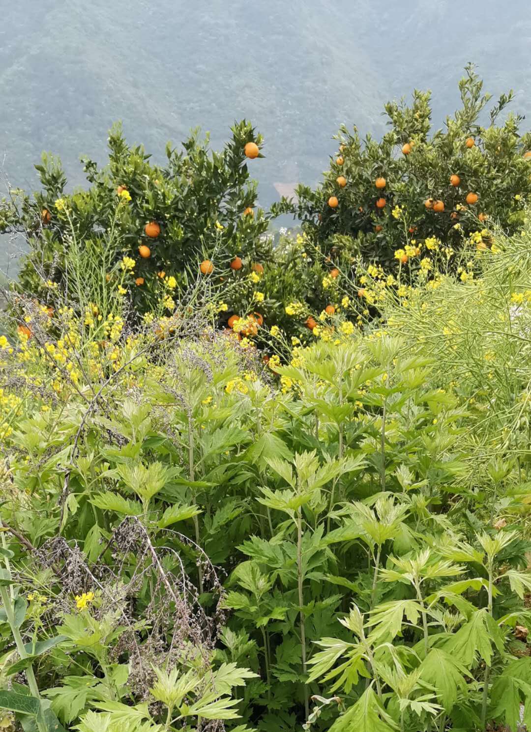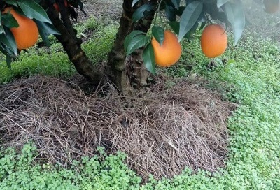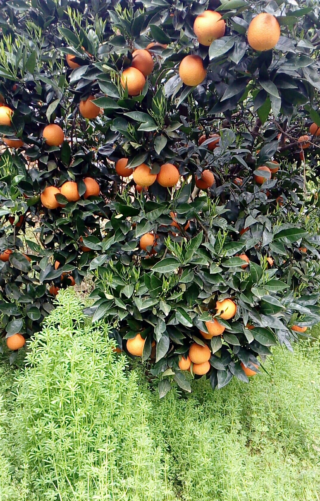橙园灌溉使用山泉水。除了一些过高的杂草需要处理一下之外,基本不除草;另外每年都会在橙园种上三叶草和苕子做绿肥,也会在园子里种植一些其他的蔬菜,补充土壤肥力,保持水土。