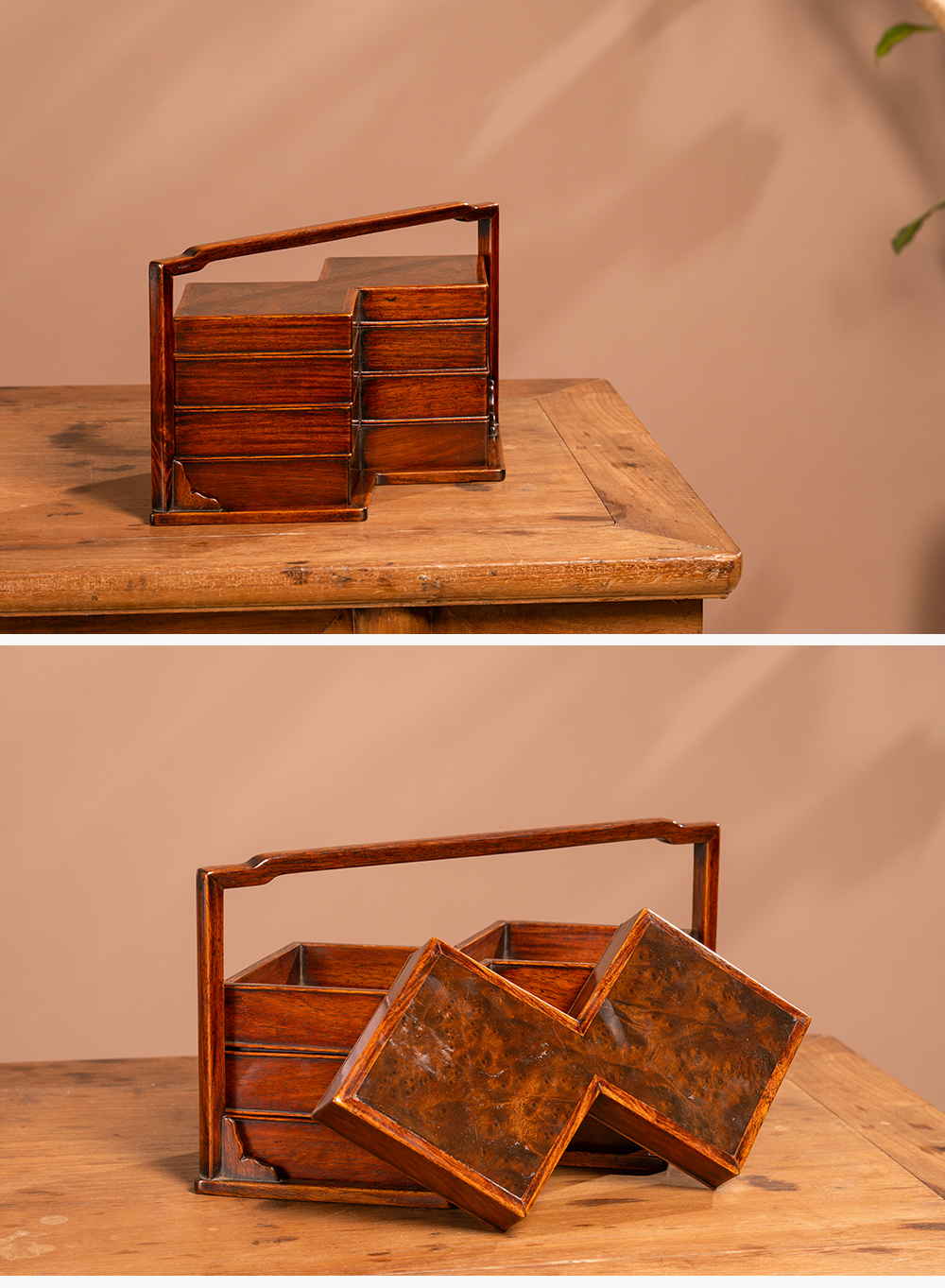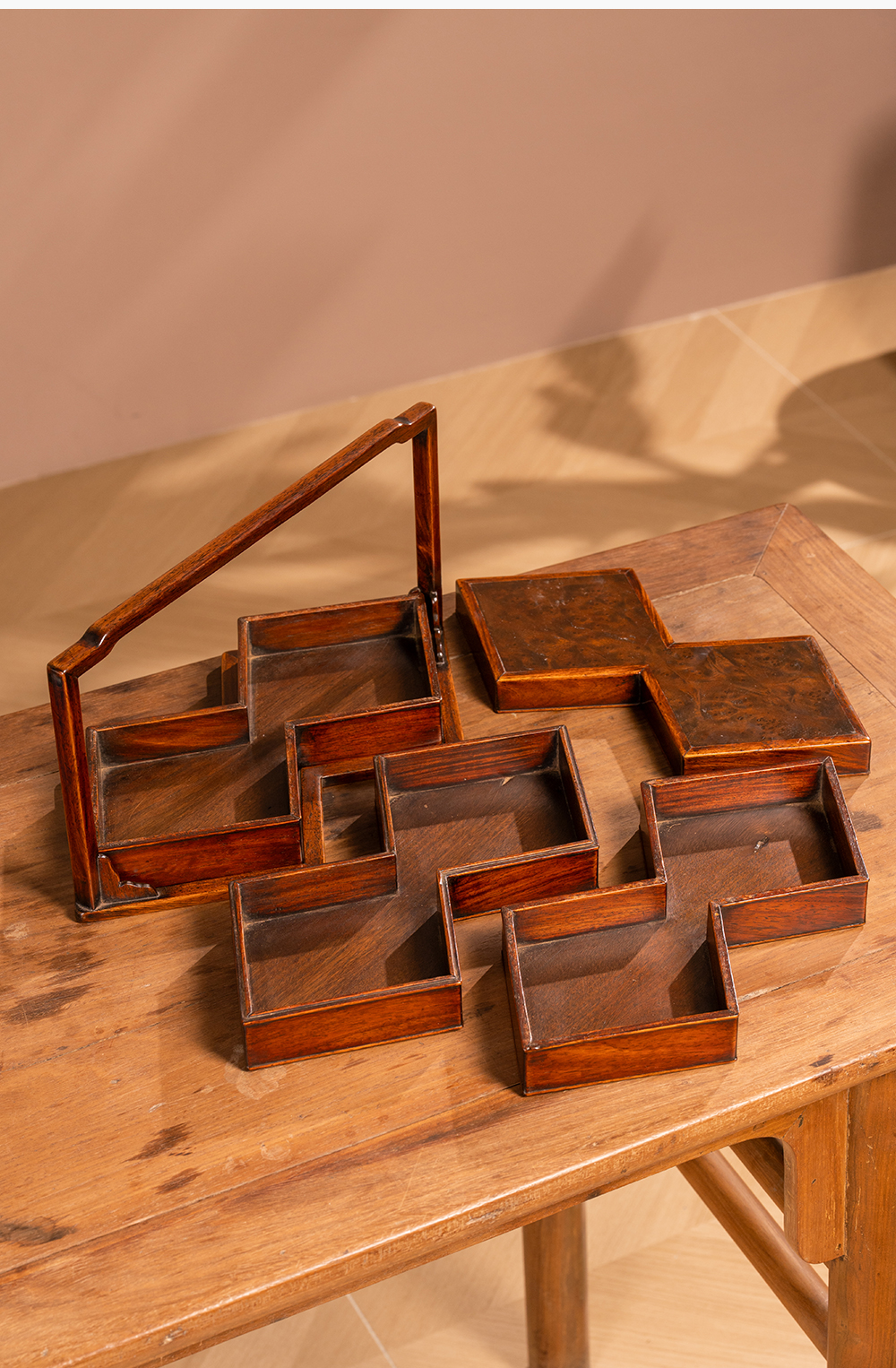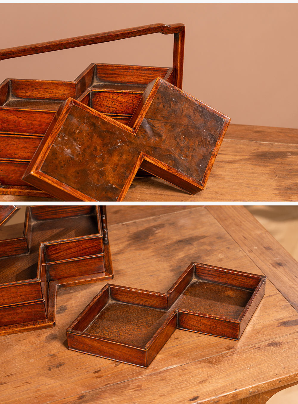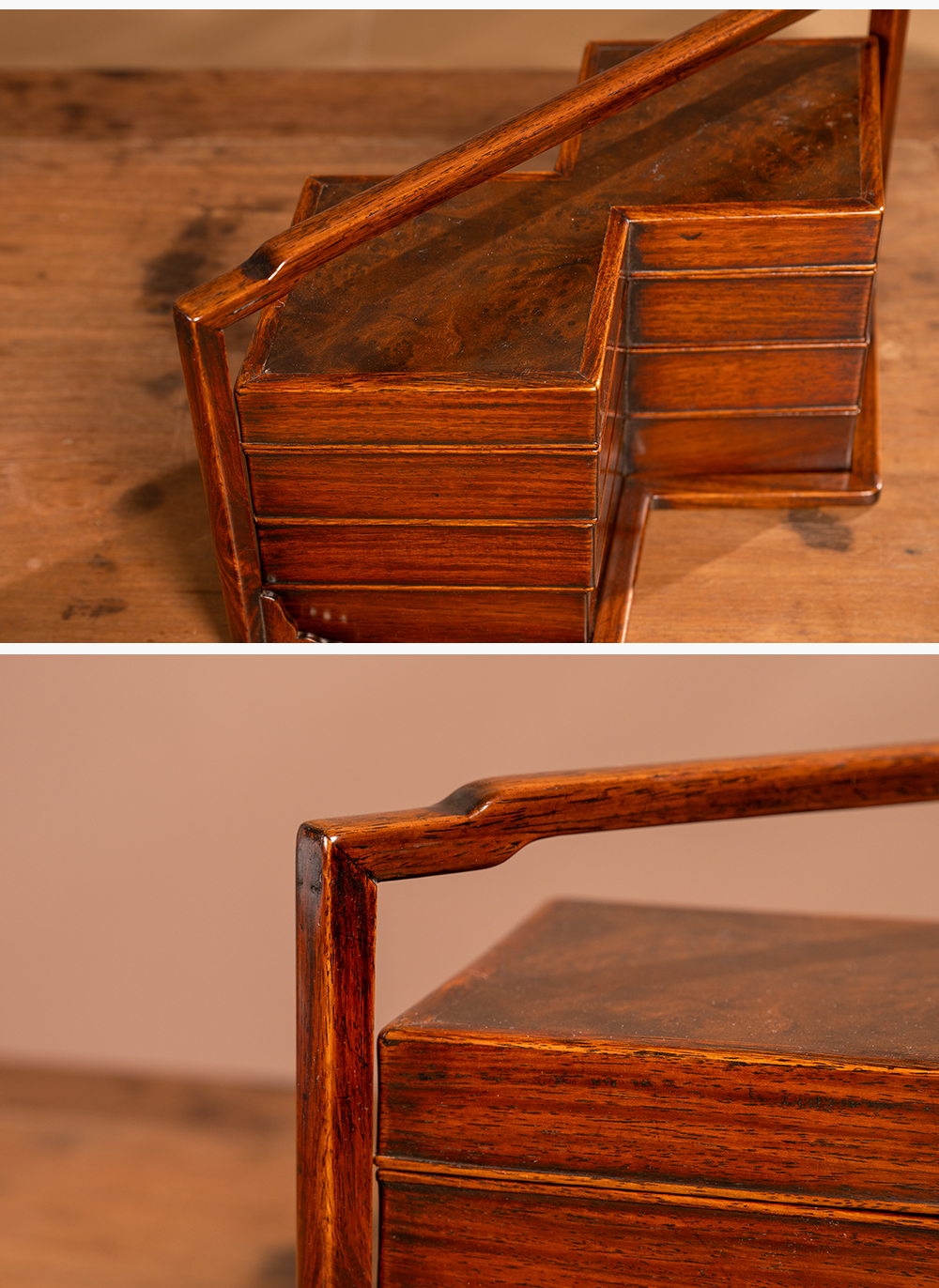 清 黄花梨镶瘿木方胜形三撞提梁盒