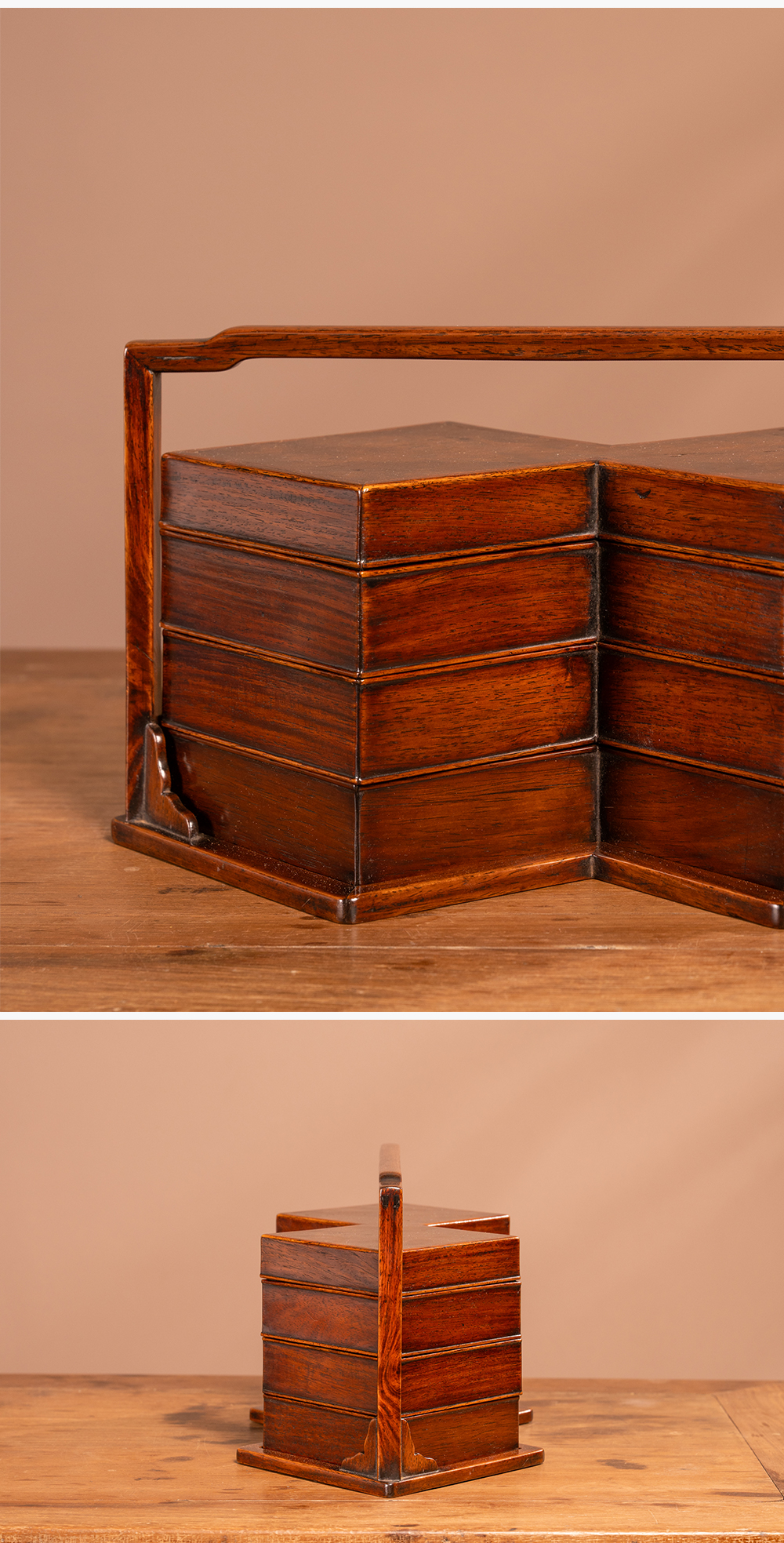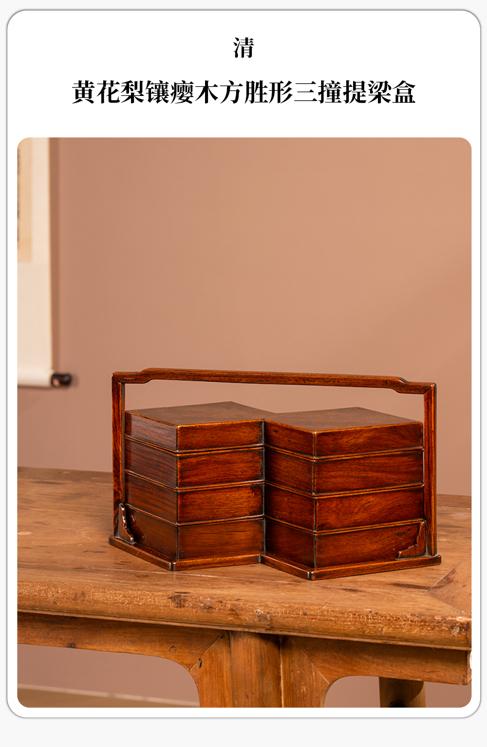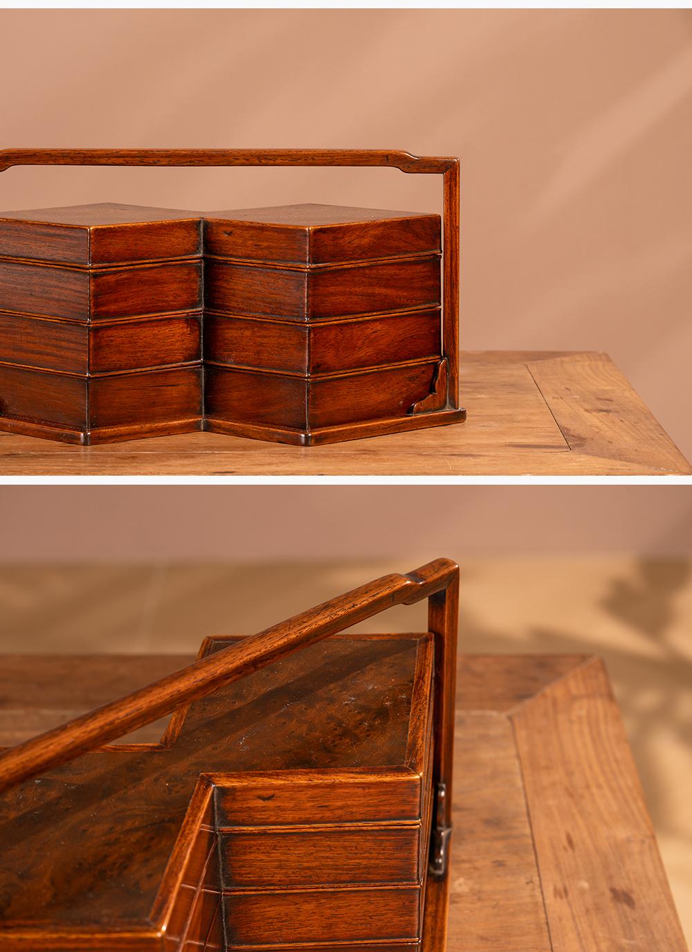 清 黄花梨镶瘿木方胜形三撞提梁盒