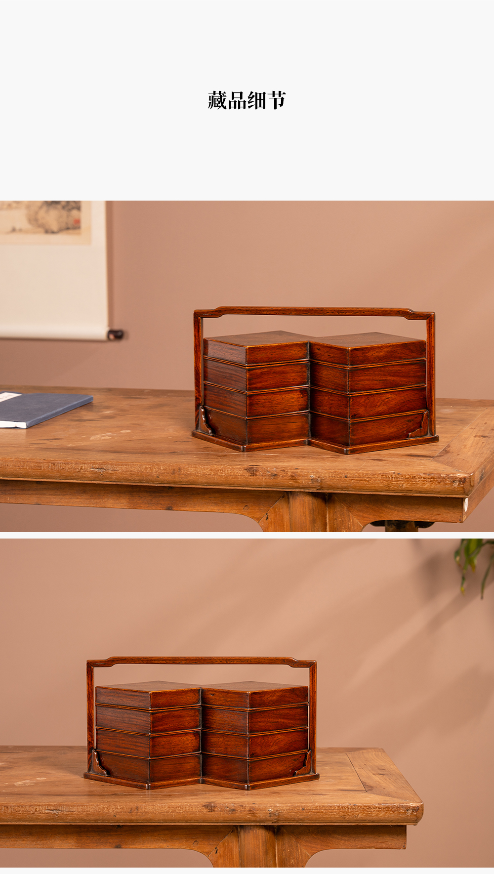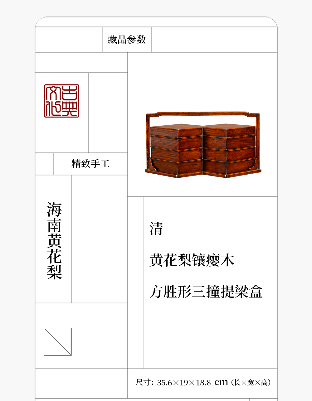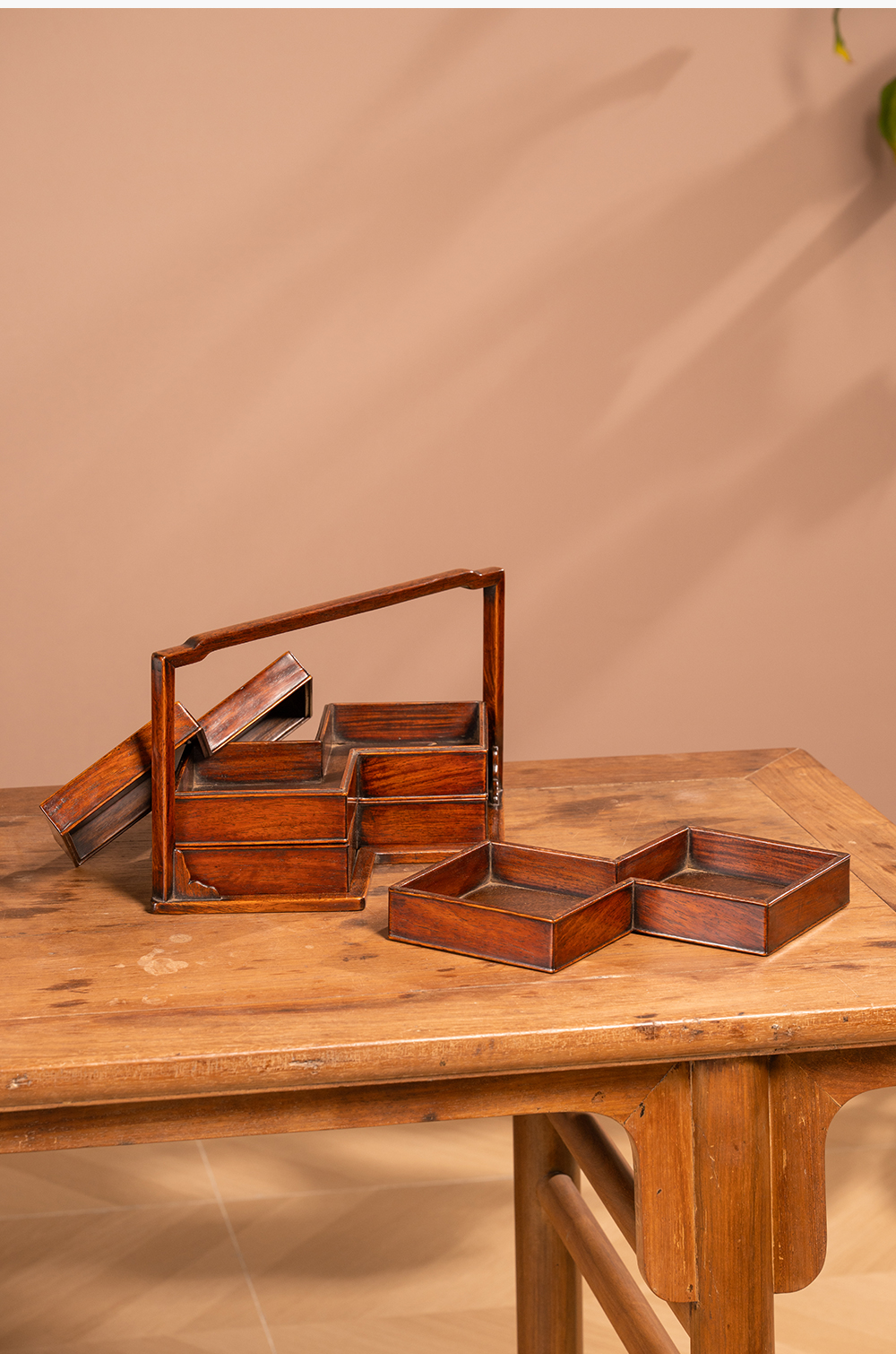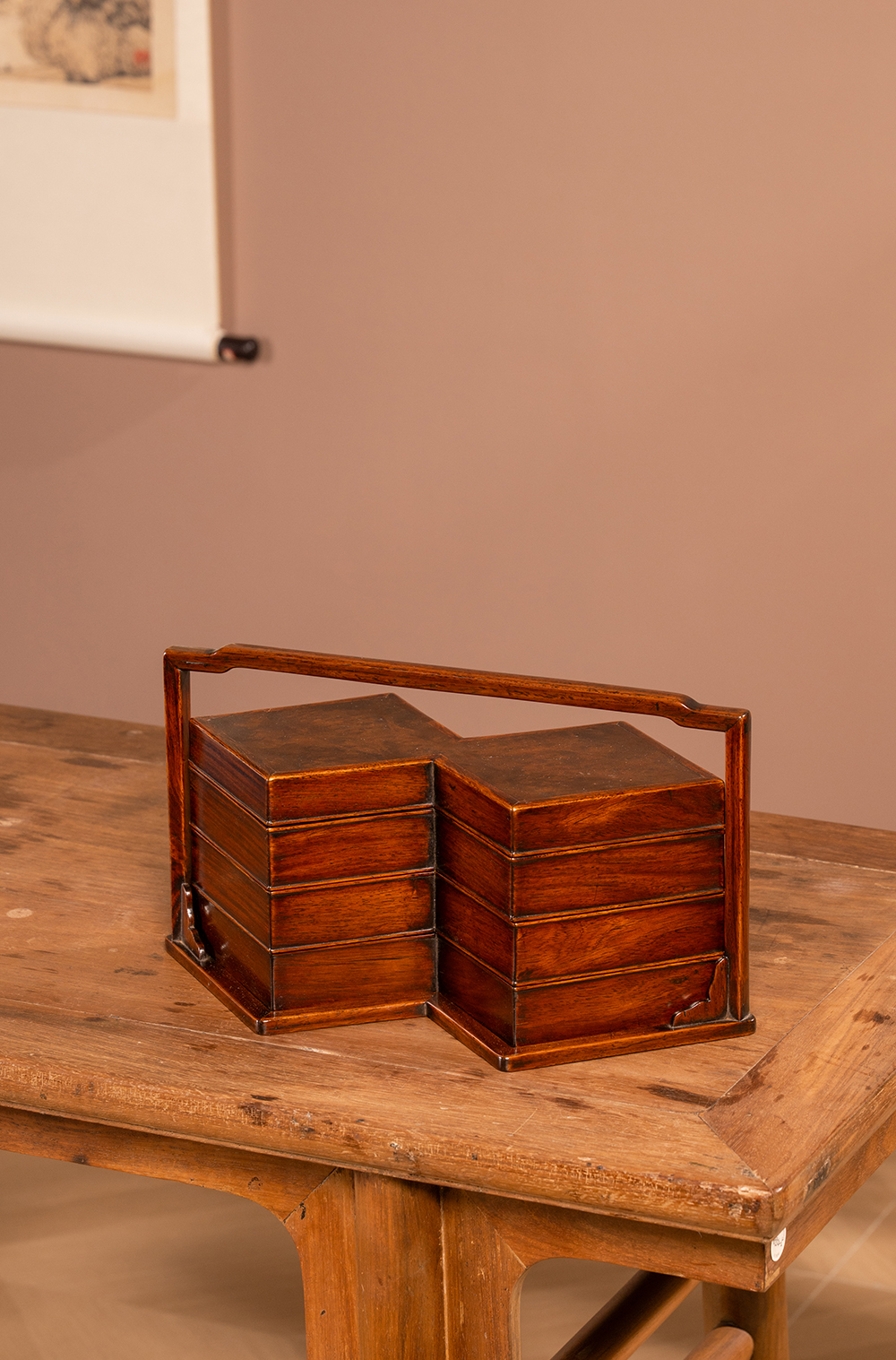 清 黄花梨镶瘿木方胜形三撞提梁盒