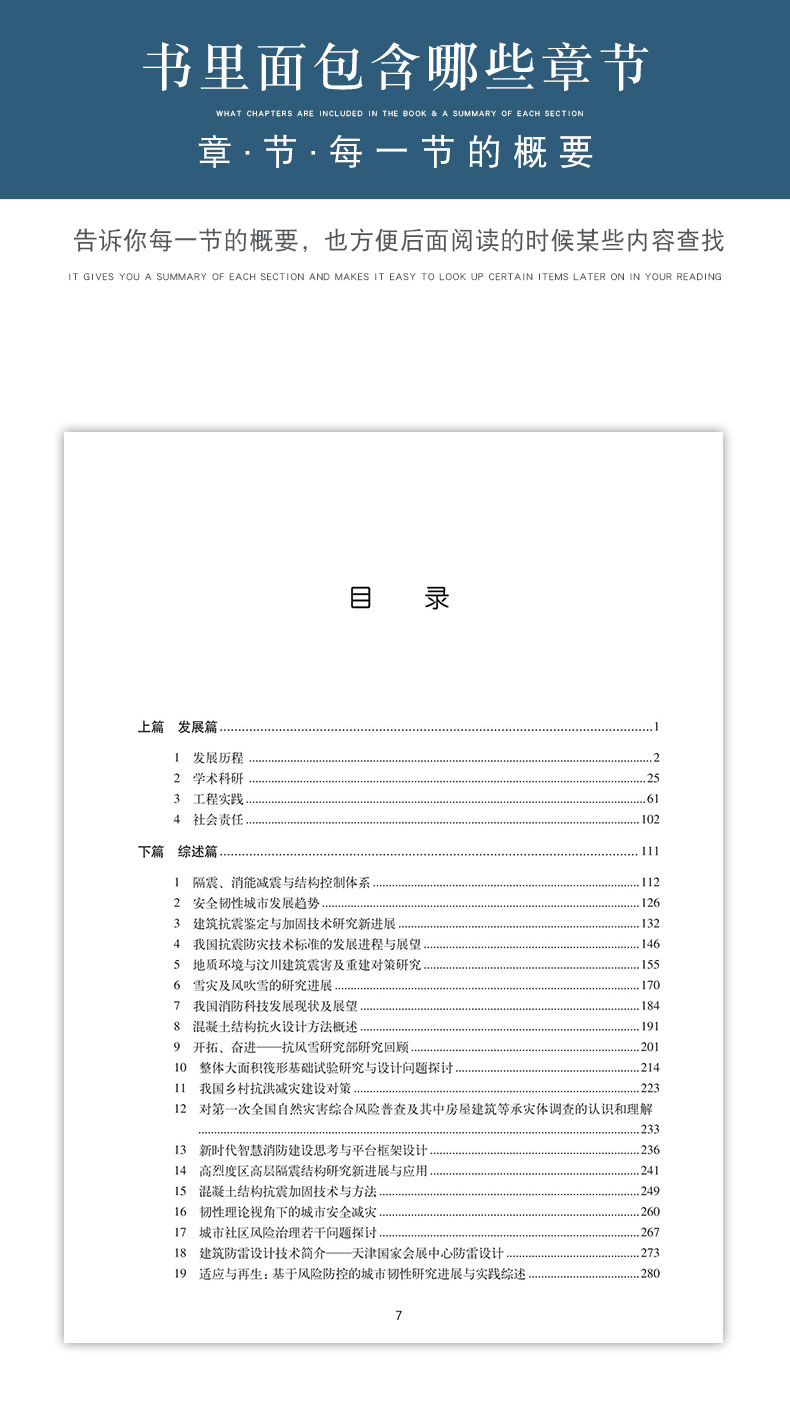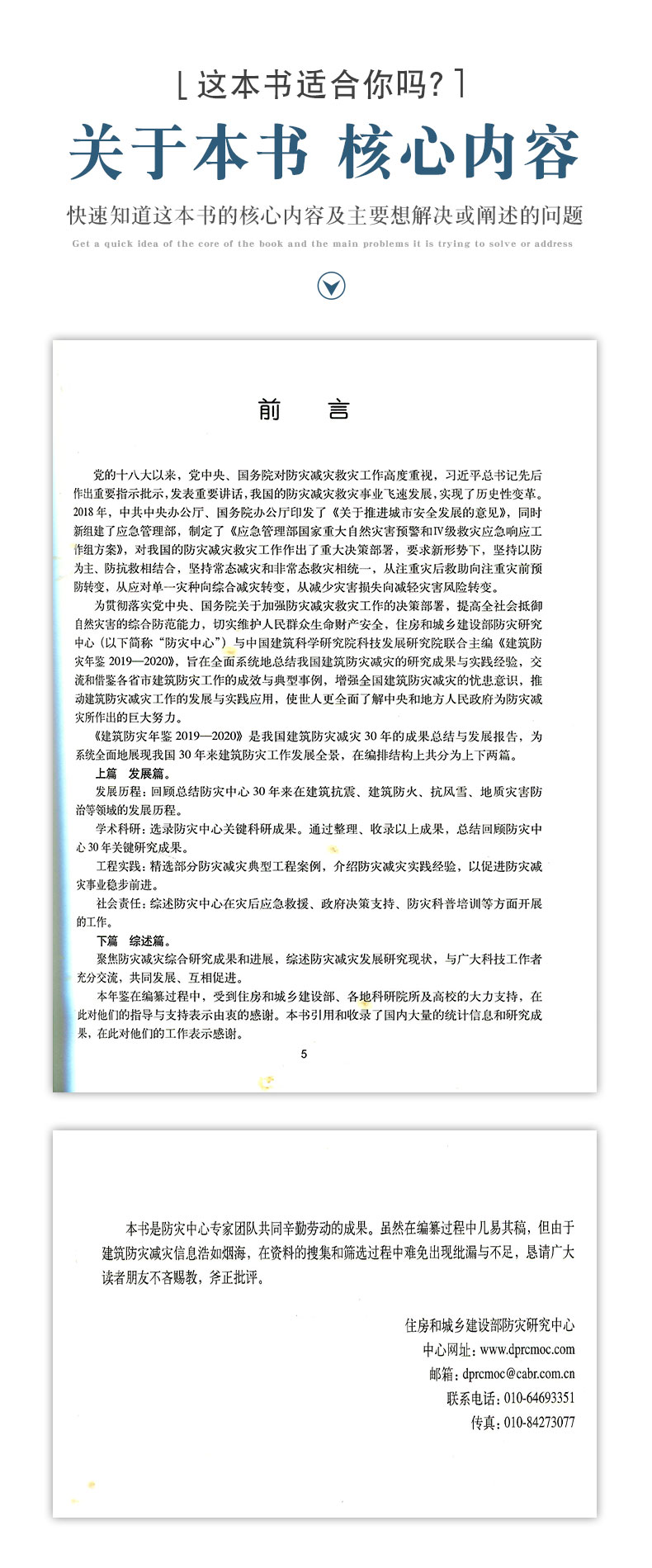 本书稿为住房和城乡建设部防灾研究中心、中国建筑科学研究院科技发展研究院联合主编,其内容包括上篇发展篇和下篇综述篇。其中上篇内容包括:发展历程——回顾总结防灾中心30年来在建筑抗震、建筑防火、抗风雪、地质灾害防治等领域的发展历程;学术科研——选录防灾中心关键科研成果。通过整理、收录以上成果,总结回顾防灾中心30年研究关键研究成果;典型案例——精选防灾减灾典型工程案例,介绍了防灾减灾实践经验,以促进防灾减灾事业稳步前进;社会责任——综述防灾中心在灾后应急救援、政府决策支持、防灾科普培训等方面开展的工作和取得的成果。下篇综述篇主要聚焦防灾减灾综合研究成果和进展,综述防灾减灾发展研究现状。