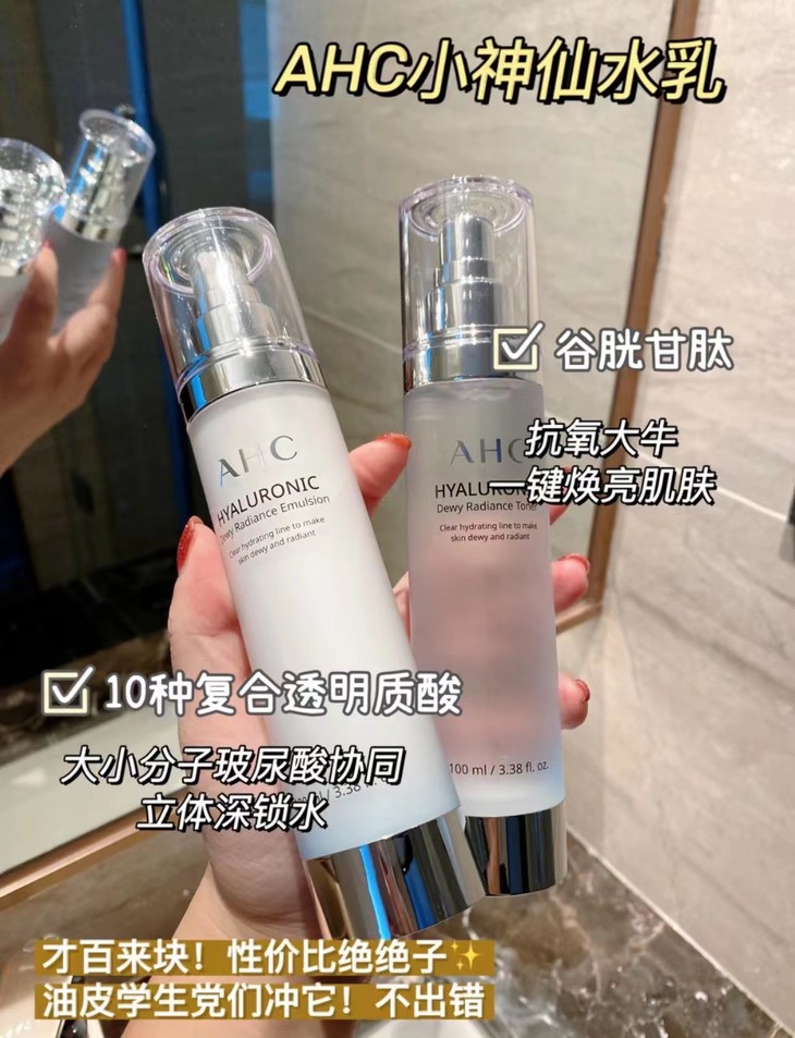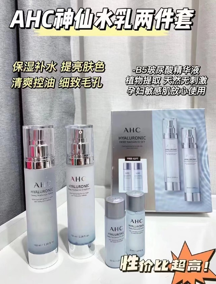 👑AHC 透明质酸补湿神仙水乳套装 👍超级补水紧致皮肤,是一套万能水乳 ⭐有效:保湿补水、提亮肤色、清爽控油、细致毛孔 🌵植物提取,天然无刺激,孕妇敏感肌都可用 💦水的质地稍微浓稠,但很好吸收 ✨乳白色的乳液质地,流动性很好,上脸不粘腻 💎“油皮”夏天用超适合,清爽不粘腻! 【套盒包括】:水乳各100ml+水乳各30ml