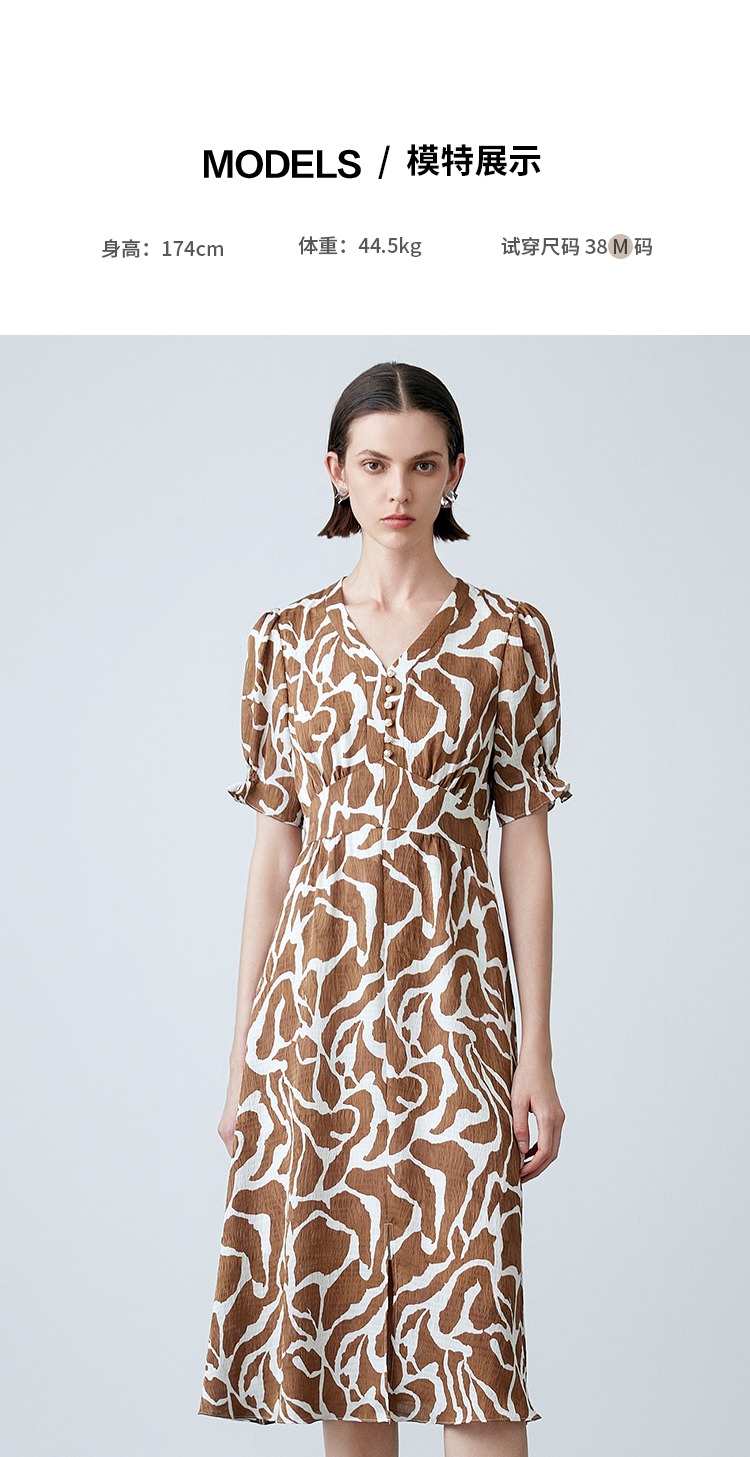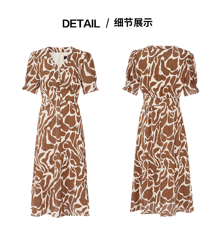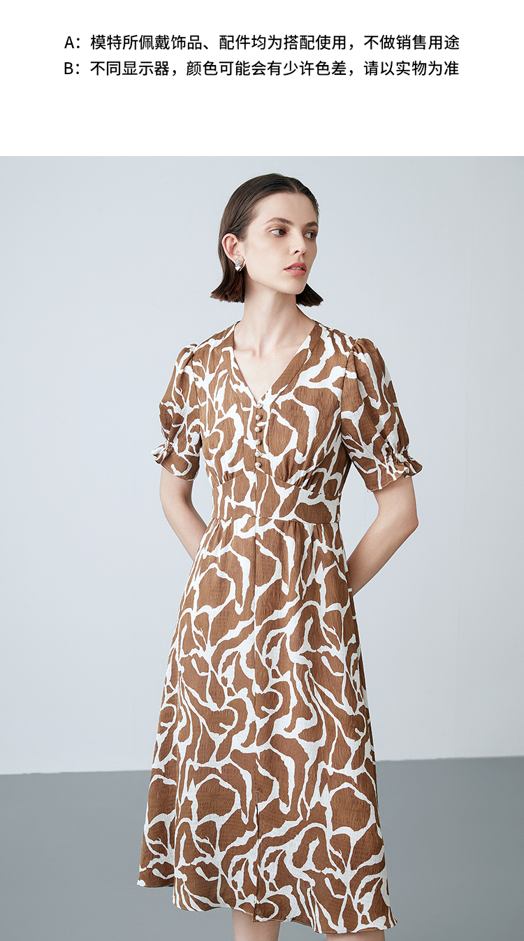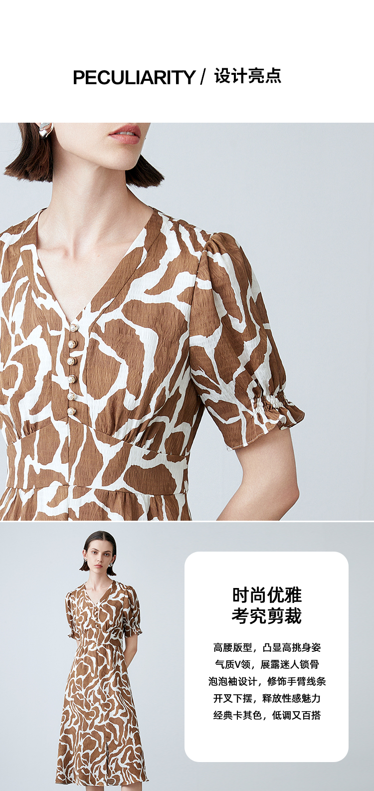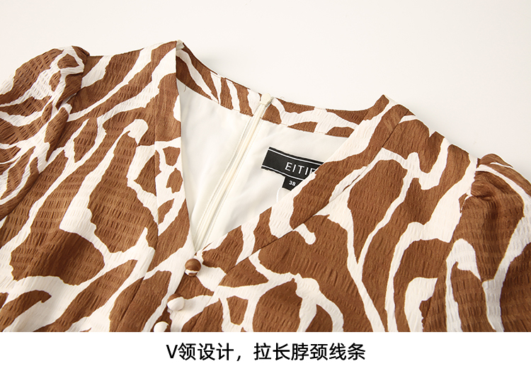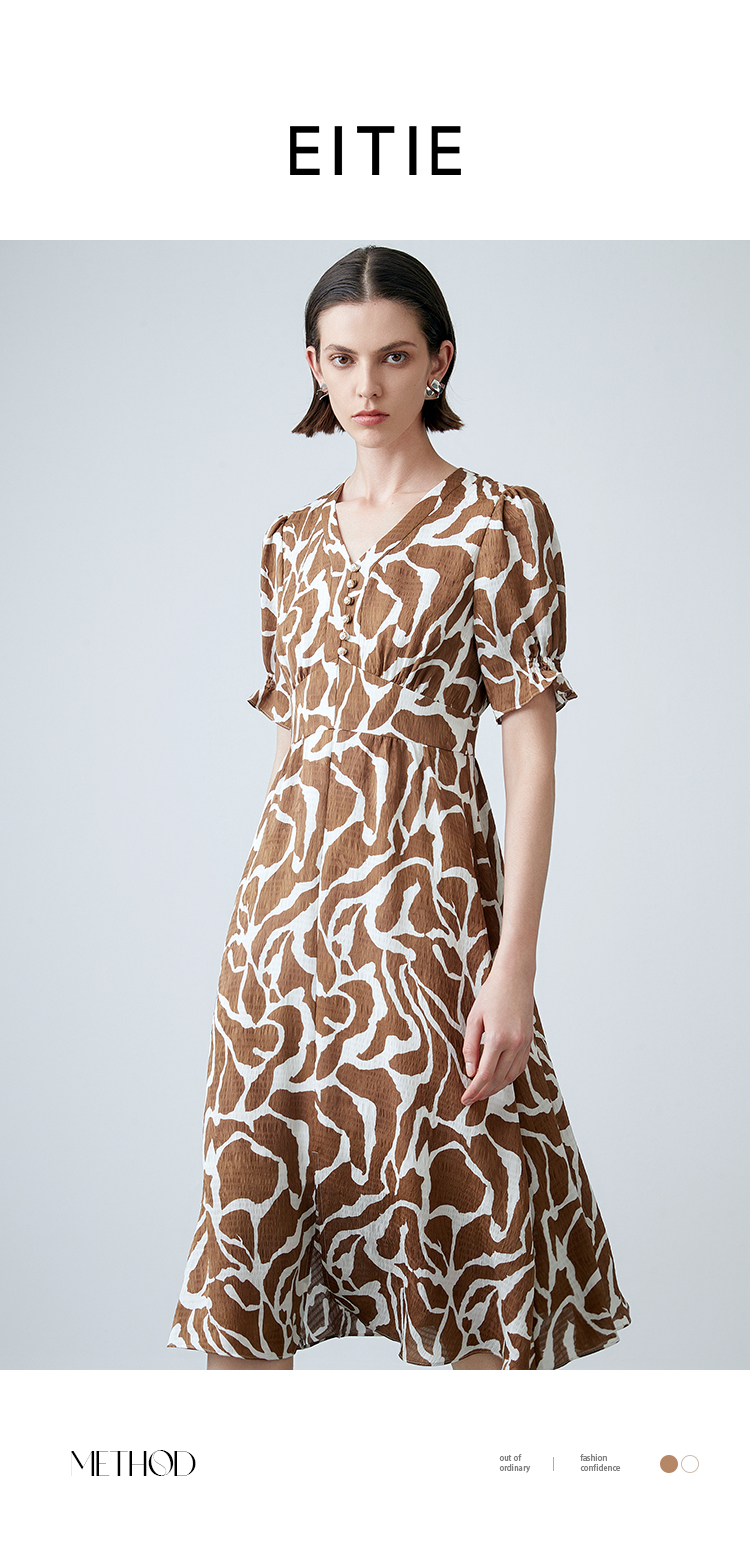 EITIE爱特爱夏季新款V领收腰泡泡袖印花显瘦连衣裙7807544