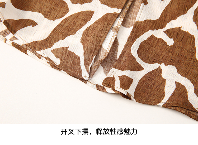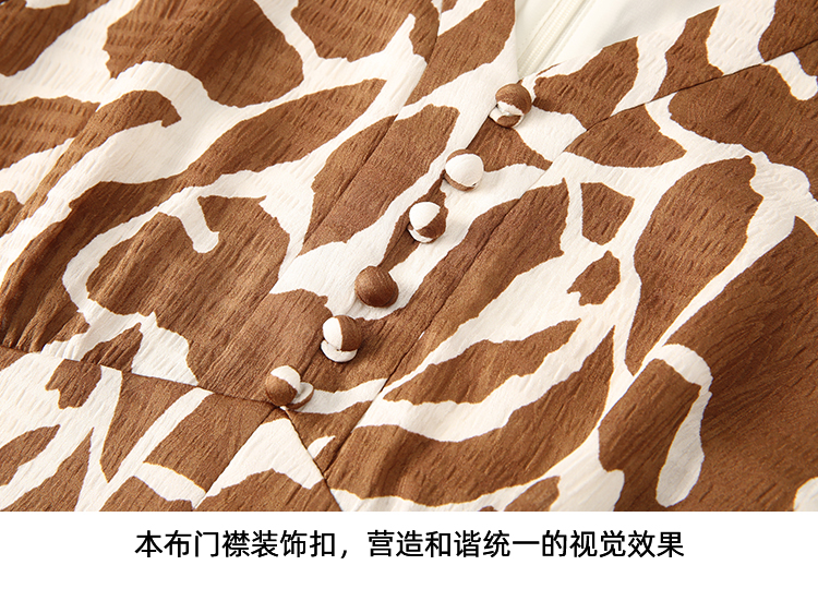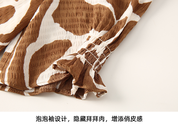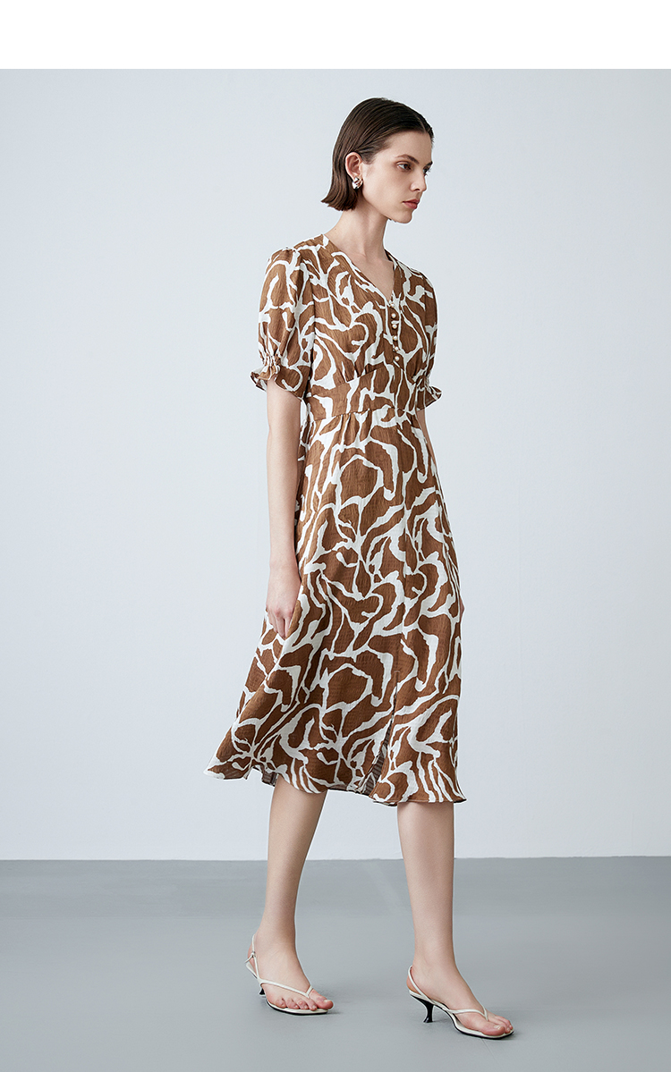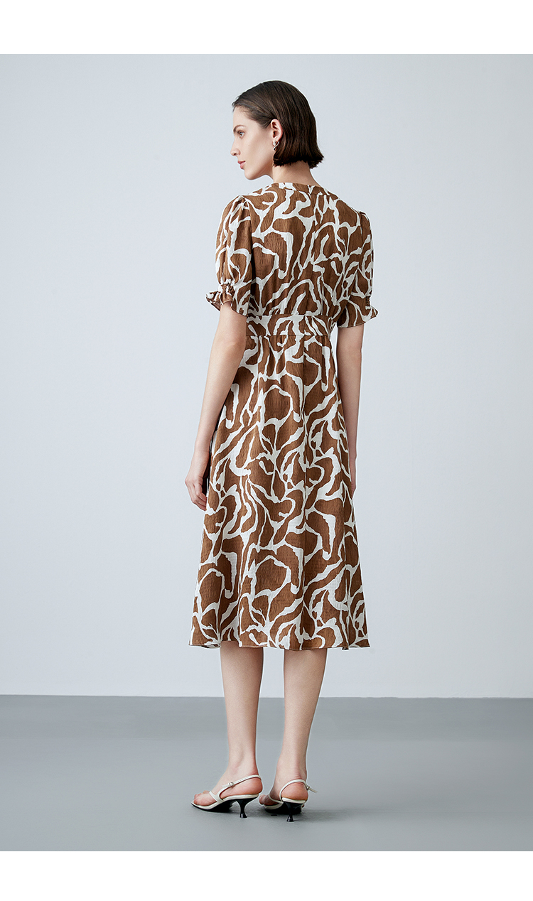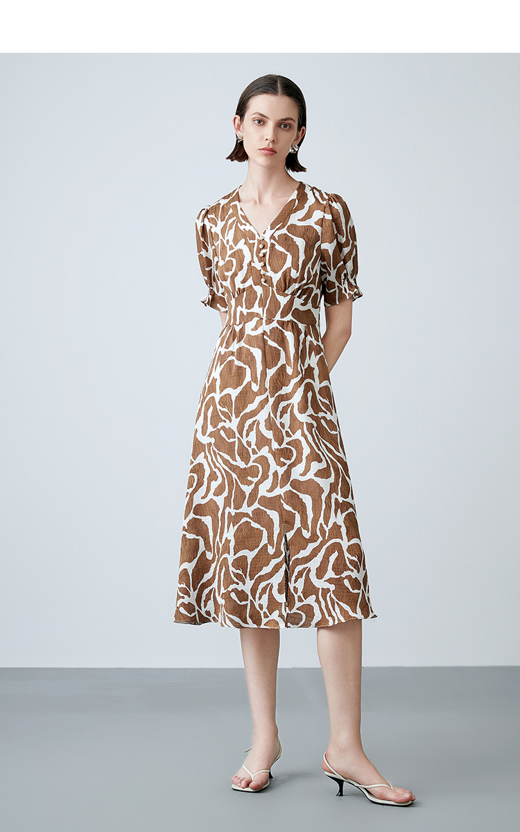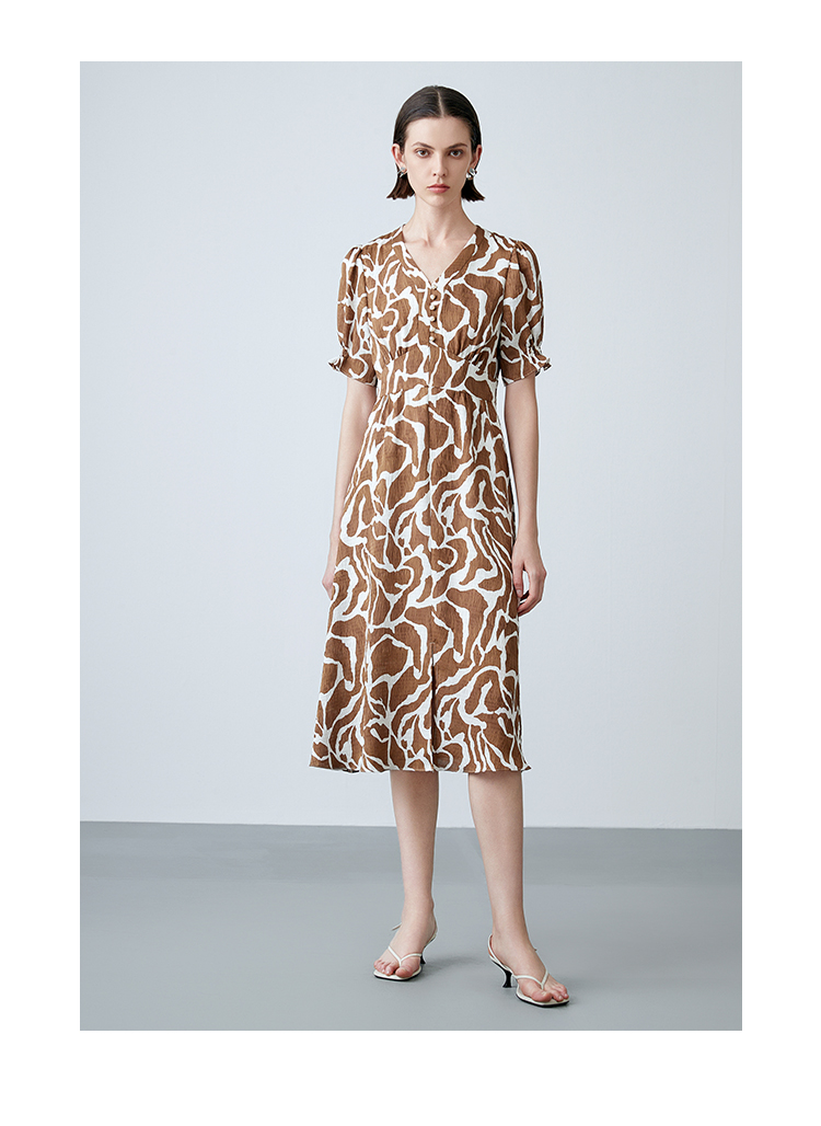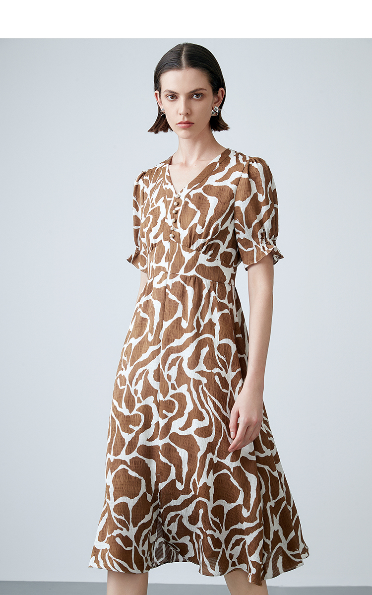 EITIE爱特爱夏季新款V领收腰泡泡袖印花显瘦连衣裙7807544