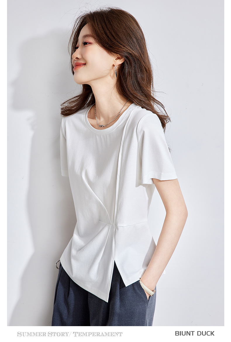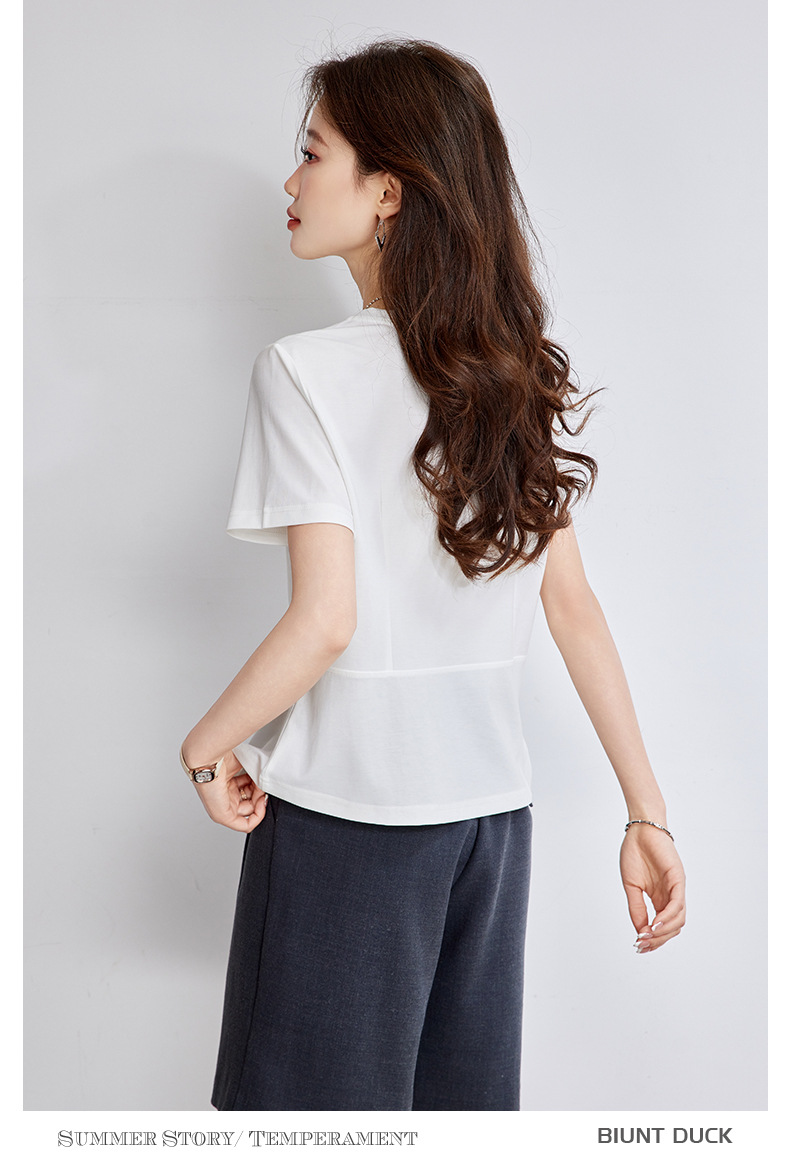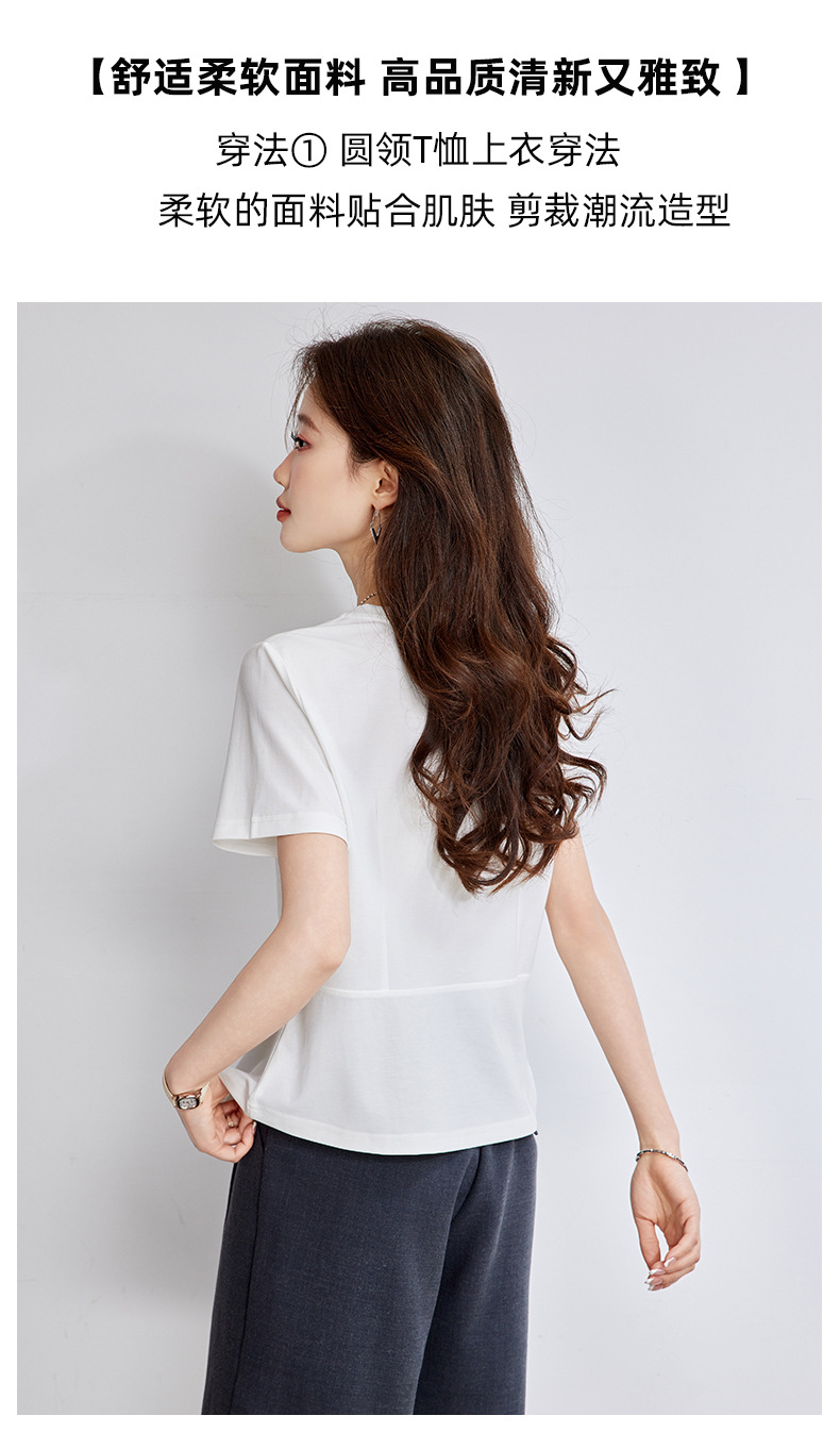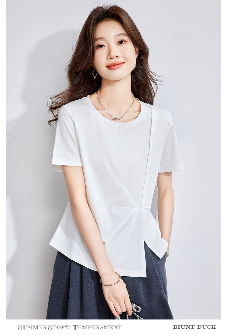 莫代尔白色圆领t恤,正肩修身型设计感遮肚小个子上衣CC-66-87018