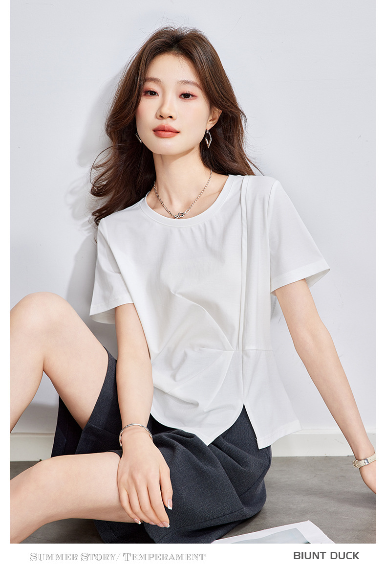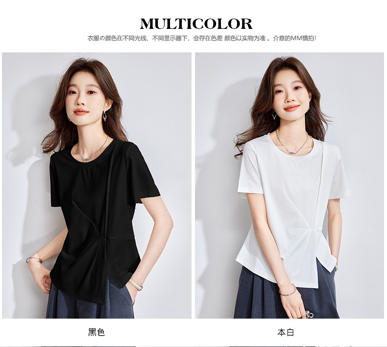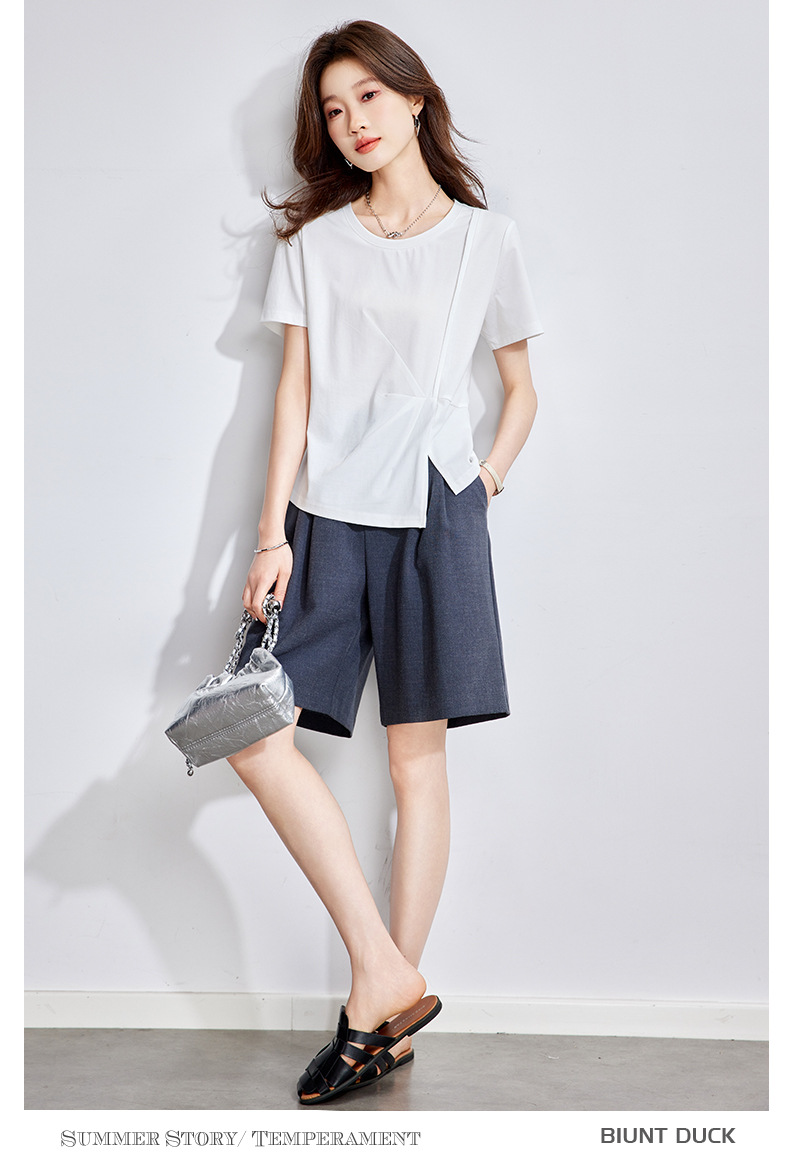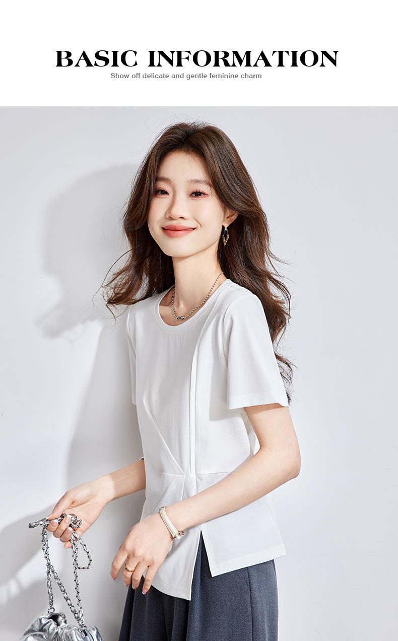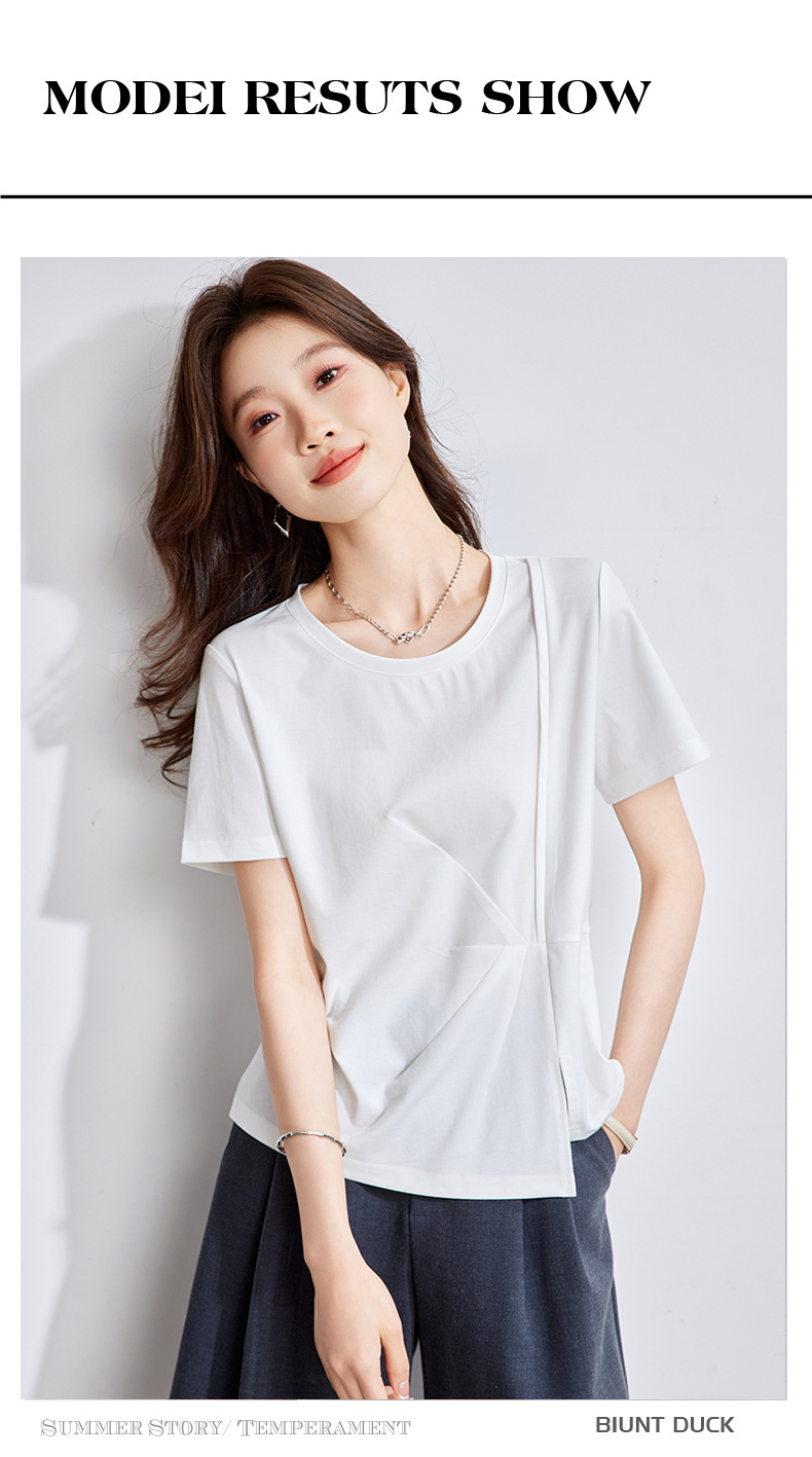 莫代尔白色圆领t恤,正肩修身型设计感遮肚小个子上衣CC-66-87018