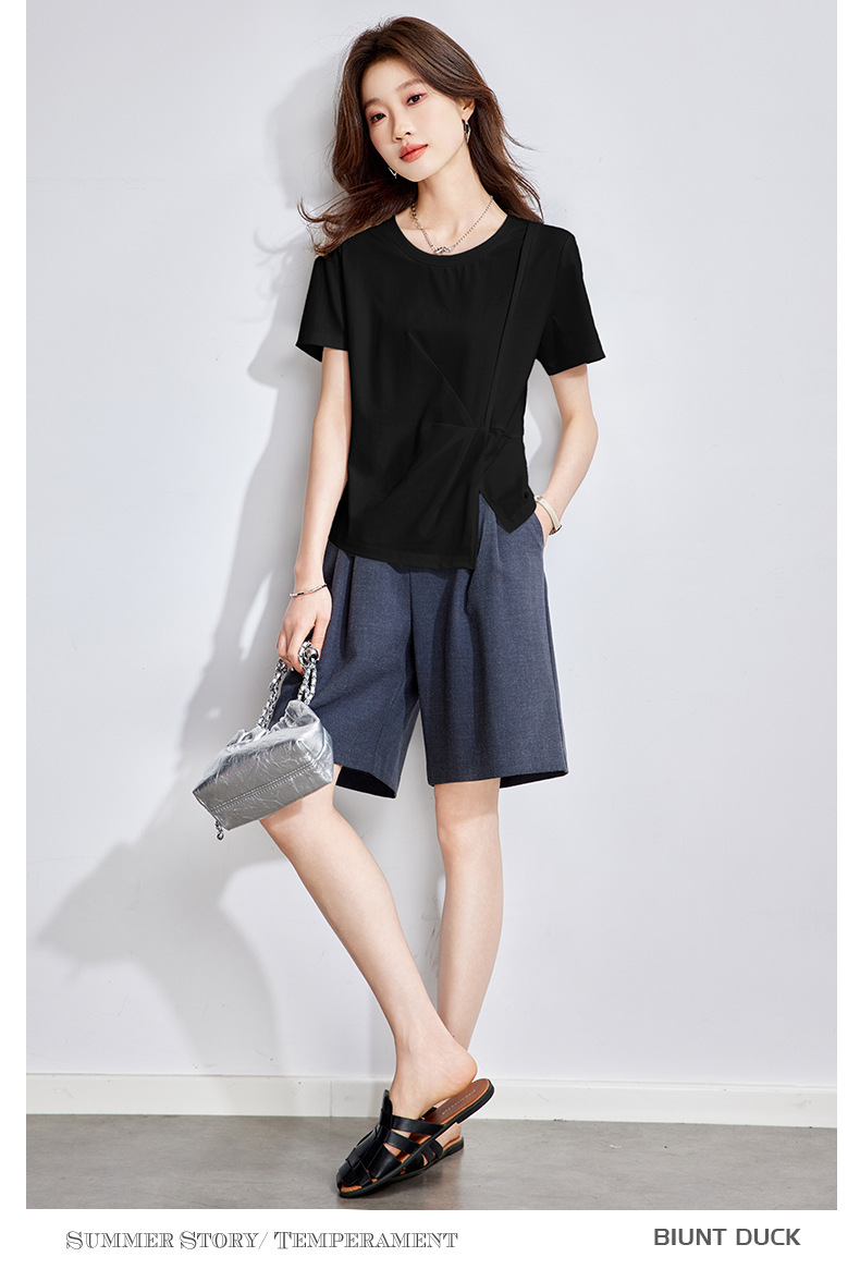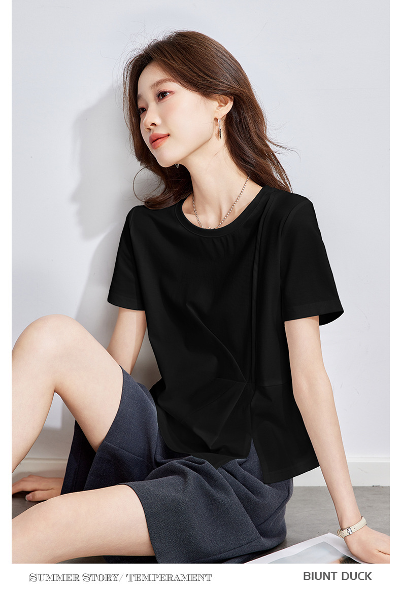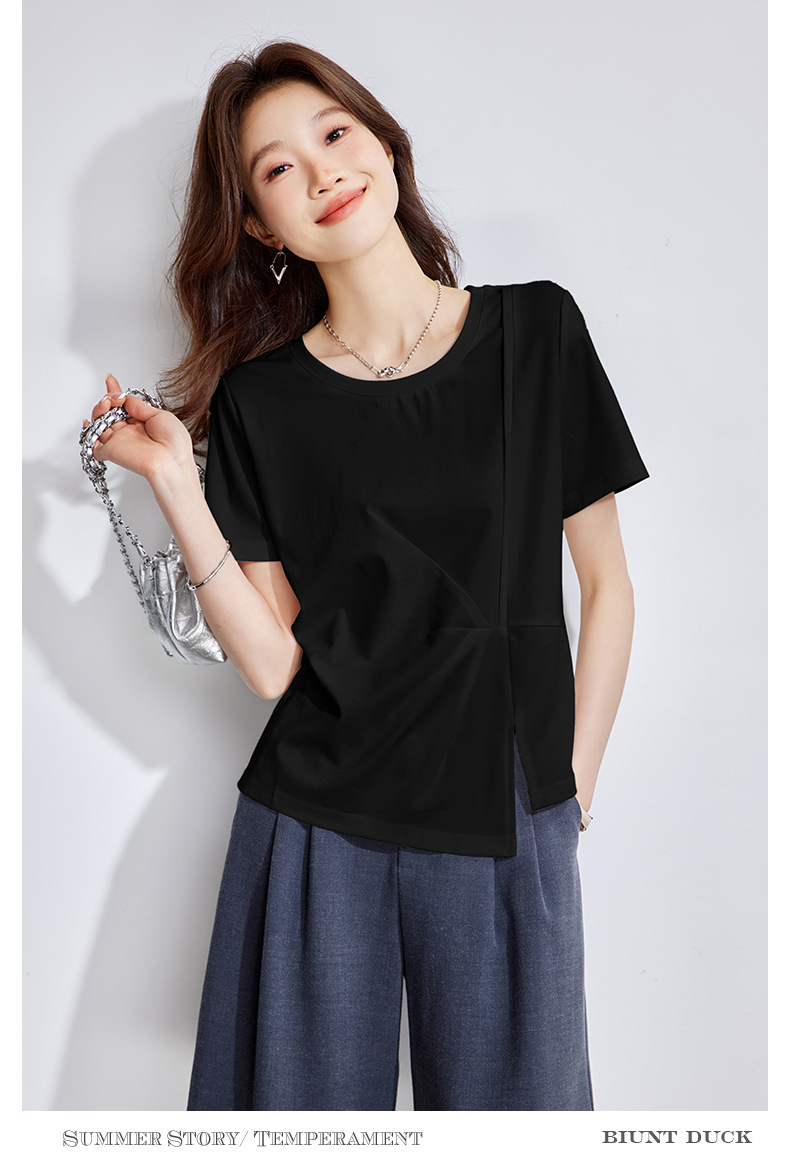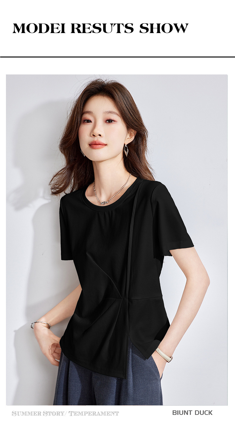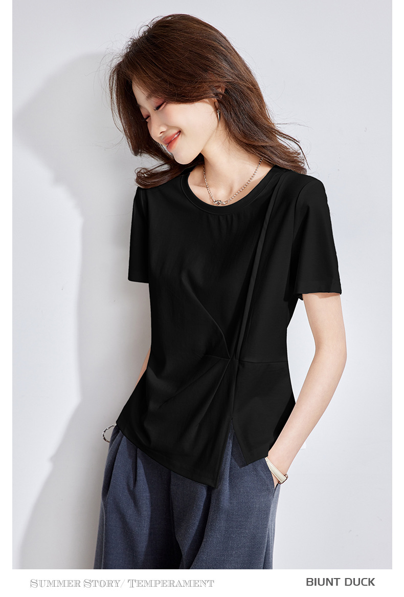 莫代尔白色圆领t恤,正肩修身型设计感遮肚小个子上衣CC-66-87018