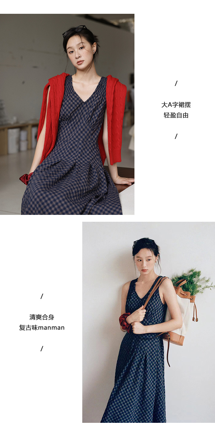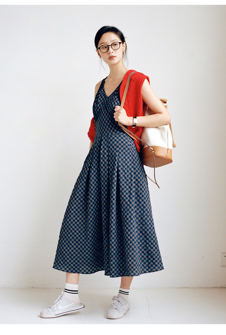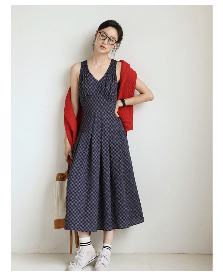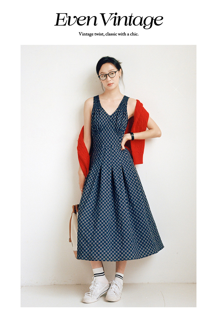 Even Vintage | 文艺复古 格纹经典v领无袖背心收腰长裙连衣裙