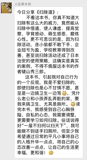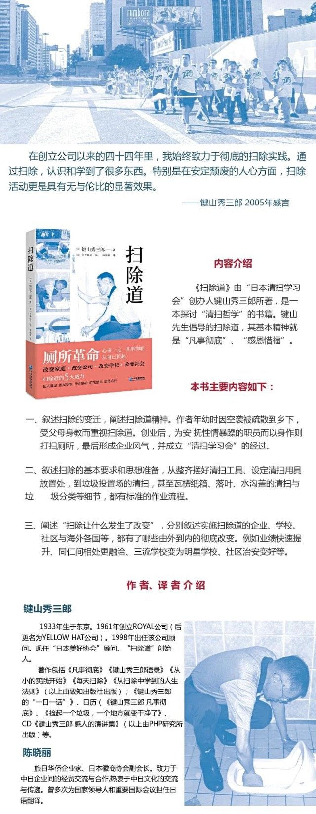 键山先生这本《扫除道》(包括漫画版)讲的是如何通过打扫厕所改变家庭、改变公司、改变学校、改变社会的“方法”。键山先生说,自创立公司以来,四十多年间自己始终致力于彻底的扫除实践。深知这一活动,能够让周围的环境变得清洁,尤其是在安定浮躁的人心和磨练心性方面有着极佳的效果,其中也蕴藏着复兴国家的强大力量。