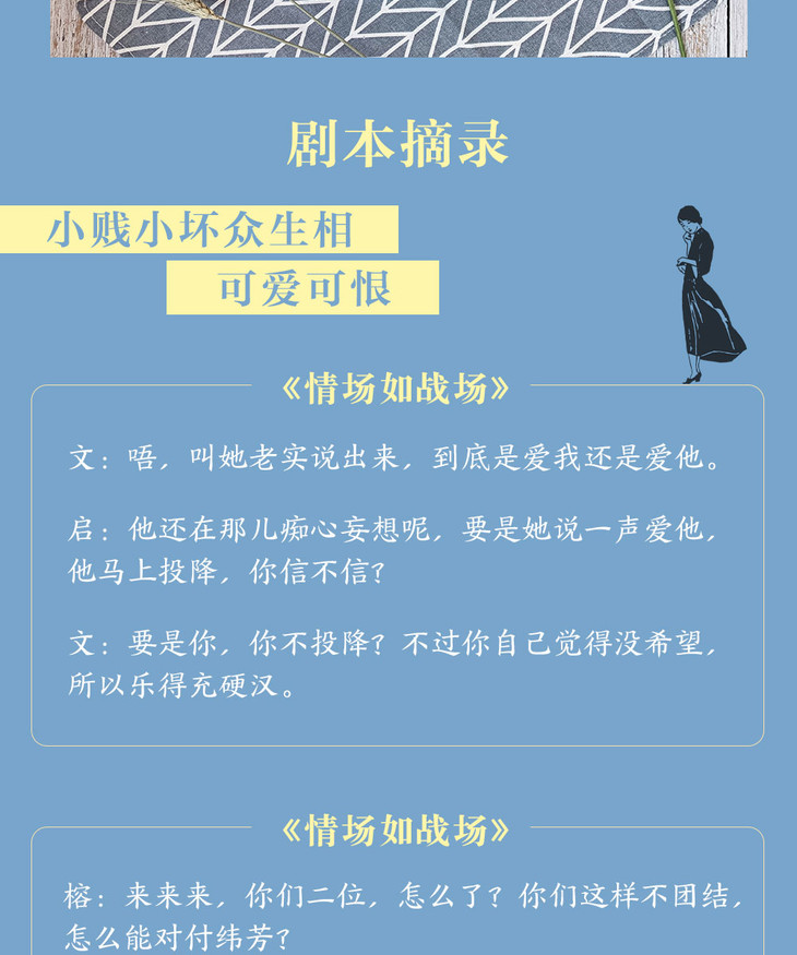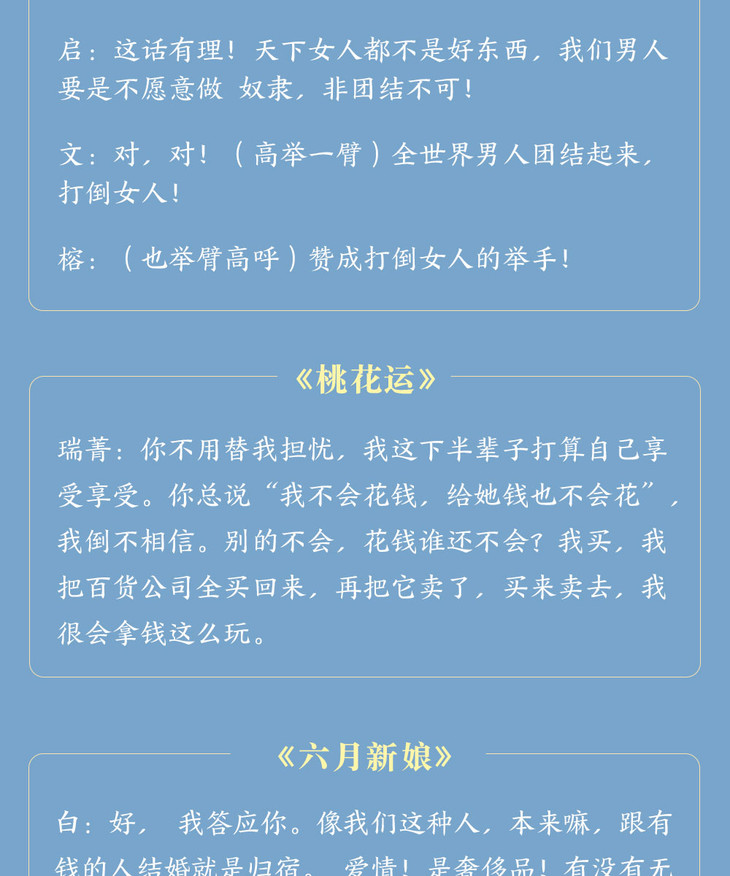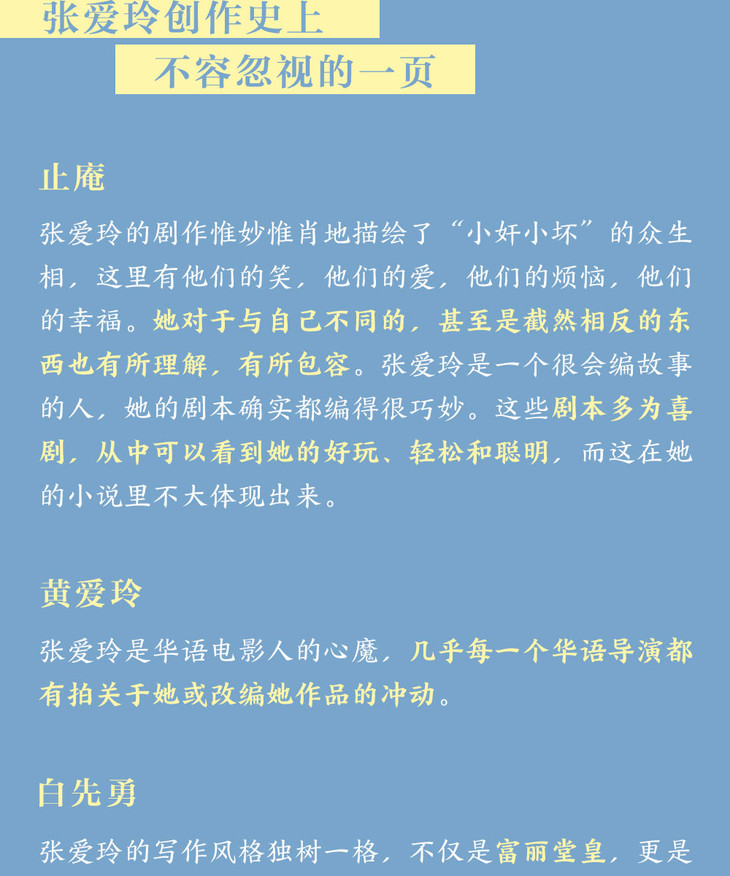 *张爱玲的剧作惟妙惟肖地描绘了“小奸小坏”的众生相,这里有他们的笑,他们的爱,他们的烦恼,他们的幸福。张爱玲对此有很深的理解。可以说这些剧本展现了张爱玲的另一面:她并不像很多人想象的那样孤芳自赏,她对于与自己不同的,甚至是截然相反的东西也有所理解,有所包容。其次,张爱玲是一个很会编故事的人,她的剧本确实都编得很巧妙。这些剧本多为喜剧,从中可以看到她的好玩、轻松和聪明,而这在她的小说里不大体现出来。——止庵
