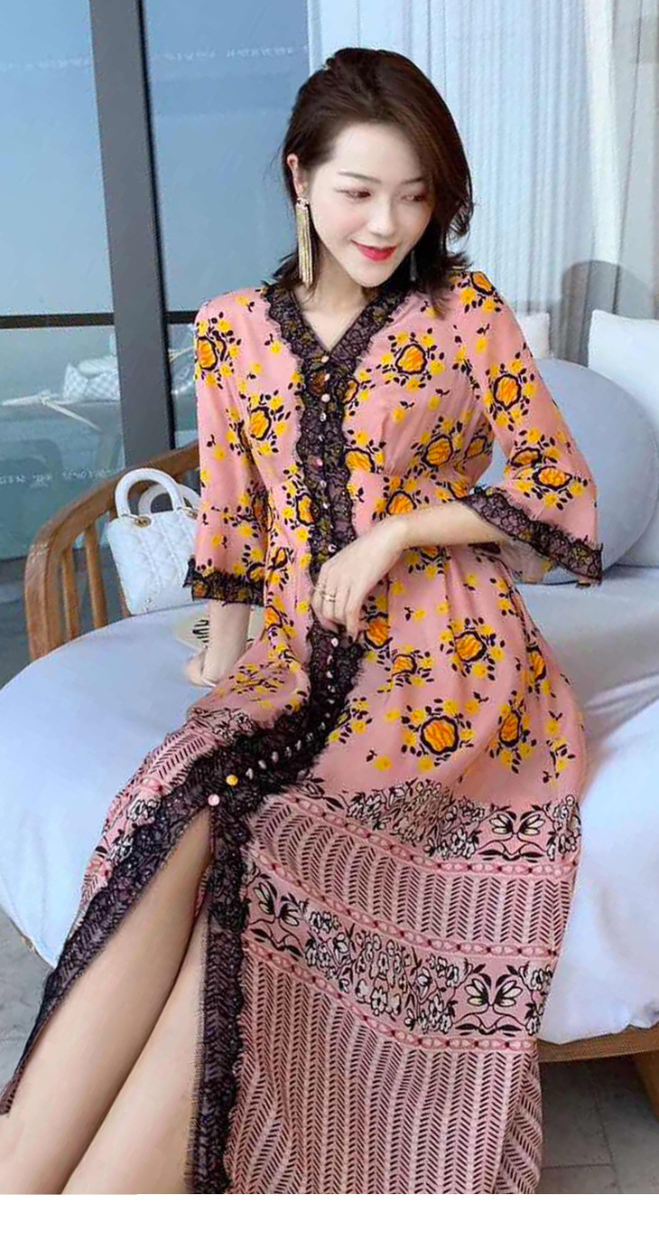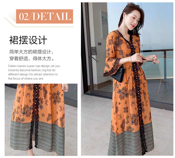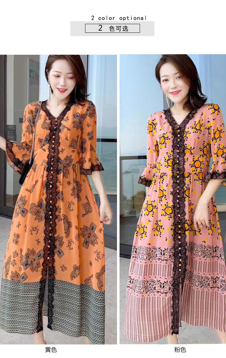 NSM1888 真丝连衣裙2021夏季新款时尚V领喇叭袖定位印花侧口袋桑蚕丝裙子