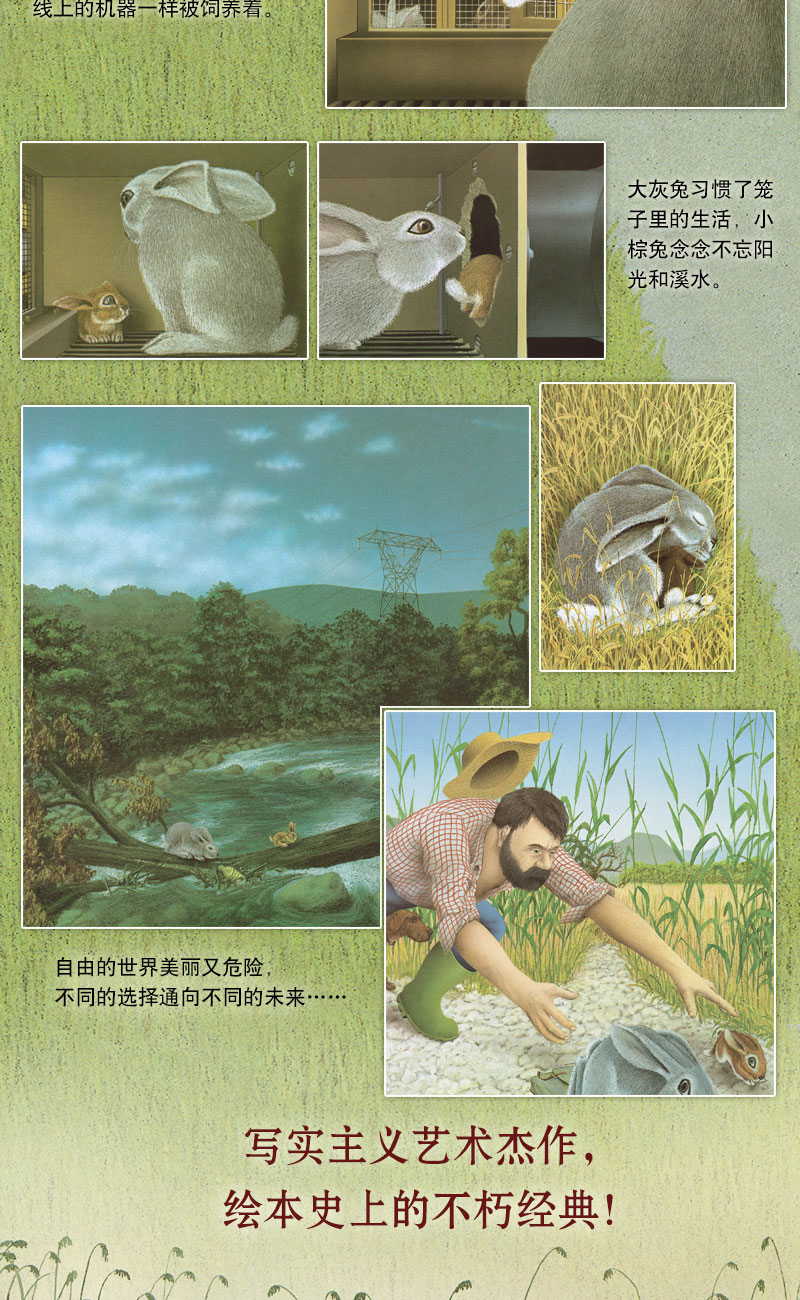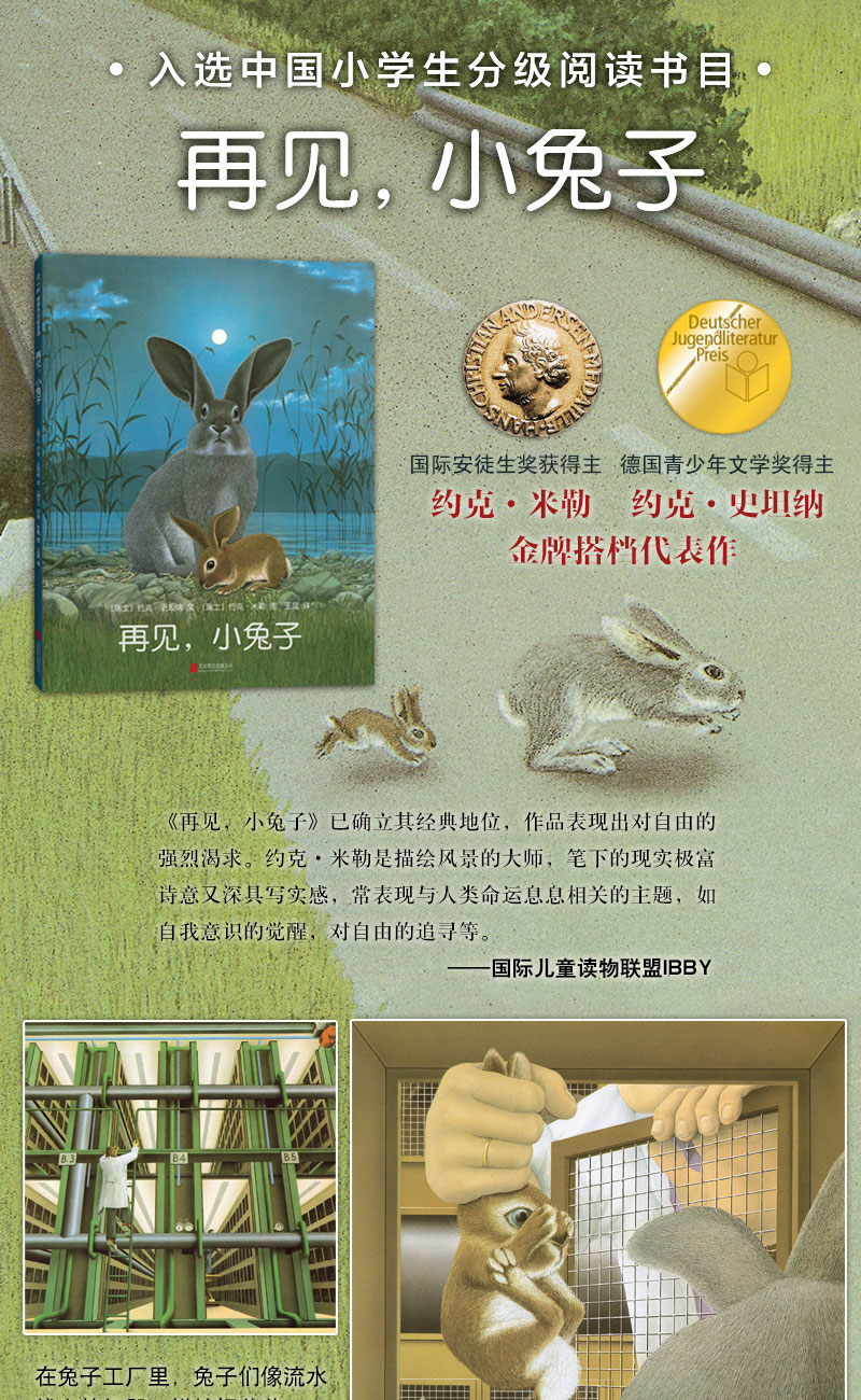 画家约克·米勒笔下的大自然令人神往,无论是月光笼罩下的朦胧夜色,还是清新明丽的乡村风景,都带给人勃勃生机的感觉,与兔子工厂里的冰冷和机械形成鲜明的对比。本书借用一个隐喻的形式,引导人们去思考生活的惯性和出发的梦想。