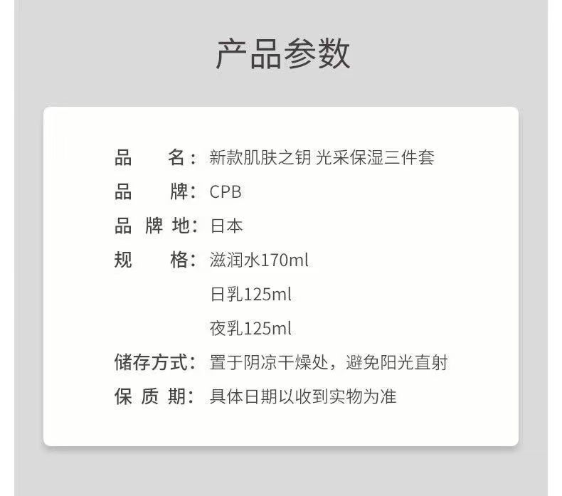 【春日福利】新版 CPB肌肤之钥 光采赋活水乳三件套(精华水170ml+日间修护乳125ml+夜间修护乳125ml)
