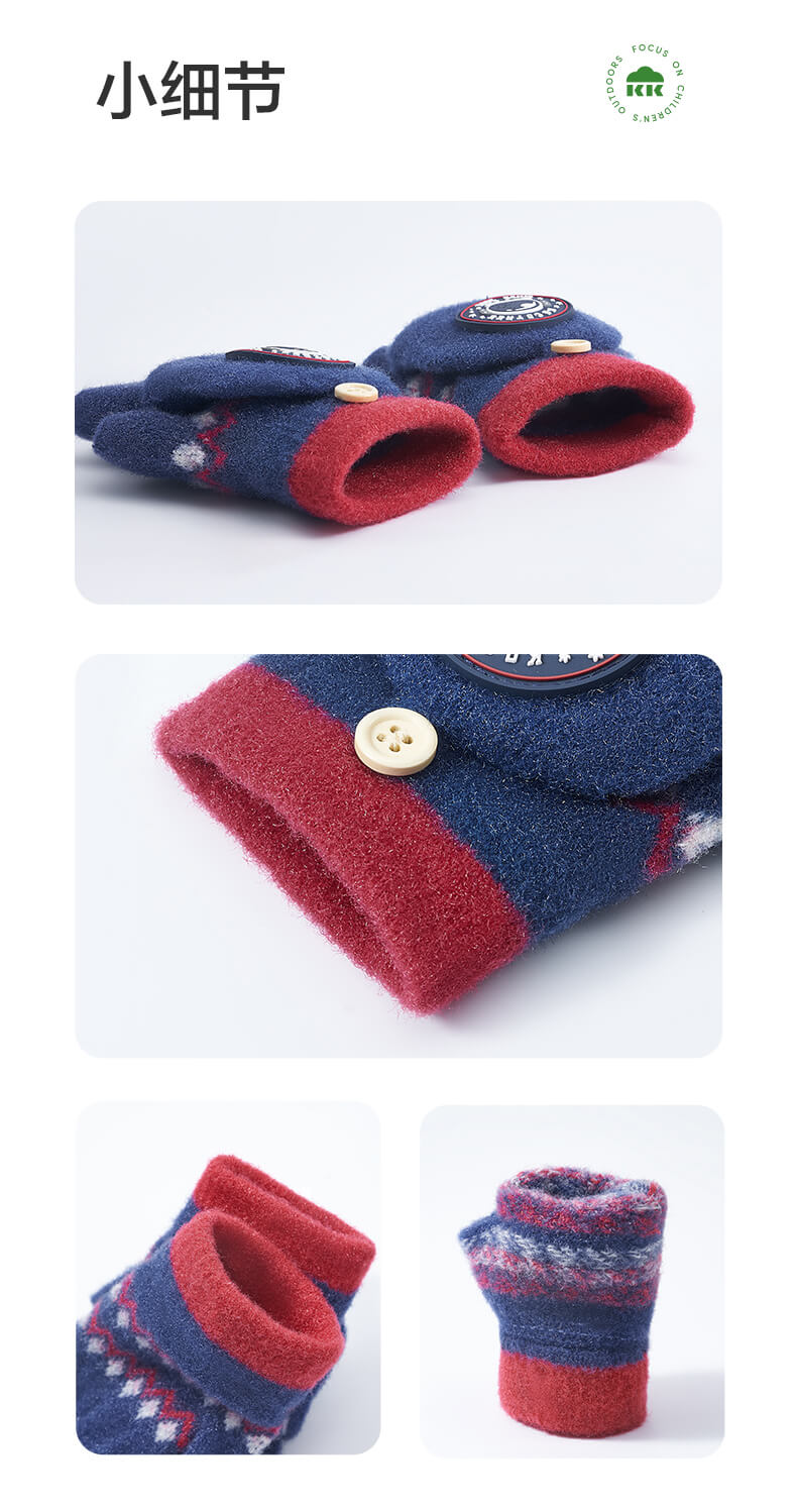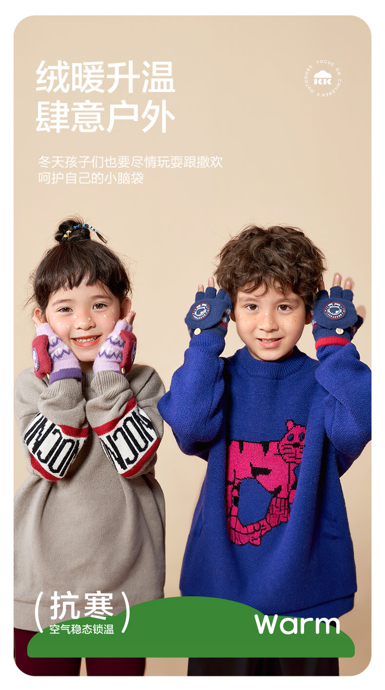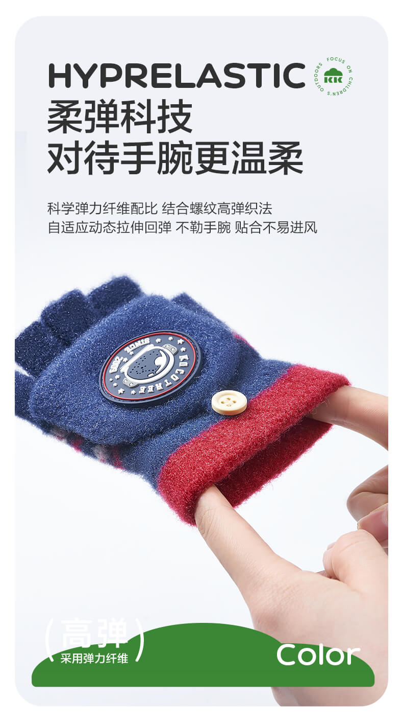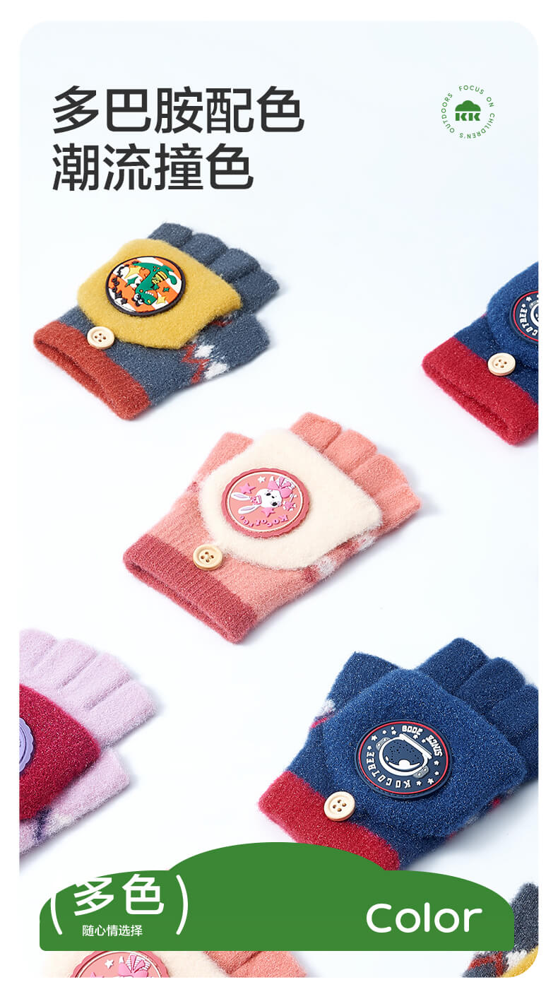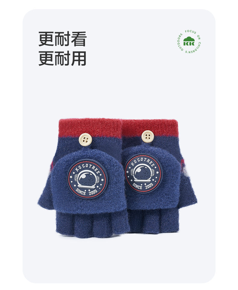 KK树儿童手套冬男童女童五指保暖翻盖宝宝春秋小孩专用小学生针织暖化冬日翻盖纽扣手套