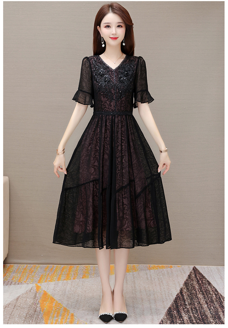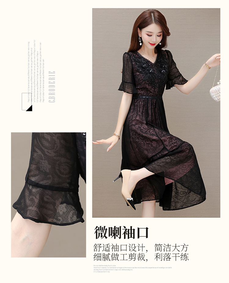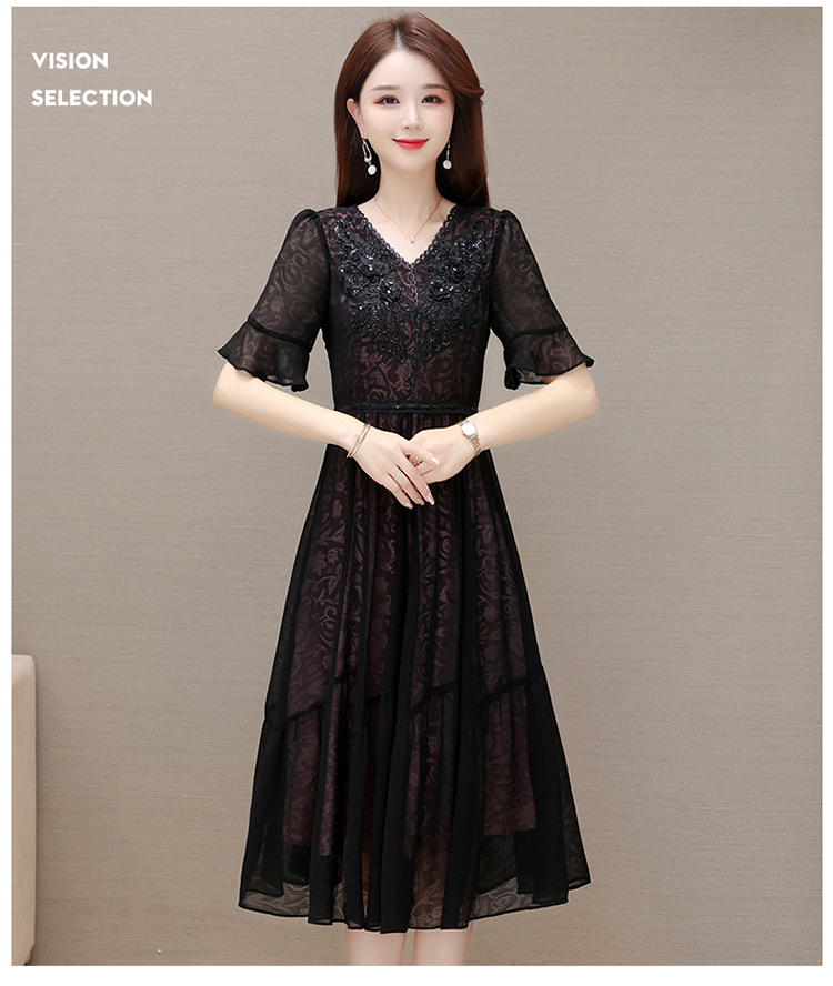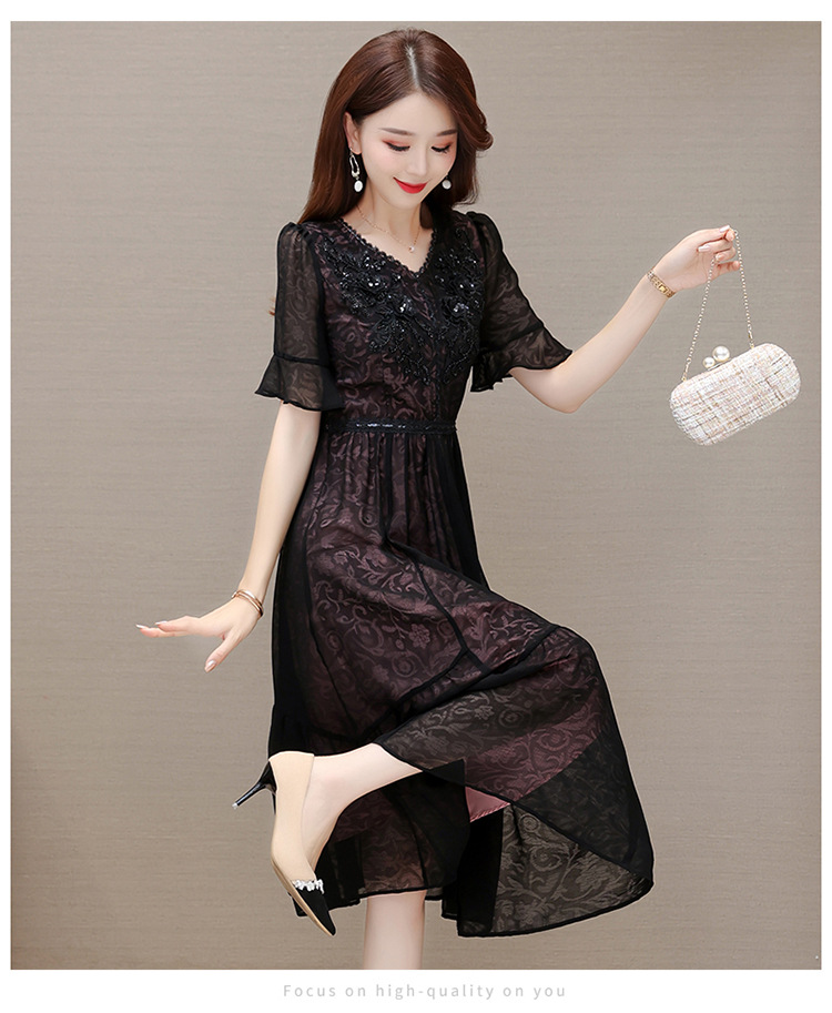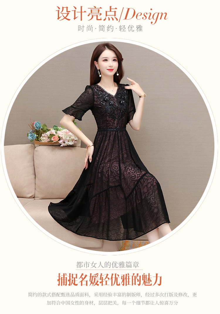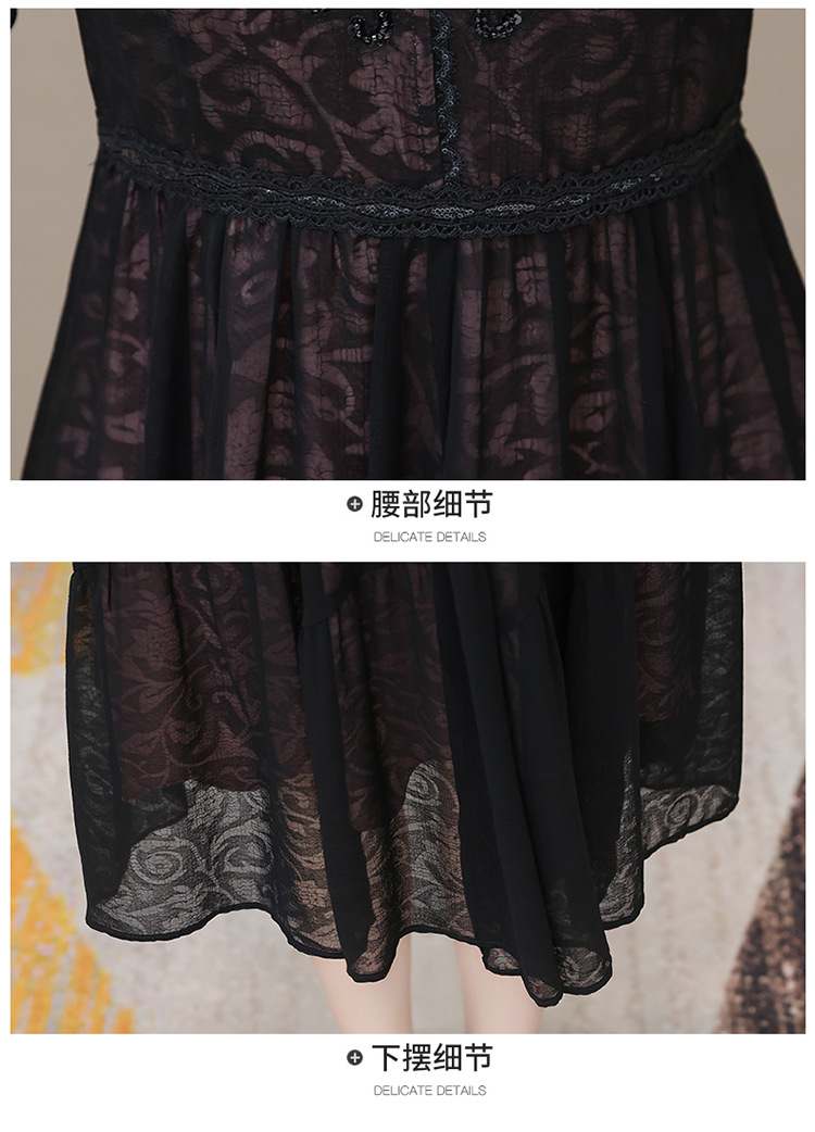时尚妈妈装黑色高腰提花大摆A字裙喇叭袖连衣裙QYM-HSY-E23A009-Y