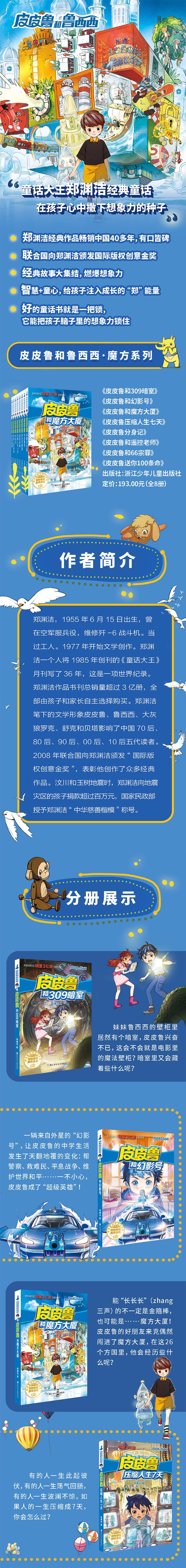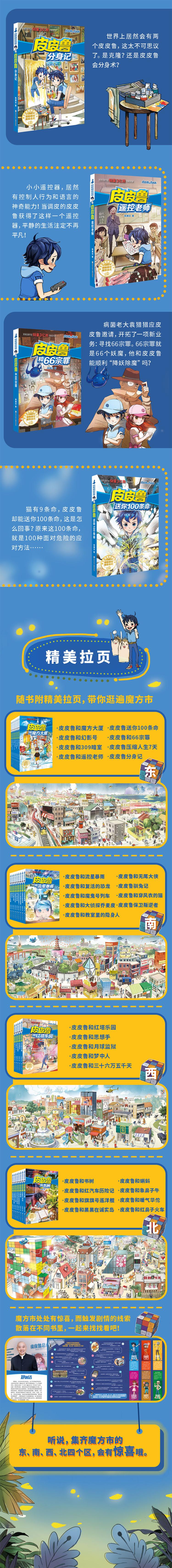 本套装为郑渊洁“皮皮鲁和鲁西西经典童话系列”第一辑(即魔方系列),内含《皮皮鲁和魔方大厦》《皮皮鲁和幻影号》《皮皮鲁遥控老师》等经典郑渊洁童话作品8册,童话大王郑渊洁将用天马行空的想象,带领孩子进入神奇瑰丽的童话世界。《皮皮鲁分身记》:世界上居然会有两个皮皮鲁,这可太不可思议了。是克隆?还是皮皮鲁会分身术?《皮皮鲁和309暗室》:妹妹鲁西西的壁柜里居然有个暗室,皮皮鲁兴奋不已,这会不会就是电影里的魔法壁柜?暗室里又会藏着些什么呢? 《皮皮鲁和66宗罪》:病菌老大袁猎猎应皮皮鲁邀请,开拓了一项新业务:寻找66宗罪。66宗罪就是66个妖魔,他和皮皮鲁能顺利“降妖除魔”吗?《皮皮鲁和魔方大厦》:能“长长长”(zhang三声)的不一定是金箍棒,也可能是……魔方大厦!皮皮鲁的好朋友来克偶然闯进了魔方大厦,在这26个国城里,他会经历些什么呢?《皮皮鲁送你100条命》:猫有9条命,皮皮鲁却能送你100条......
