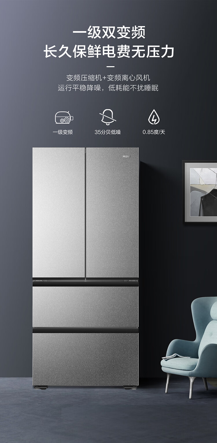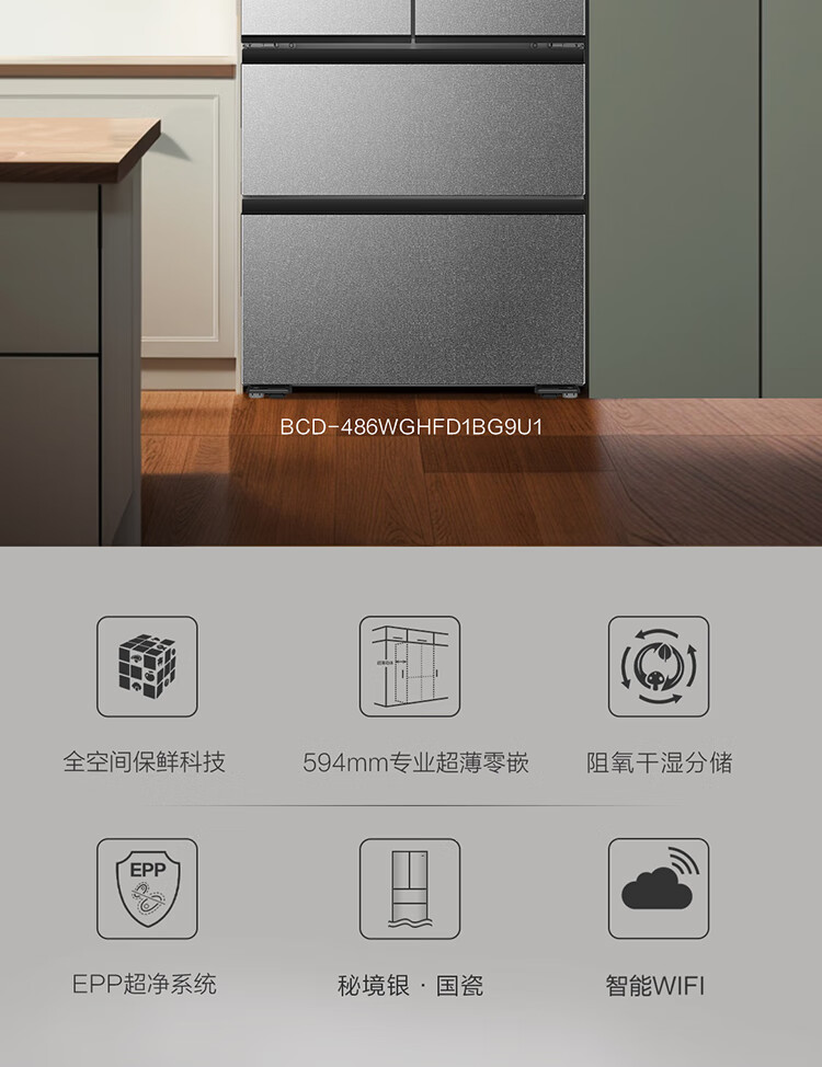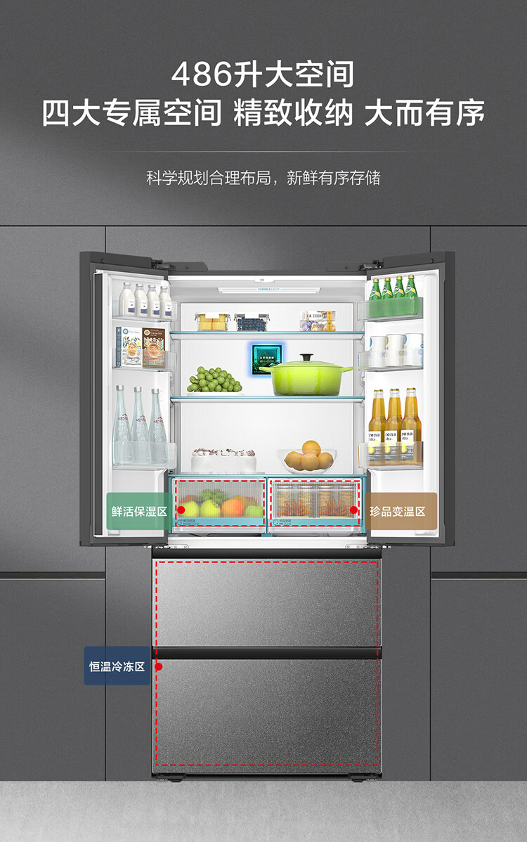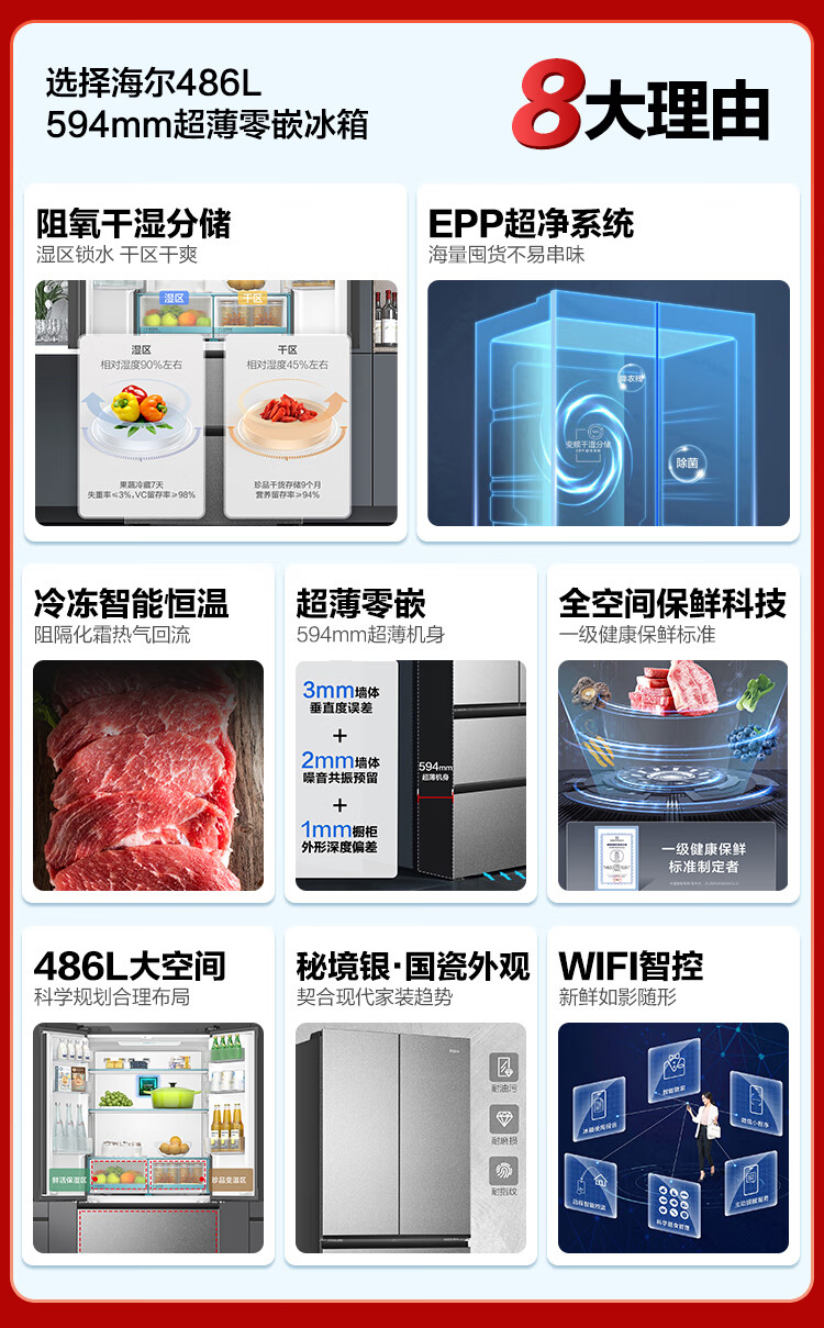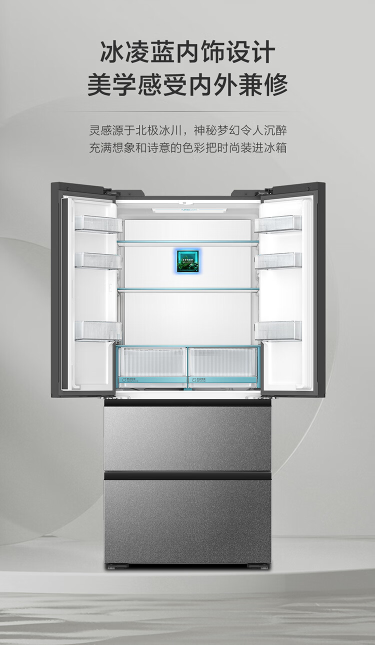 海尔冰箱486升594mm超薄嵌入式法式四开门多门一级能效风冷无霜全空间保鲜大容量底部散热家用家电冰箱 486L+EPP超净系统+阻氧干湿分储+联网智控