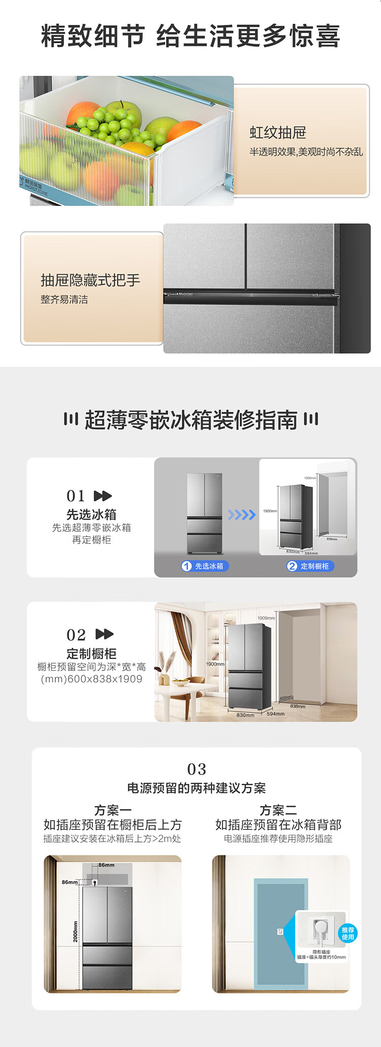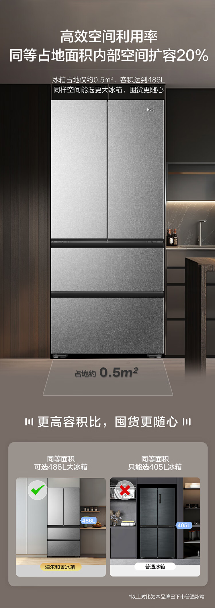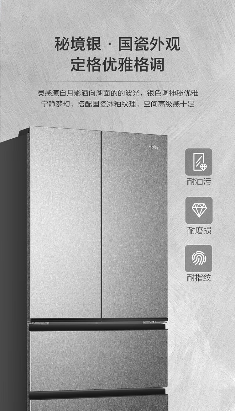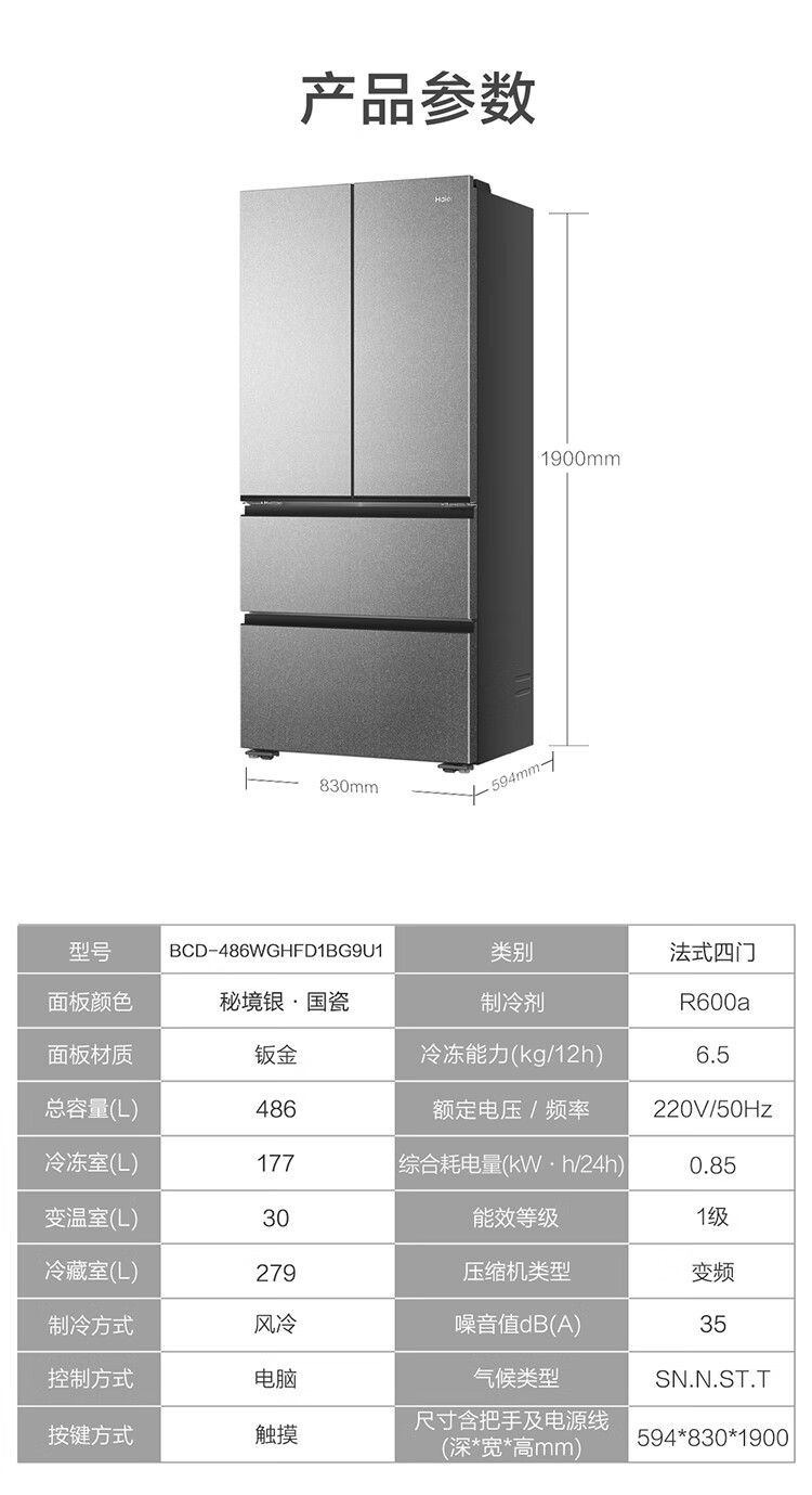 海尔冰箱486升594mm超薄嵌入式法式四开门多门一级能效风冷无霜全空间保鲜大容量底部散热家用家电冰箱 486L+EPP超净系统+阻氧干湿分储+联网智控