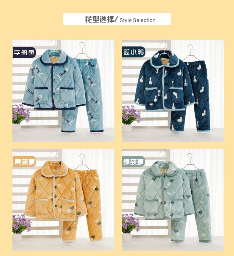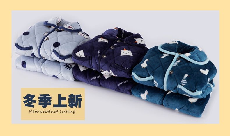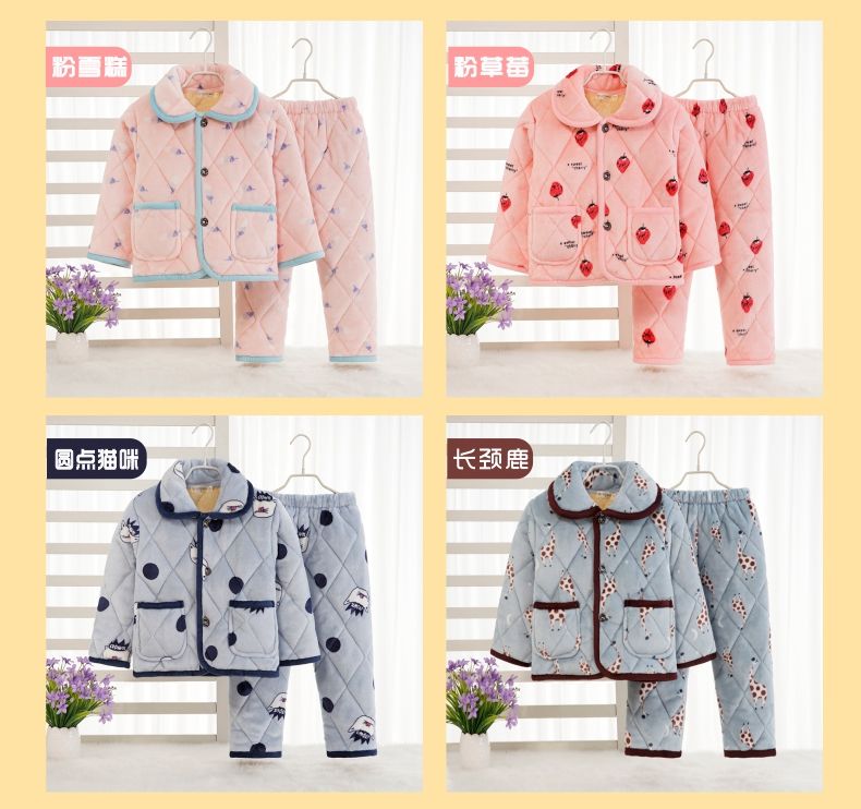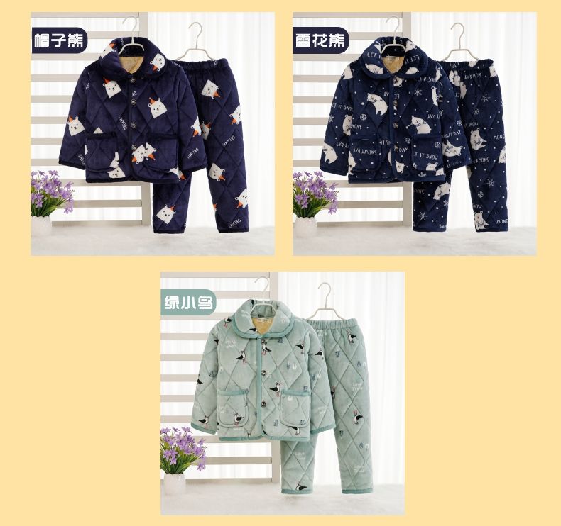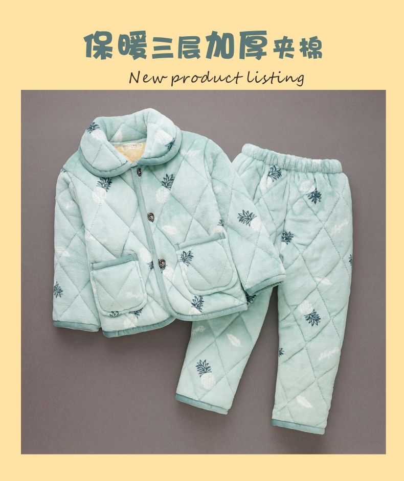 秋冬季儿童法兰绒睡衣男童加厚款三层夹棉女童珊瑚绒宝宝小孩套装