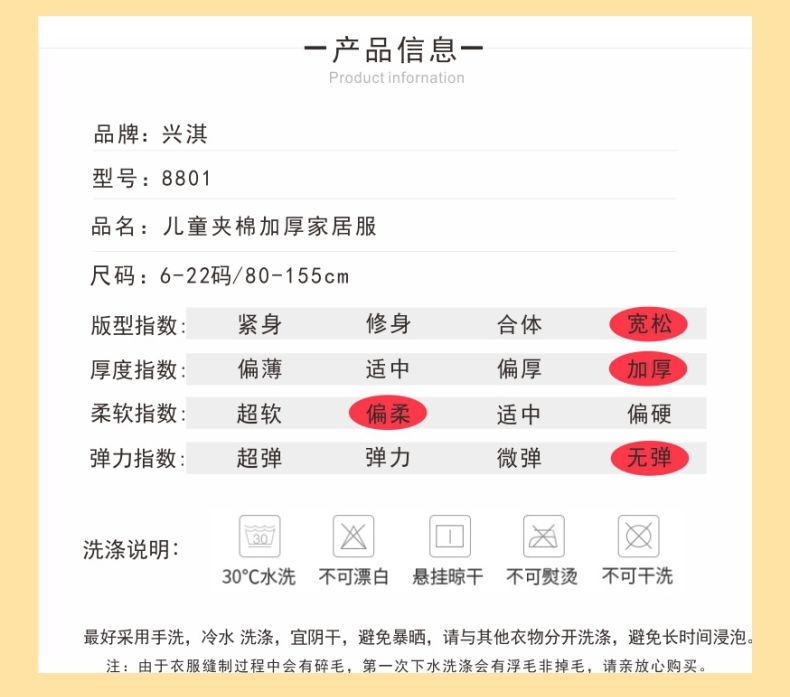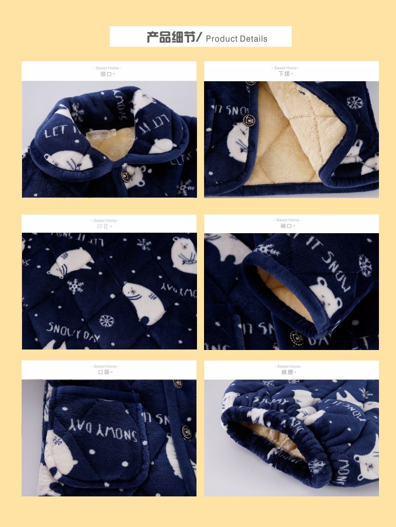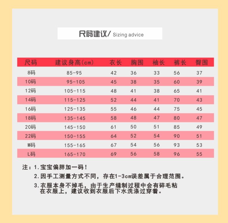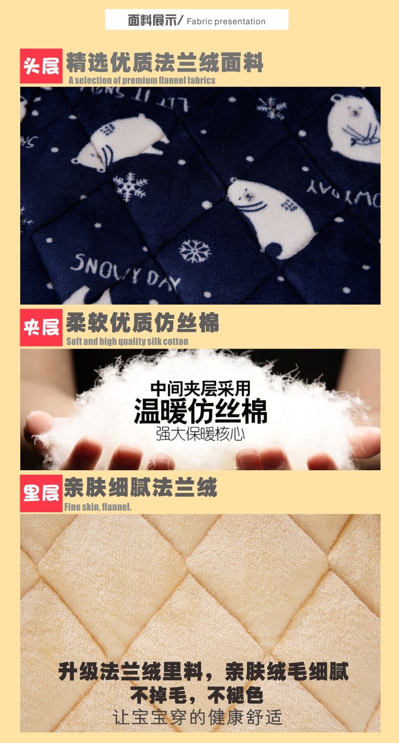 三层夹棉睡衣,面料采用法兰绒;里料法兰绒;夹层优质仿丝棉面料制作,成份100%聚酯纤维。穿着轻柔、保暖、透气。采用环保印染,可以放心选购。不褪色、不掉毛、不缩水、不起球、品质保证。{码数参照尺码表,宝宝偏胖请拍大一码}