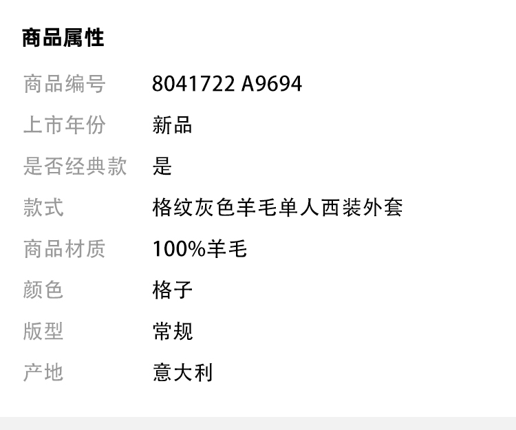 BURBERRY 博柏利 深炭灰格子 女士西服 格子 8041722 A9694