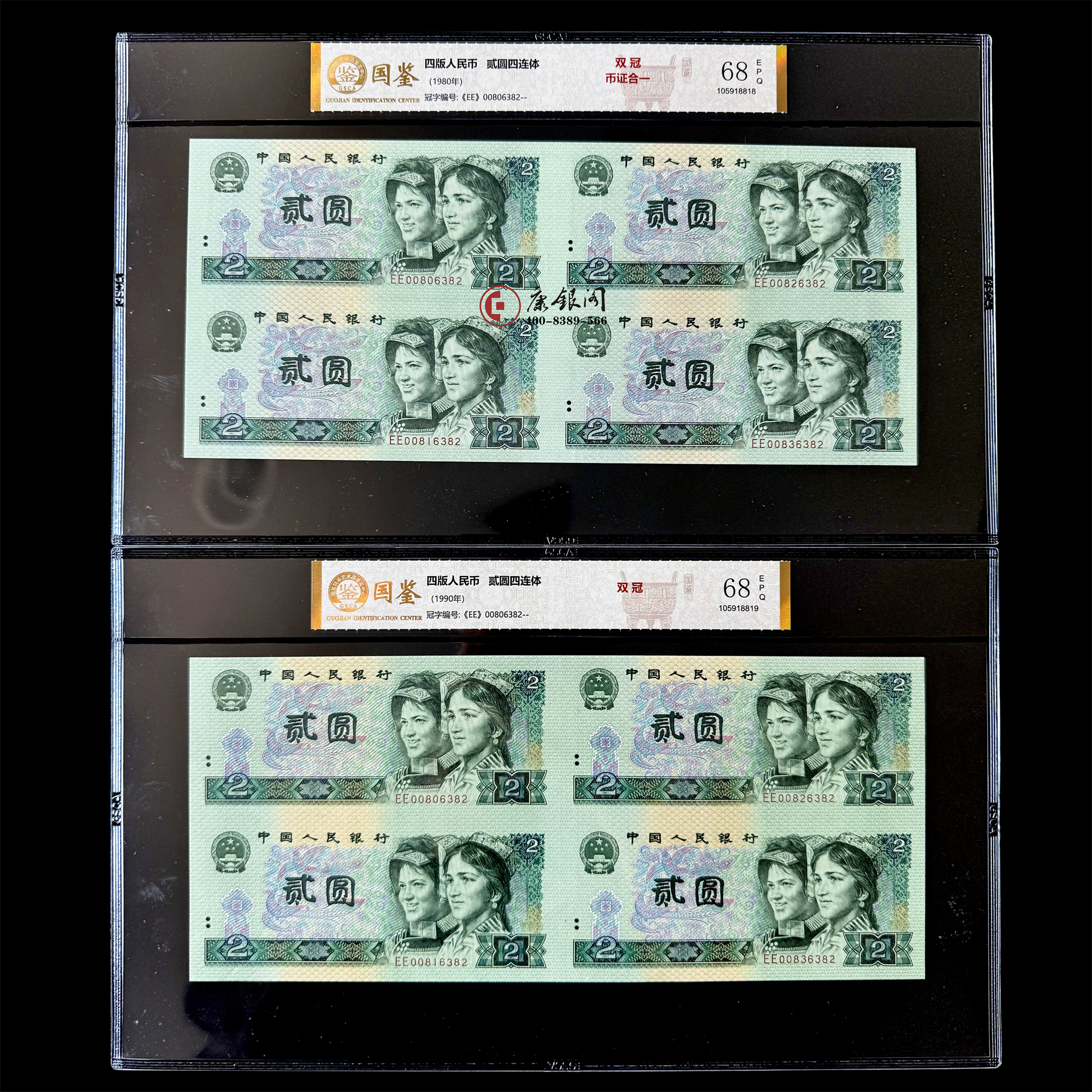 【藏品内容】1980年2元四连体、1990年2元四连体各一张。