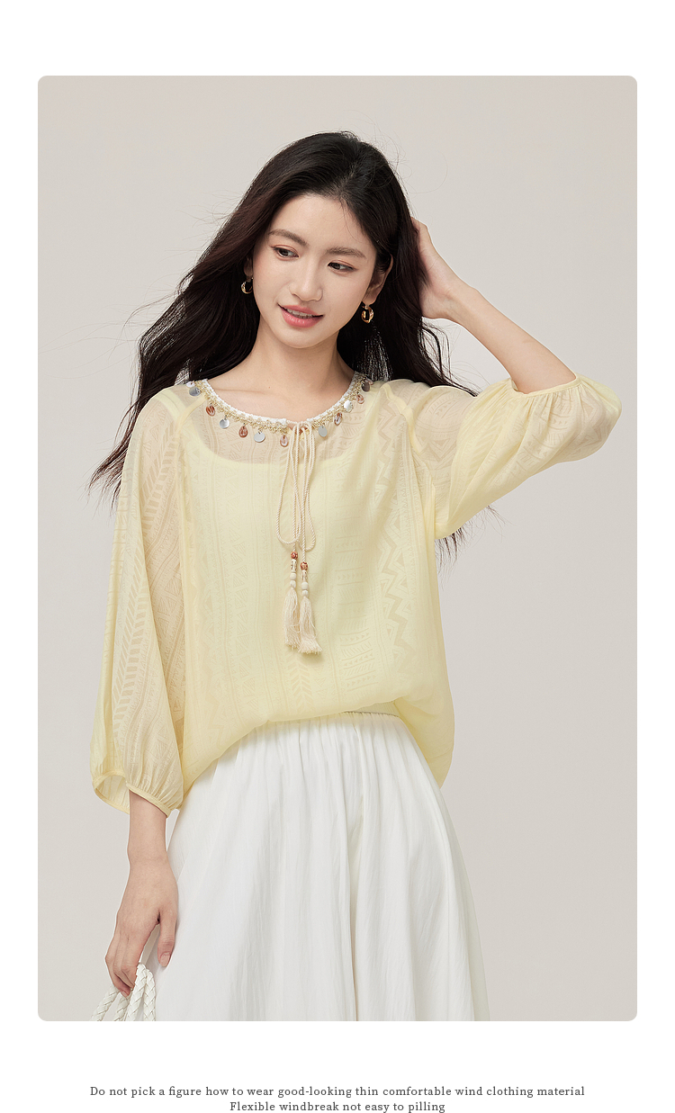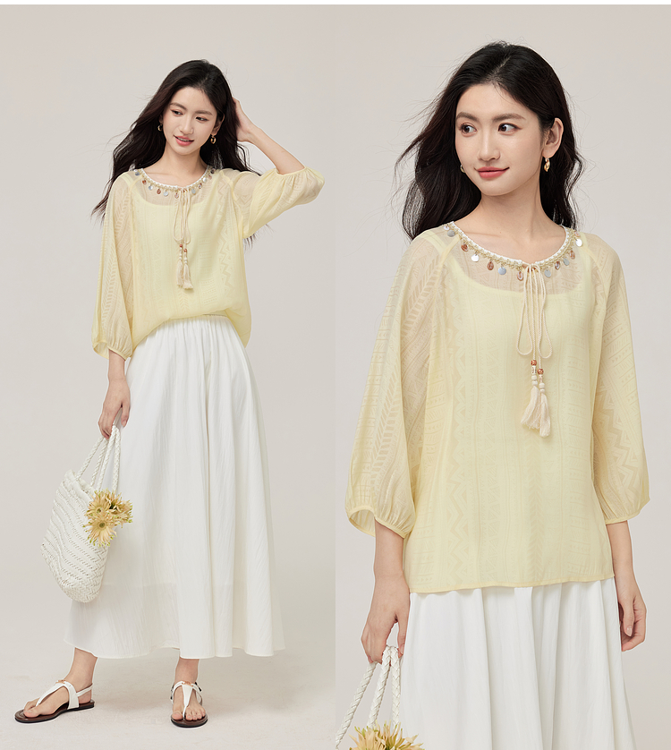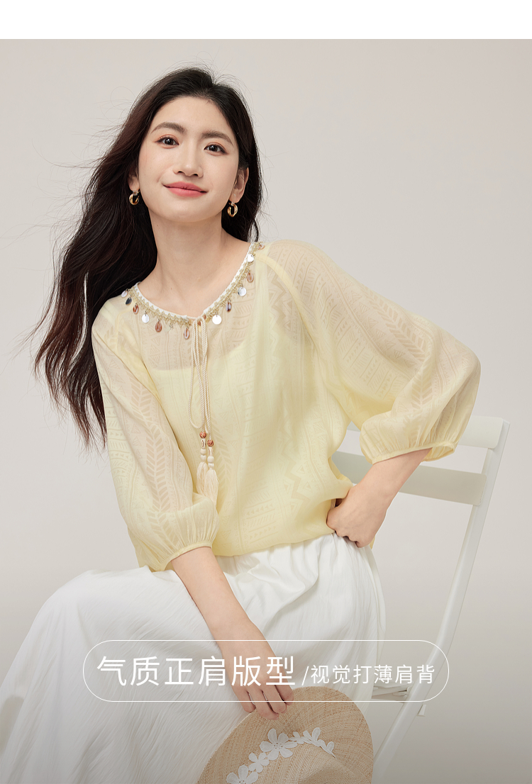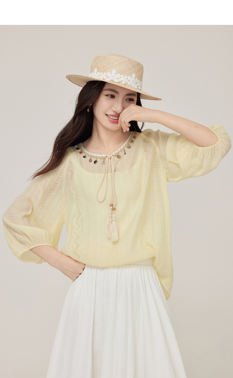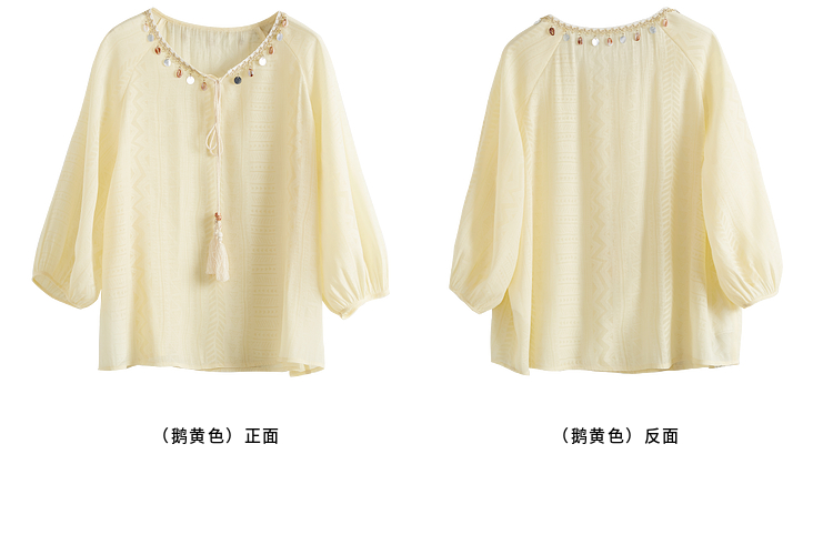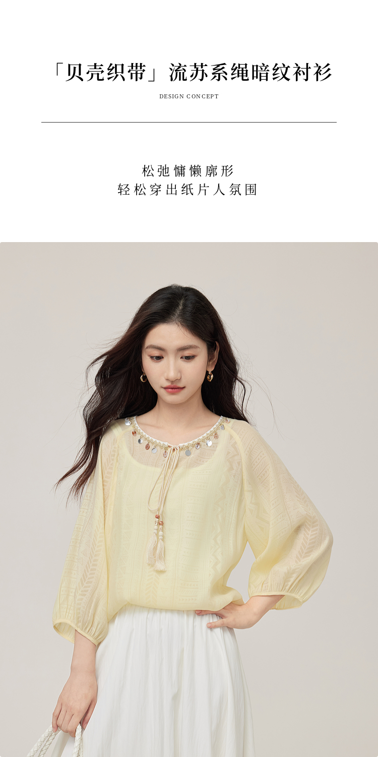 【08/06新品】熙世界出游度假风贝壳装饰七分袖衬衫女2025初秋新款圆领宽松上衣
