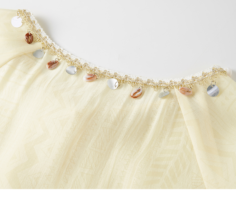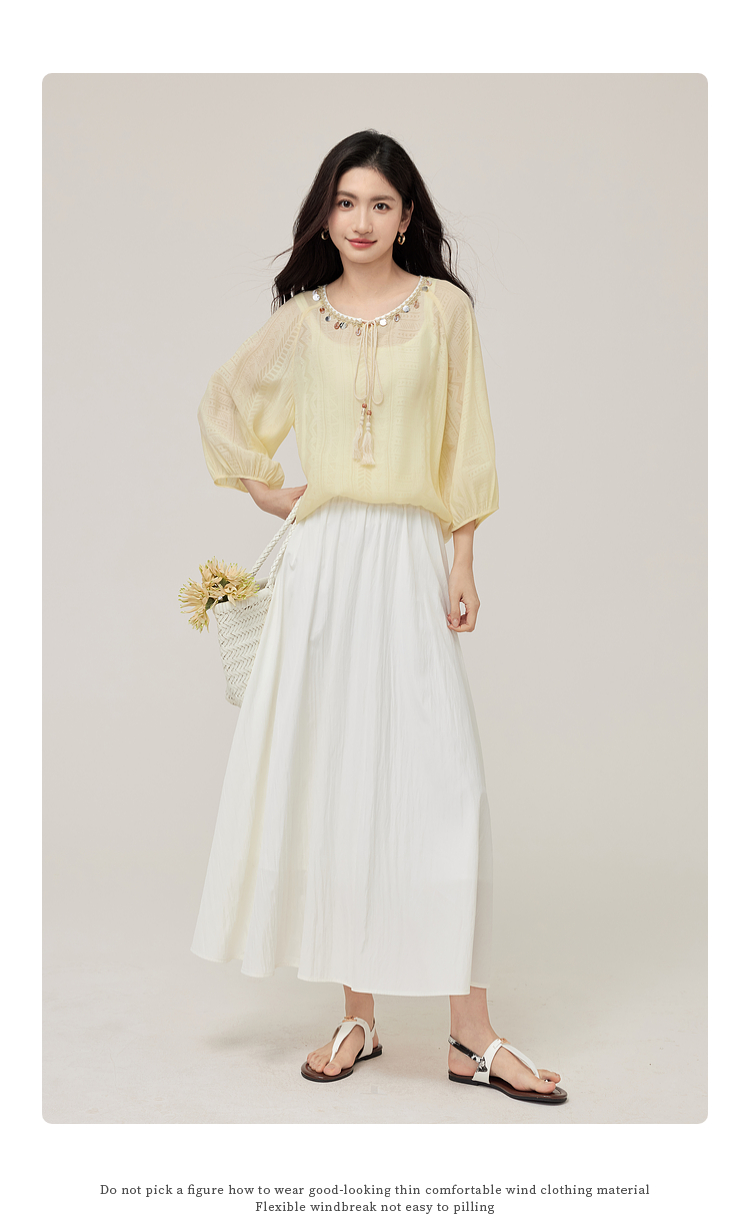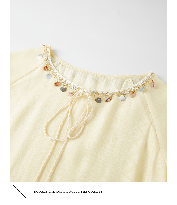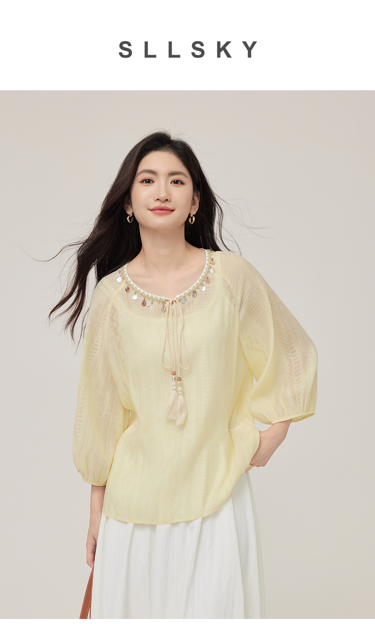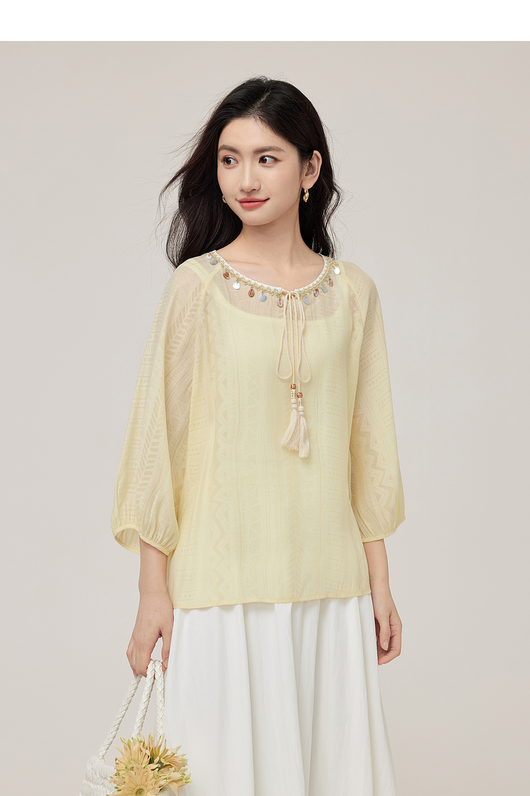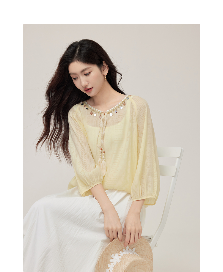 【08/06新品】熙世界出游度假风贝壳装饰七分袖衬衫女2025初秋新款圆领宽松上衣