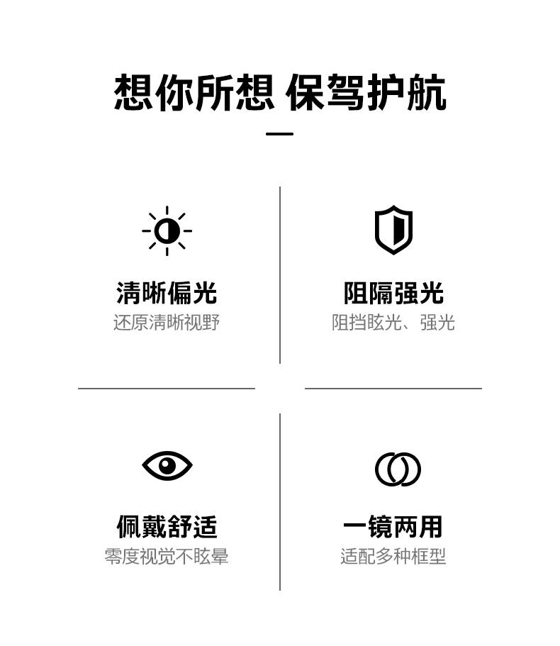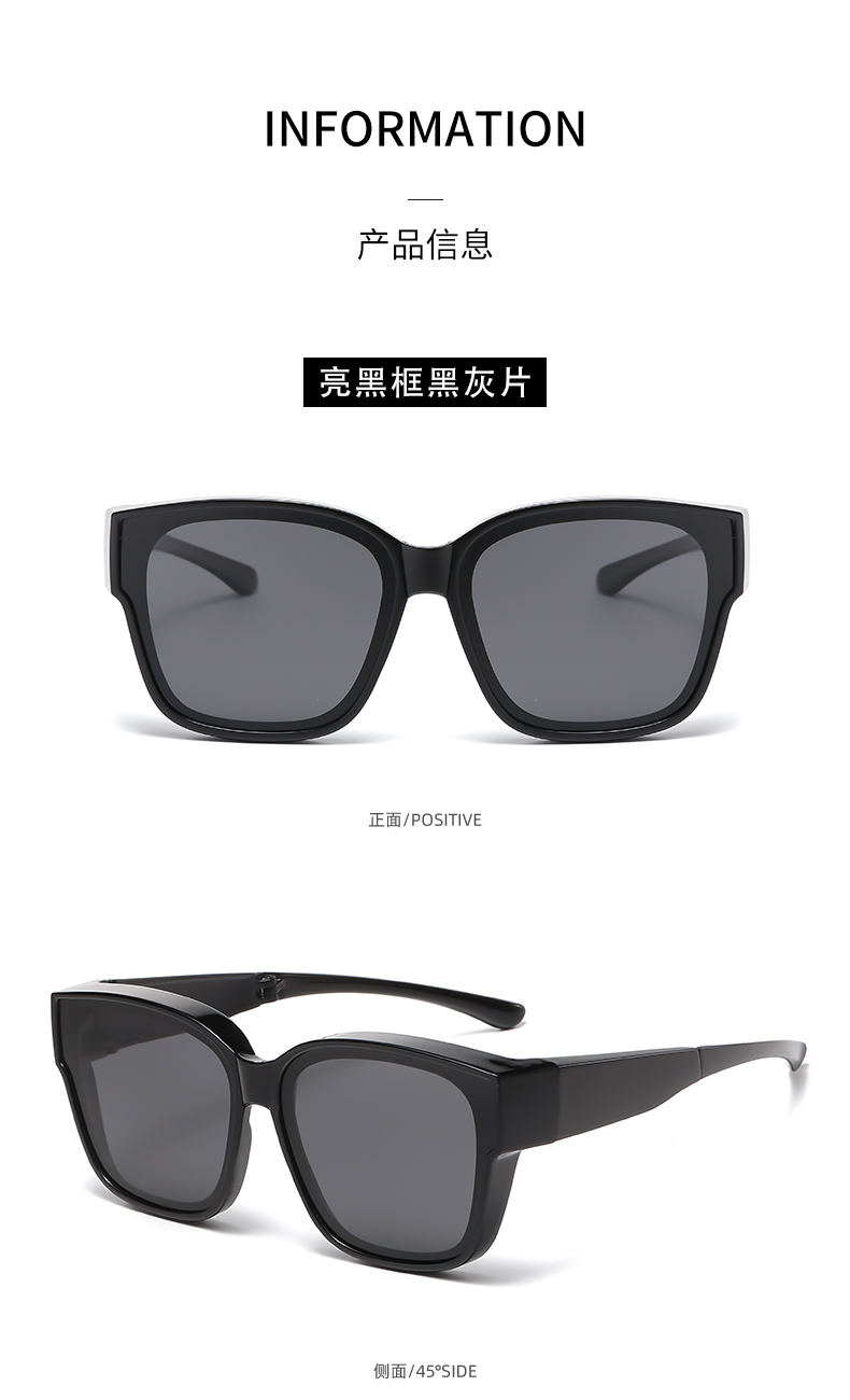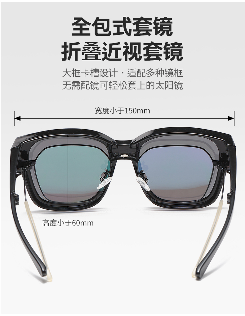2、偏光套镜适合各类人群,近视眼镜佩戴者可叠在近视镜架上,无需要配镜,匹配多种近视镜架,近视镜镜随意切换,一镜开启,时尚又便捷,无近视人群可直接佩戴。
