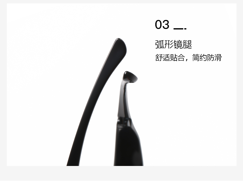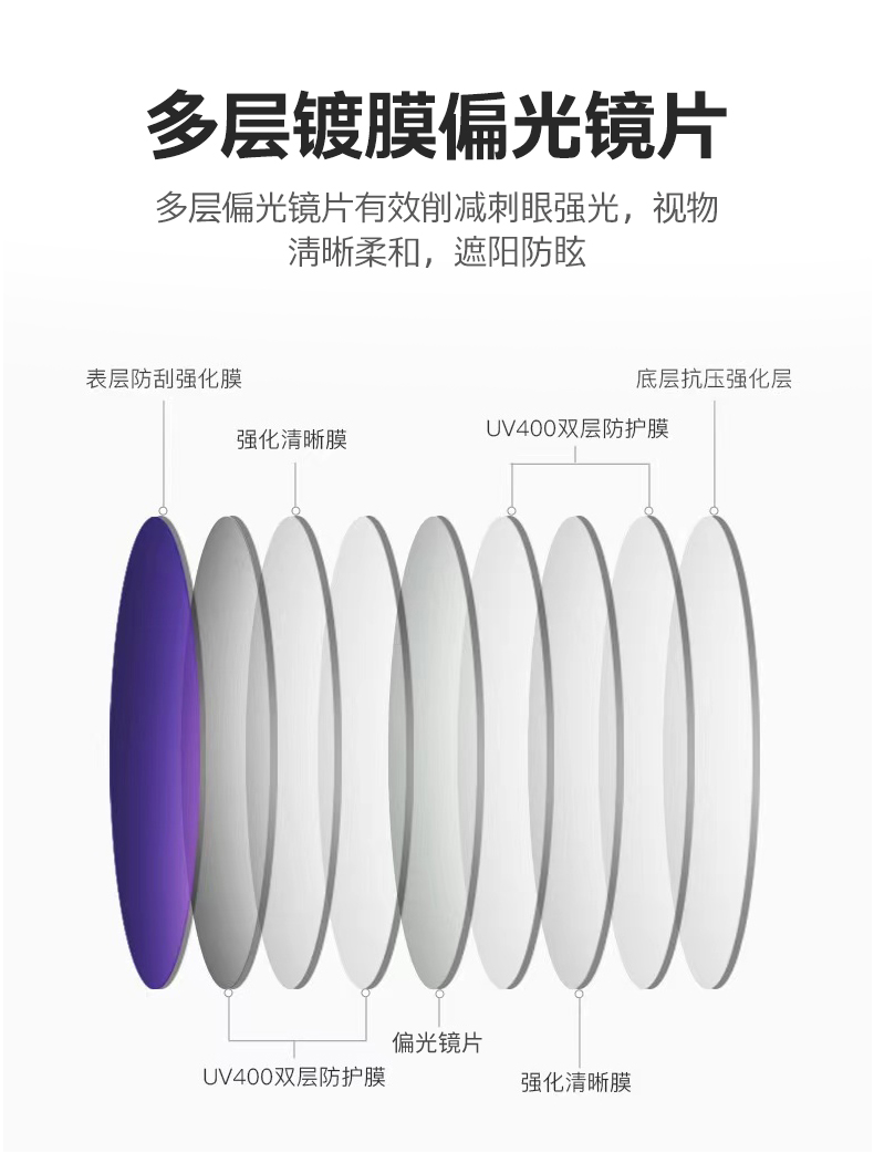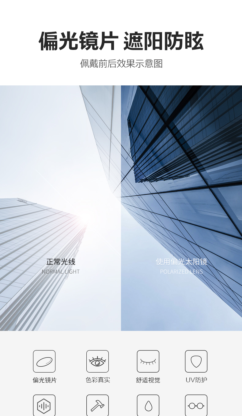 3、超轻TR镜框,轻盈无感,镜腿可根据脸型自动微调,佩戴不变形。高清偏光镜片,阻隔炫光,防晒防紫外线 ,给眼睛多一层保护。